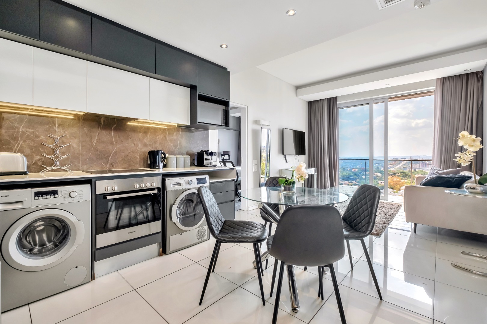 The stylish, light-filled living space features glossy floor tiles and a seamless flow between the lounge and dining areas, opening out onto a private balcony with stunning, panoramic views. The open-plan kitchen comes fully equipped with premium appliances.
