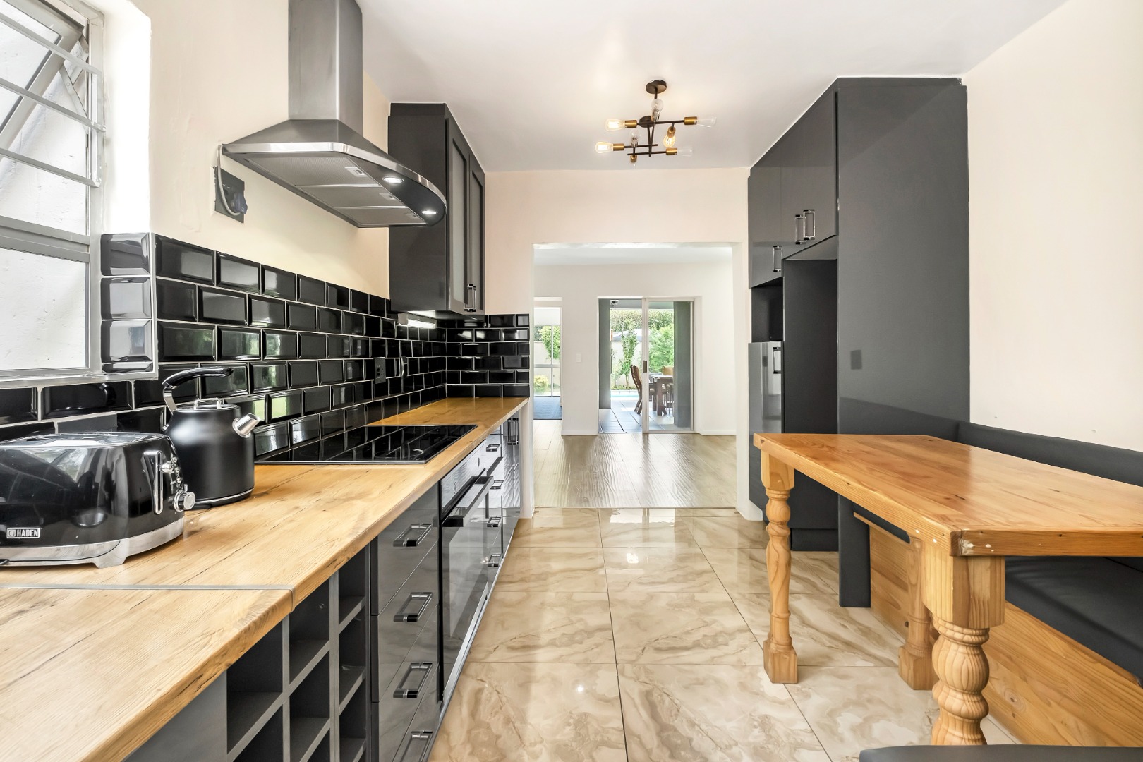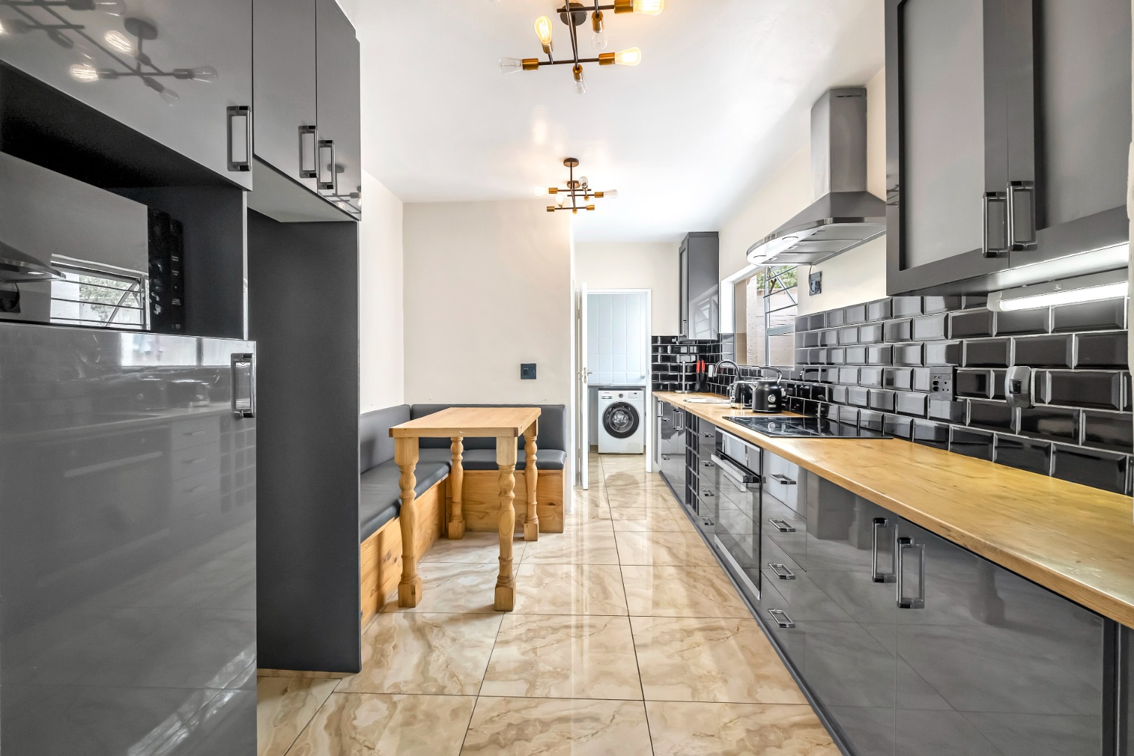 The galley kitchen has been remodeled with high gloss cabinets, stylish subway tiles and cosy breakfast nook. It enjoys a walk-in pantry and a separate scullery with space for three undercounter appliances.