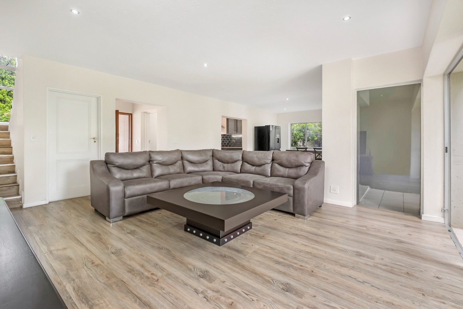A large wooden swivel door leads you into the open plan living area of this comfortable home where a large lounge, adjoining dining room and air-conditioned sunroom / gym, with provision for a fireplace, create the perfect space for relaxed entertaining.