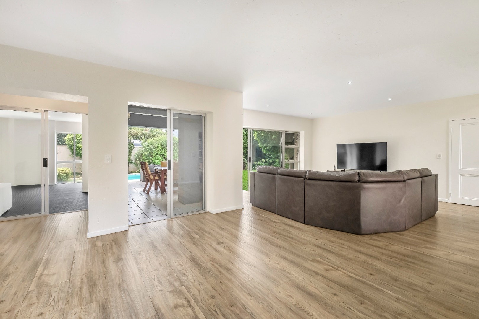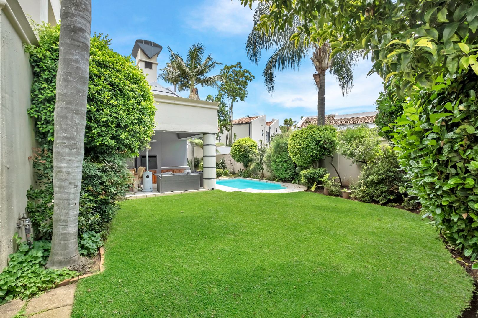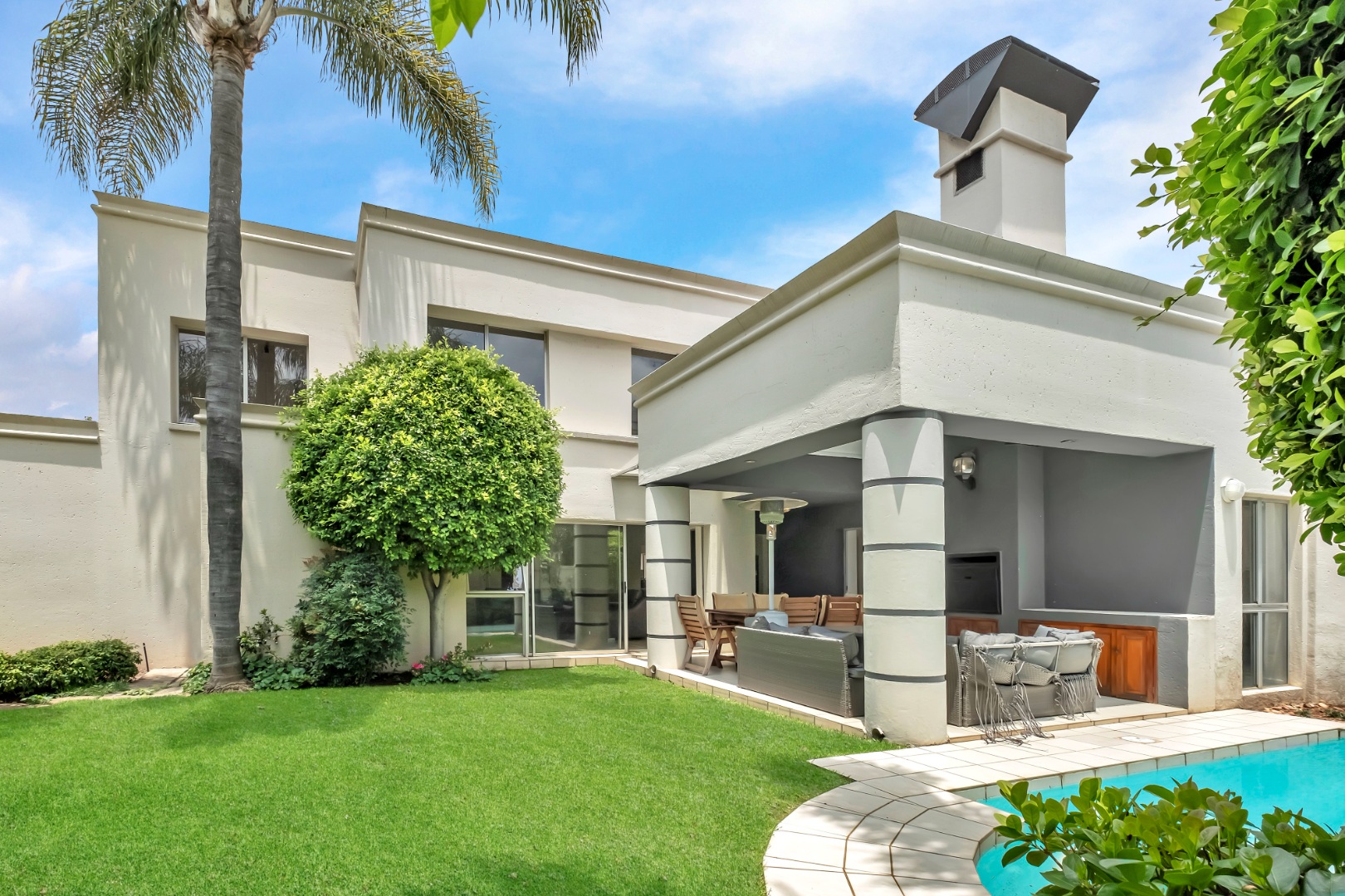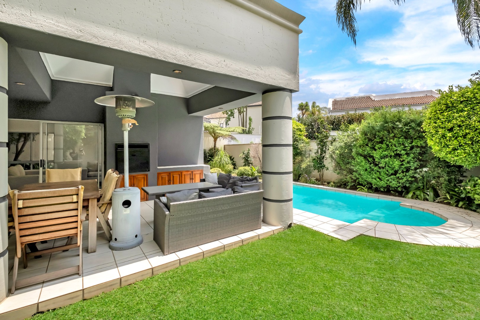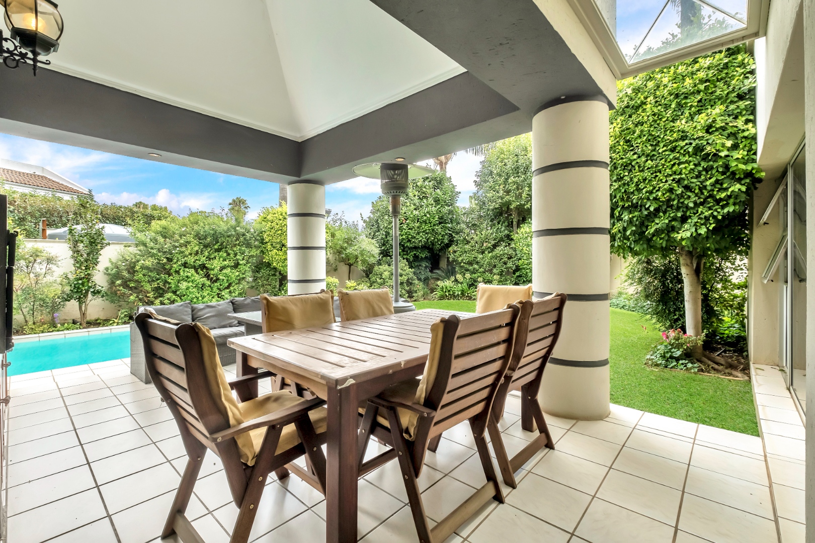 Sliding doors open to a spacious covered patio with skylight and built-in braai, overlooking a gorgeous private garden and sparkling swimming pool.