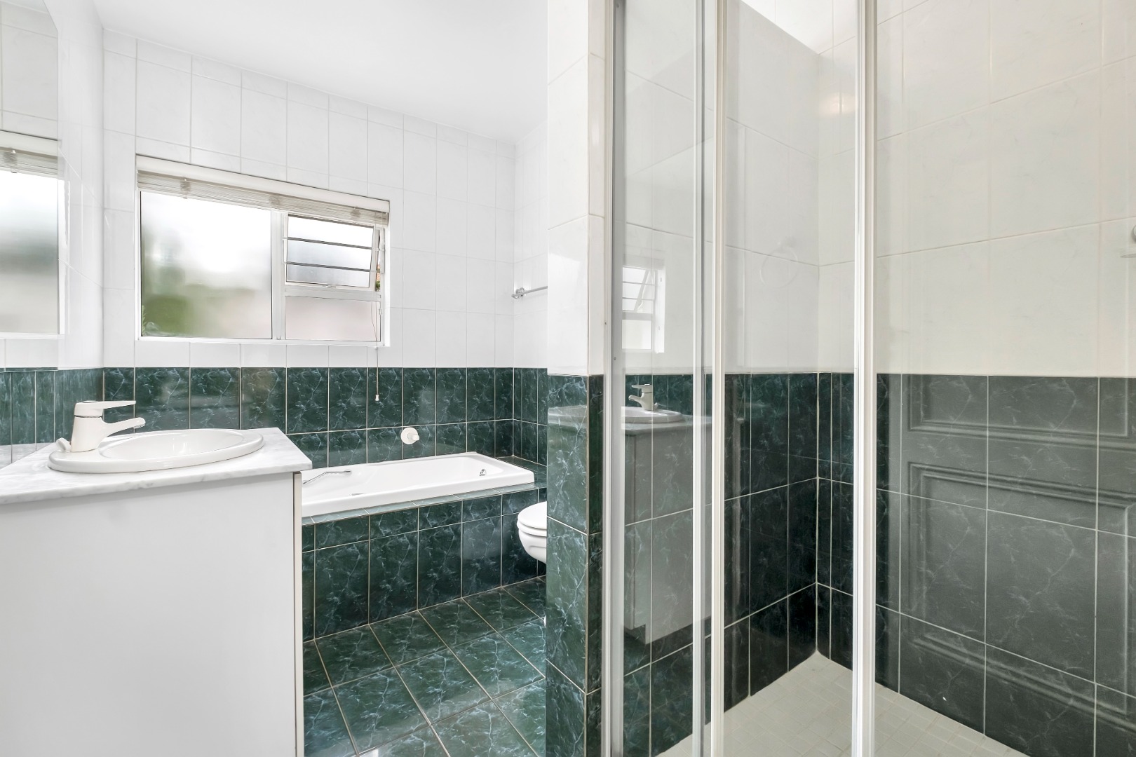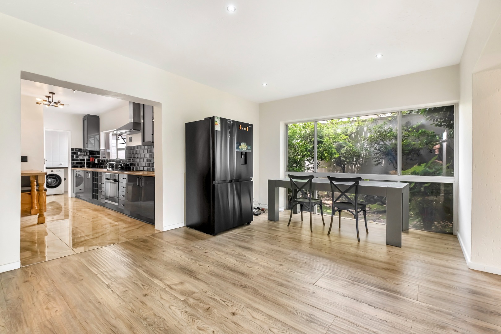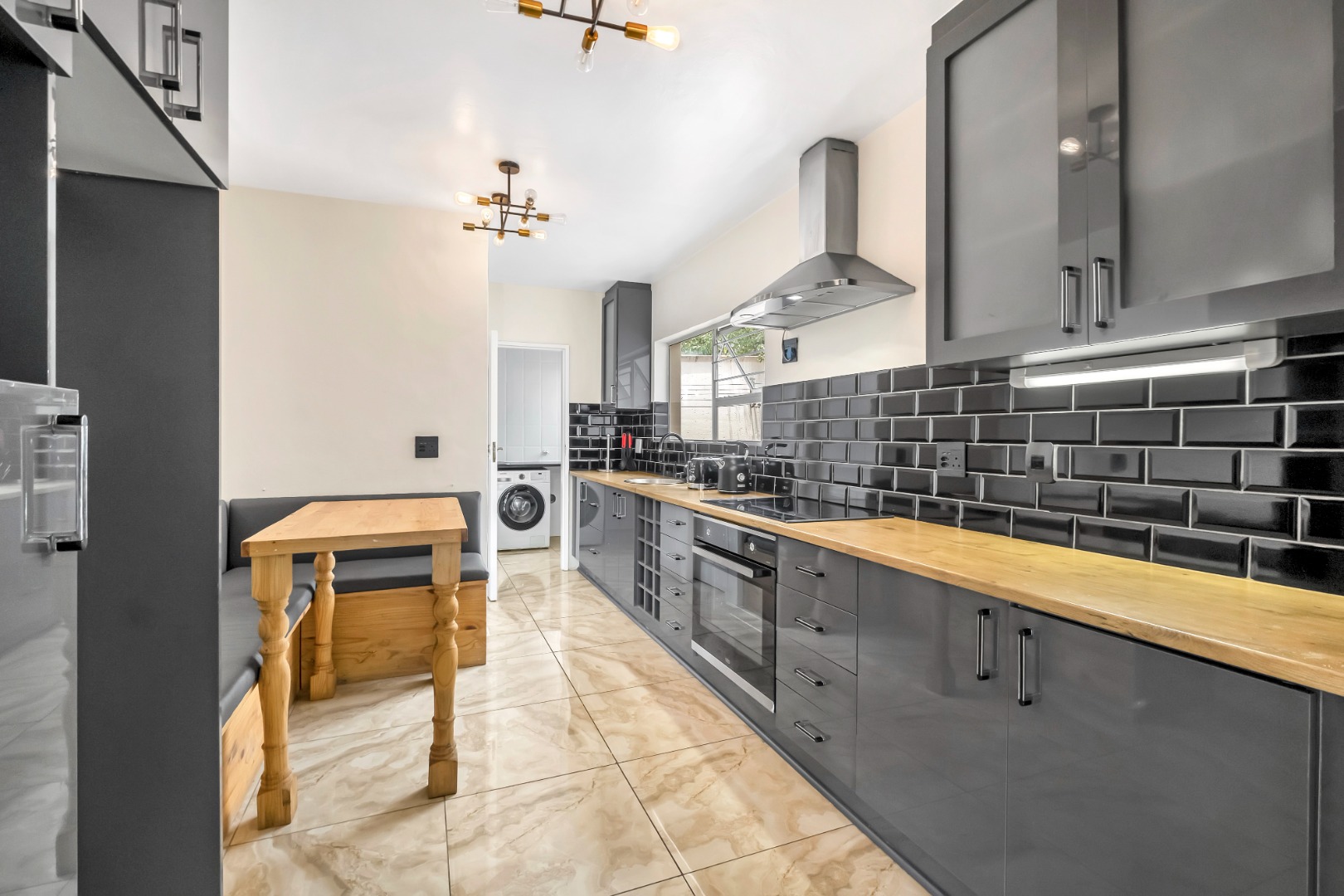 The galley kitchen has been remodeled with high gloss cabinets, stylish subway tiles and cosy breakfast nook. It enjoys a walk-in pantry and a separate scullery with space for three undercounter appliances.
