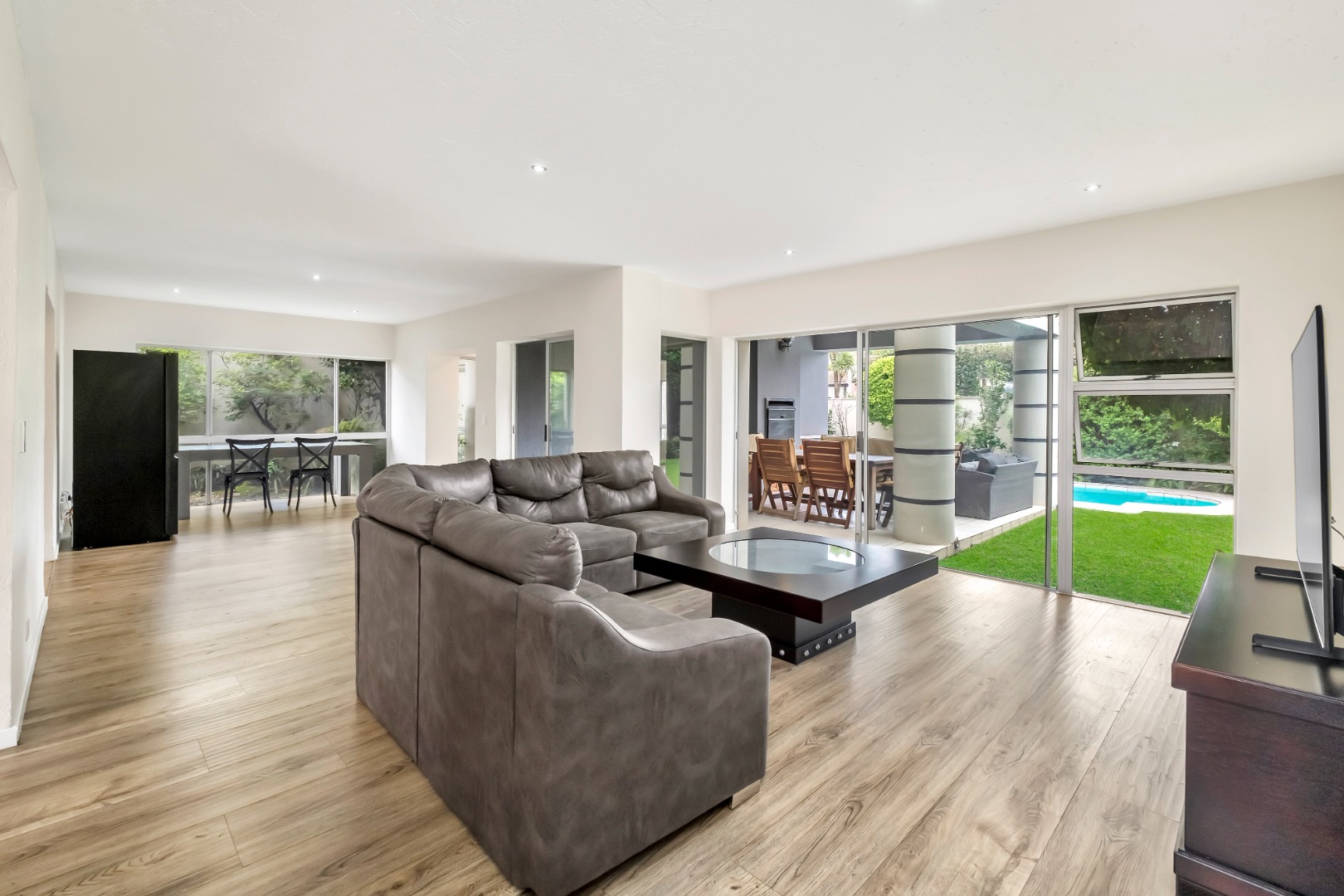 Sliding doors open to a spacious covered patio with skylight and built-in braai, overlooking a gorgeous private garden and sparkling swimming pool.