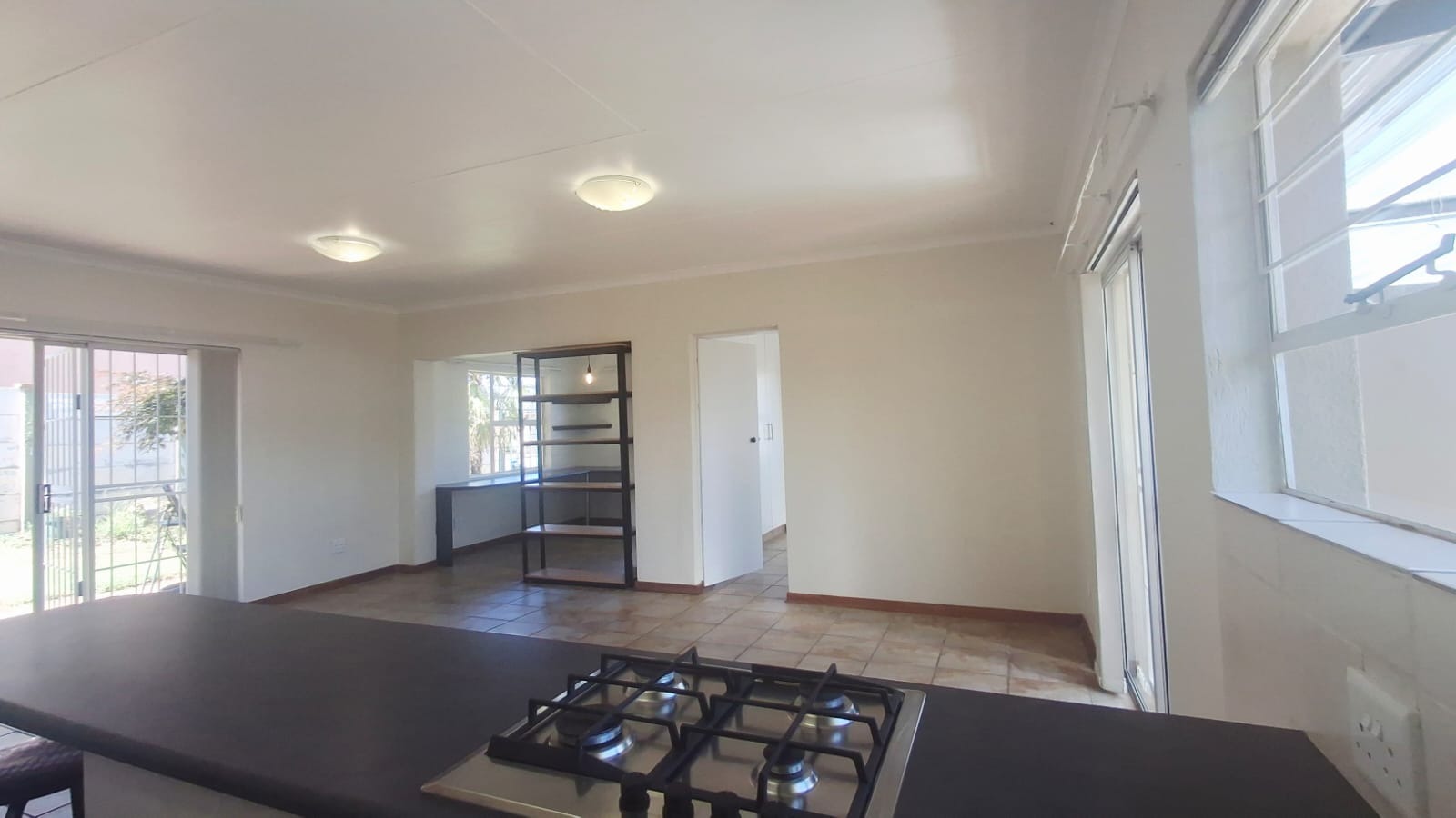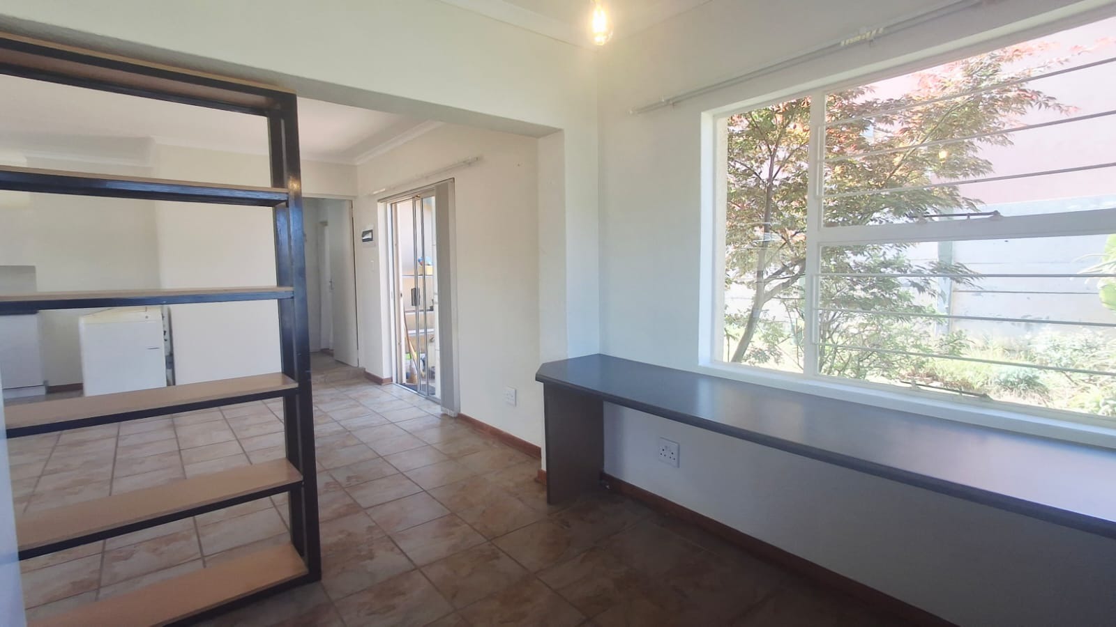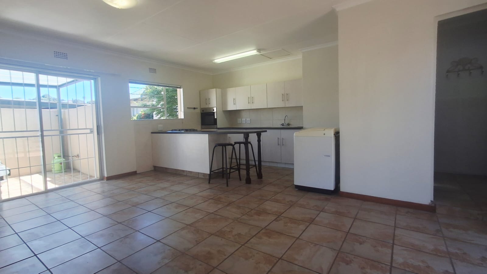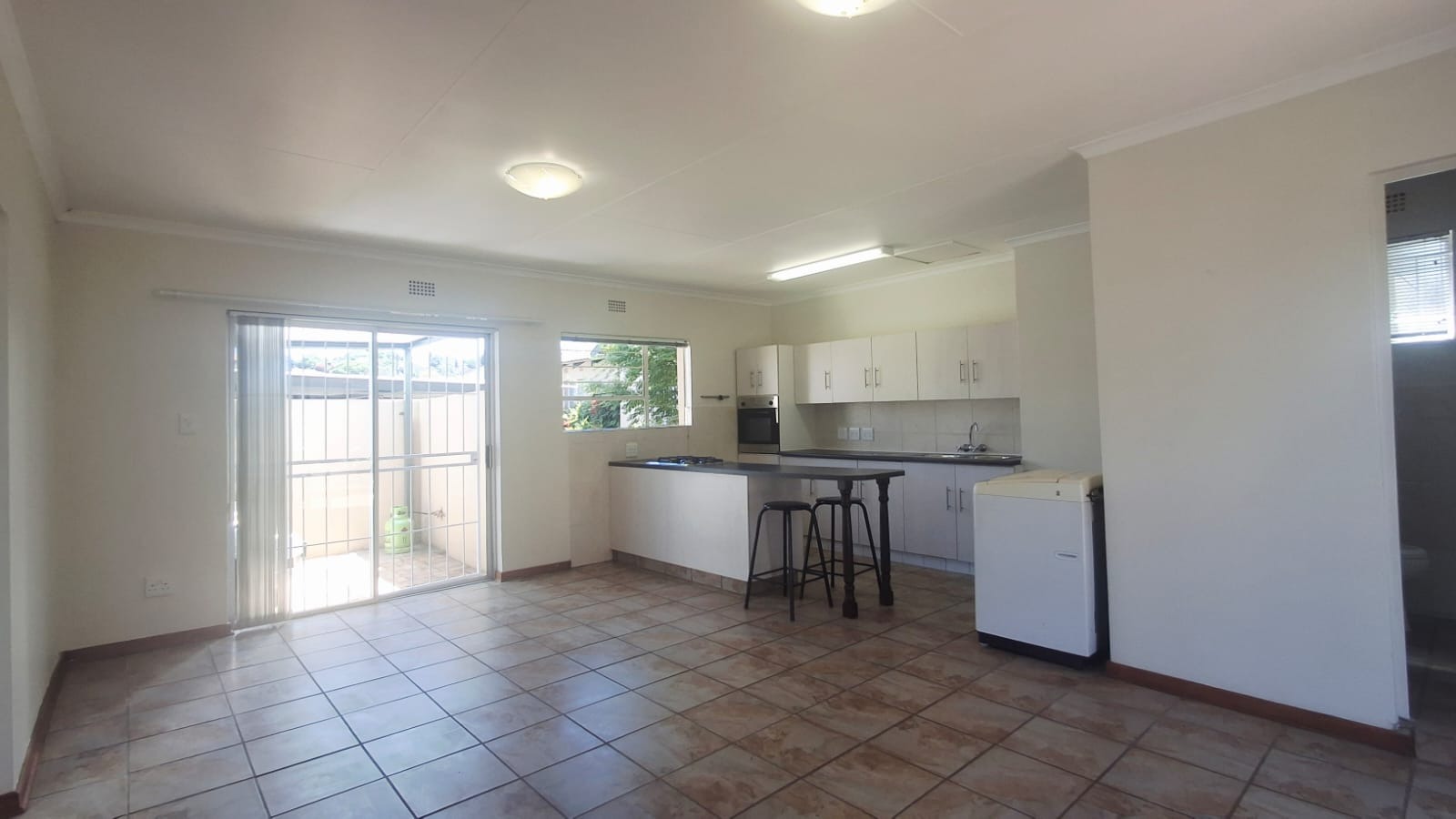 Tiled flooring throughout makes for easy cleaning, and big sliding doors let in loads of natural light, leading out to a neat outdoor space.