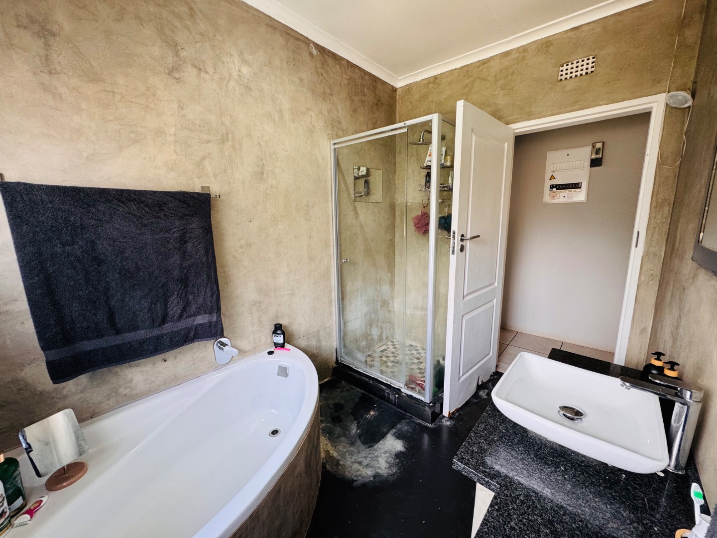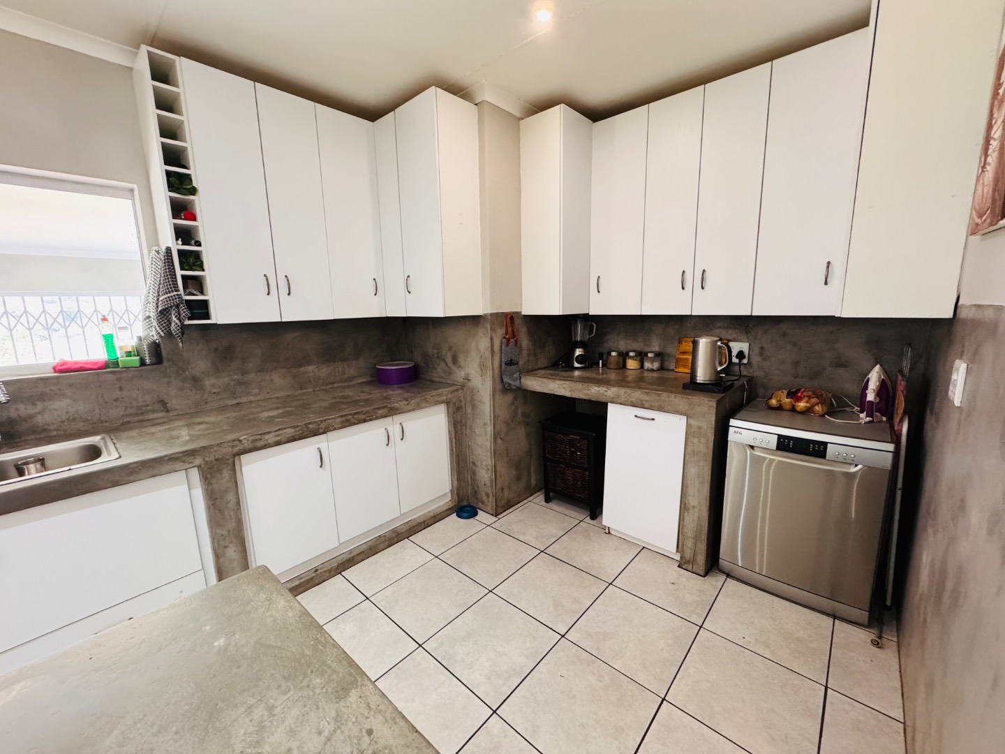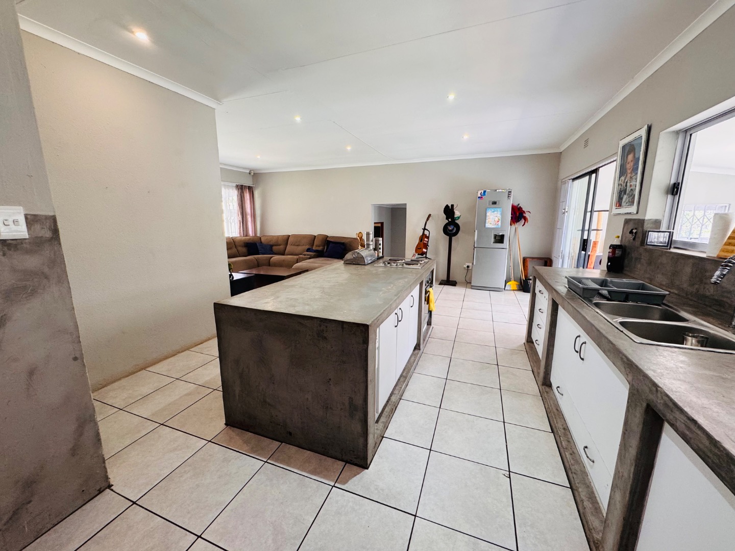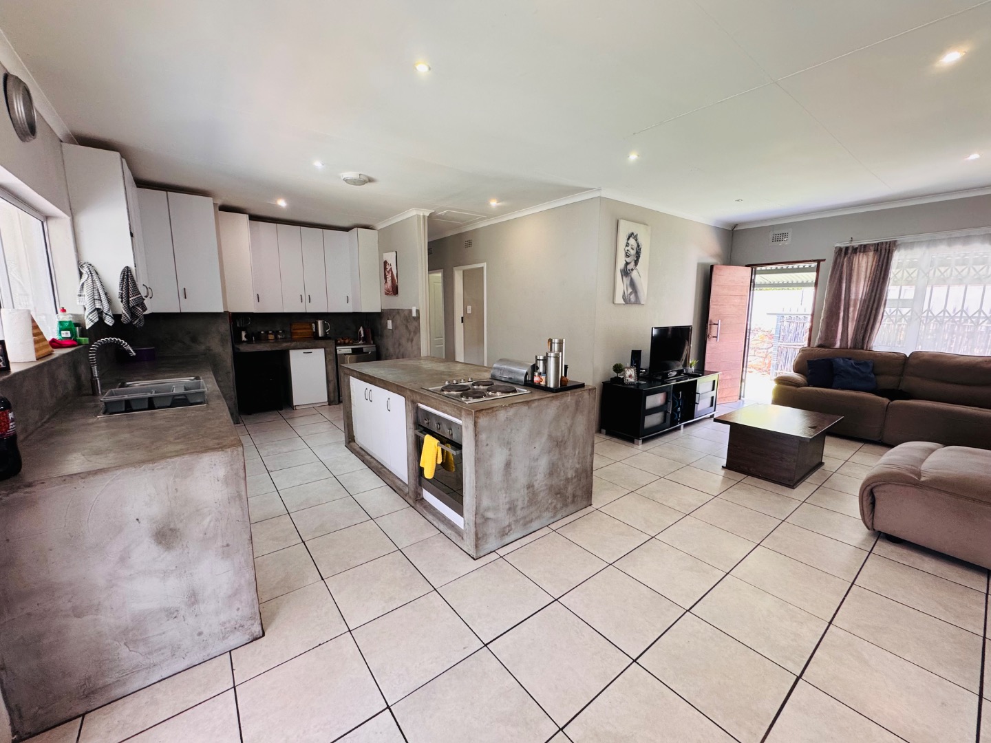 This inviting 4-bedroom, 2-bathroom residence, including one ensuite, is available for rent in the suburban area of Kenmare, situated close to Helderkruin High School. The home features an open-plan layout, seamlessly connecting the modern kitchen to the spacious living and dining areas. The kitchen boasts distinctive concrete countertops, ample white cabinetry, a central island with an integrated hob/oven, all complemented by durable tiled flooring and recessed lighting. Sliding doors from the living space provide easy access to the enclosed patio area.
