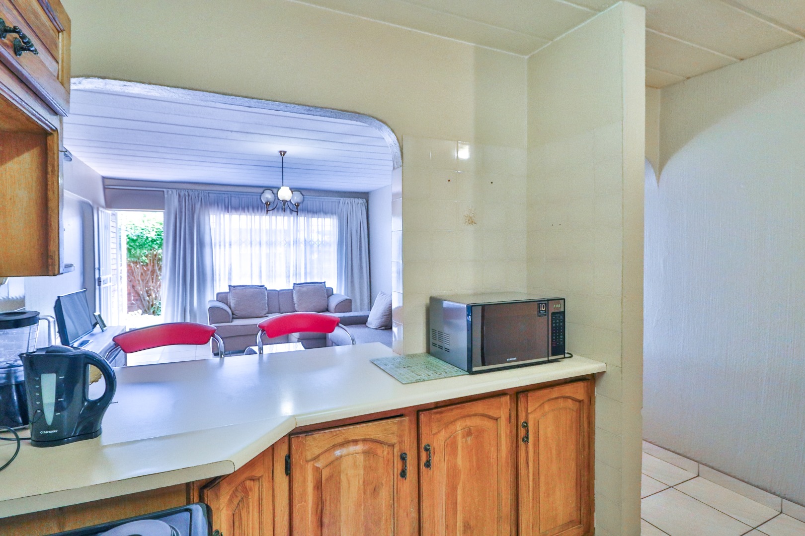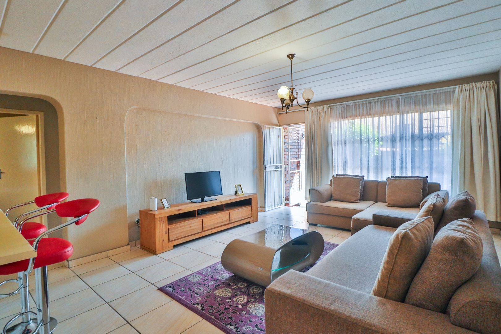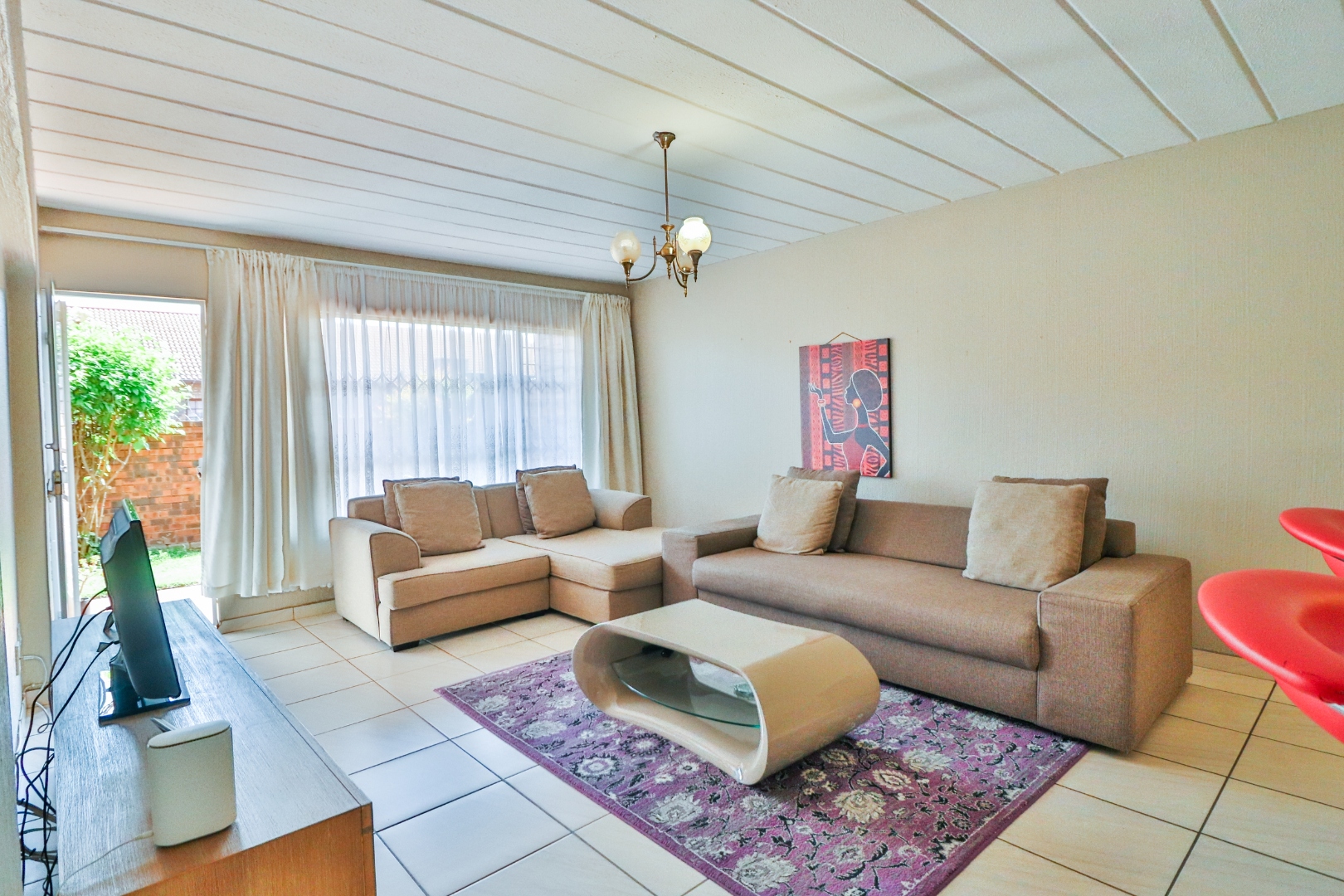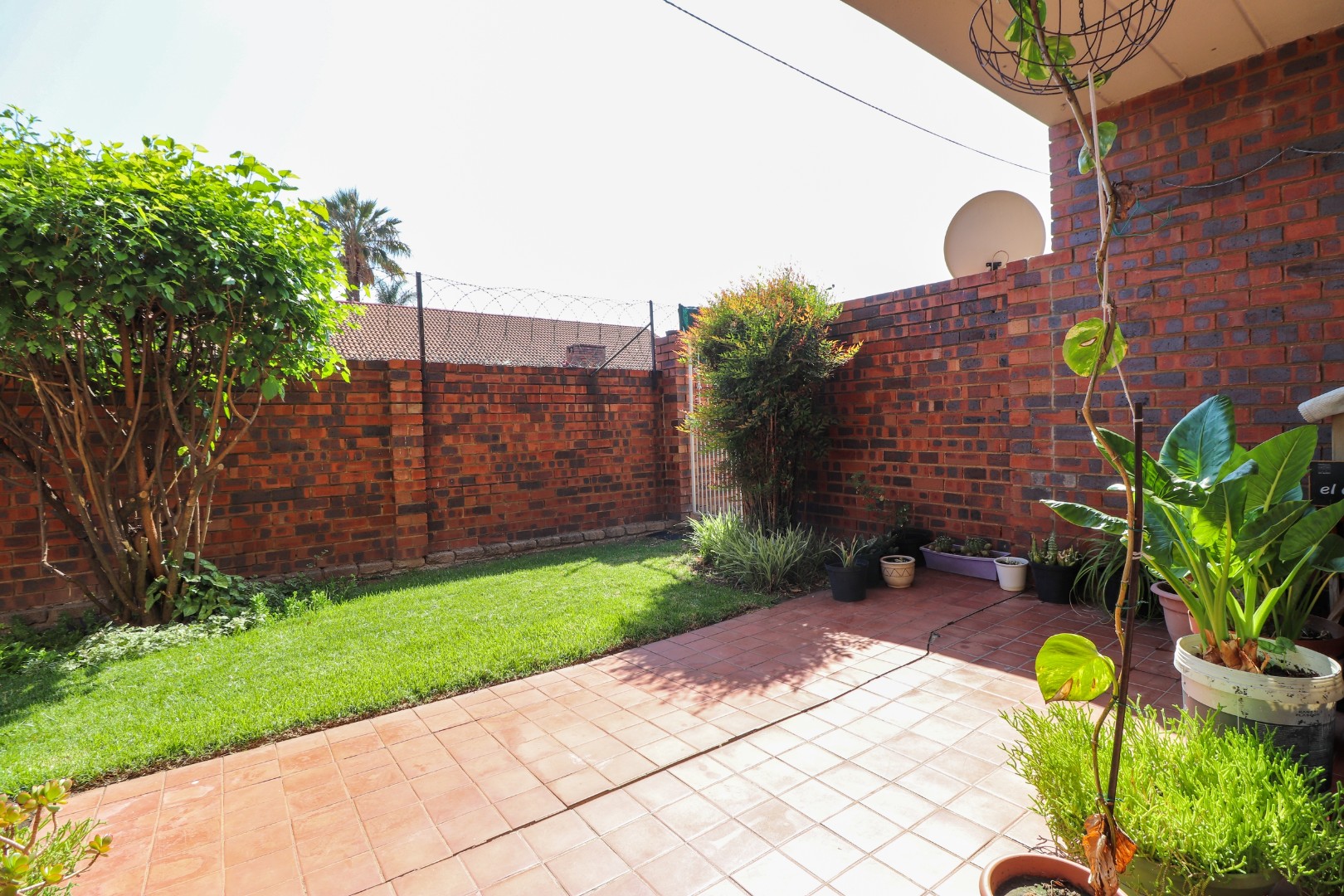 Lounge will fit 6-seater dining table and corner couch. Covered patio opens to own walled garden.