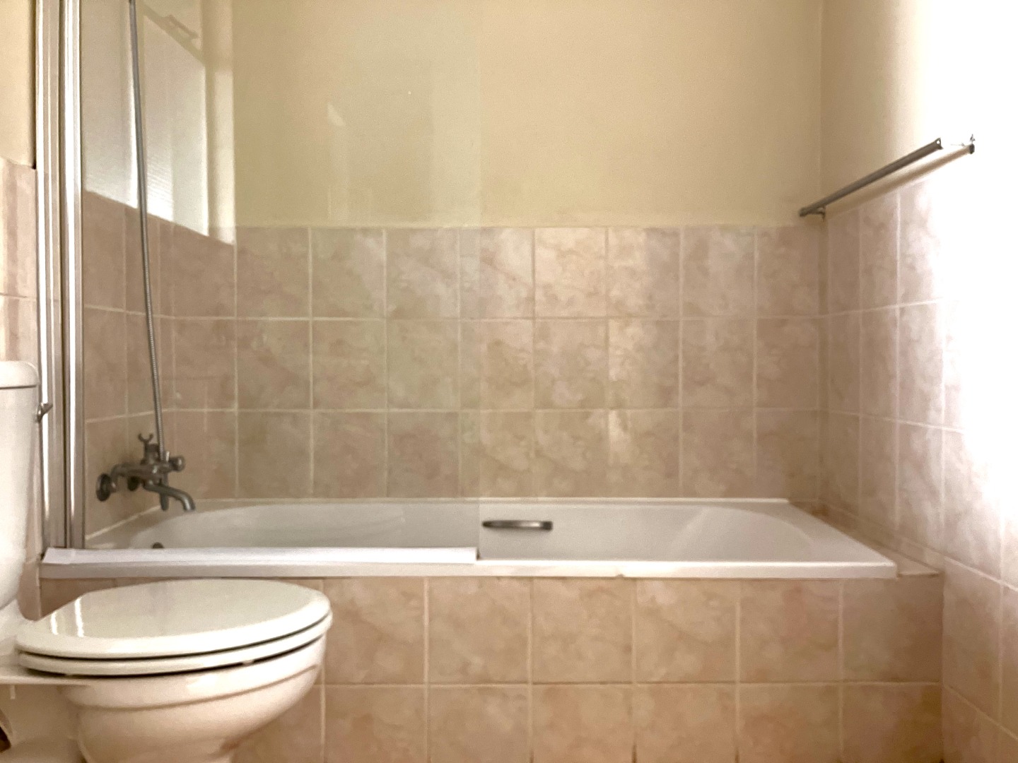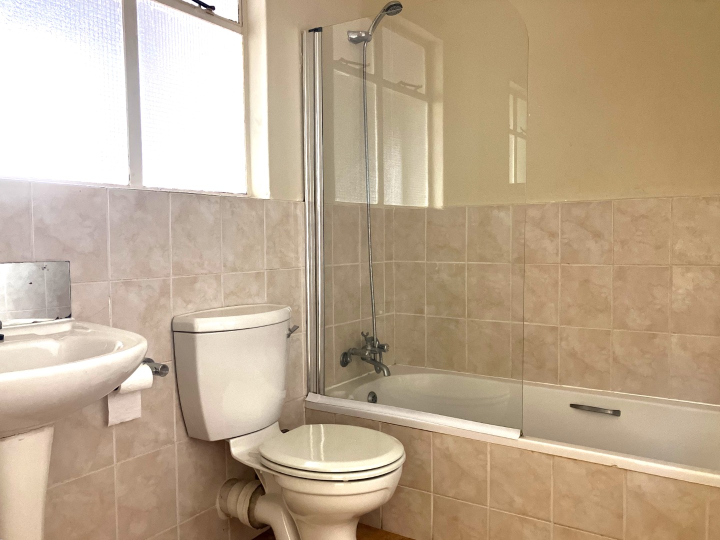 The bedroom is well-sized and offers a private, relaxing retreat with built-in cupboard space. The bathroom is neat and functional, fitted with a bath, overhead shower, basin, and toilet.