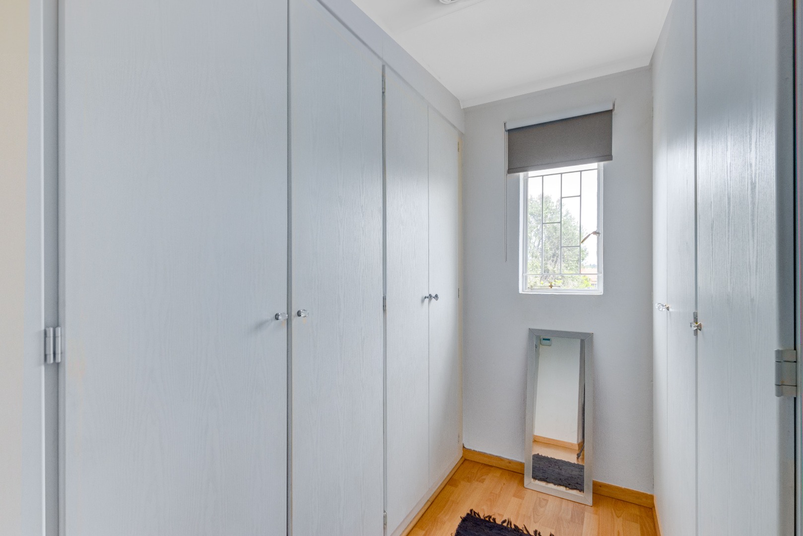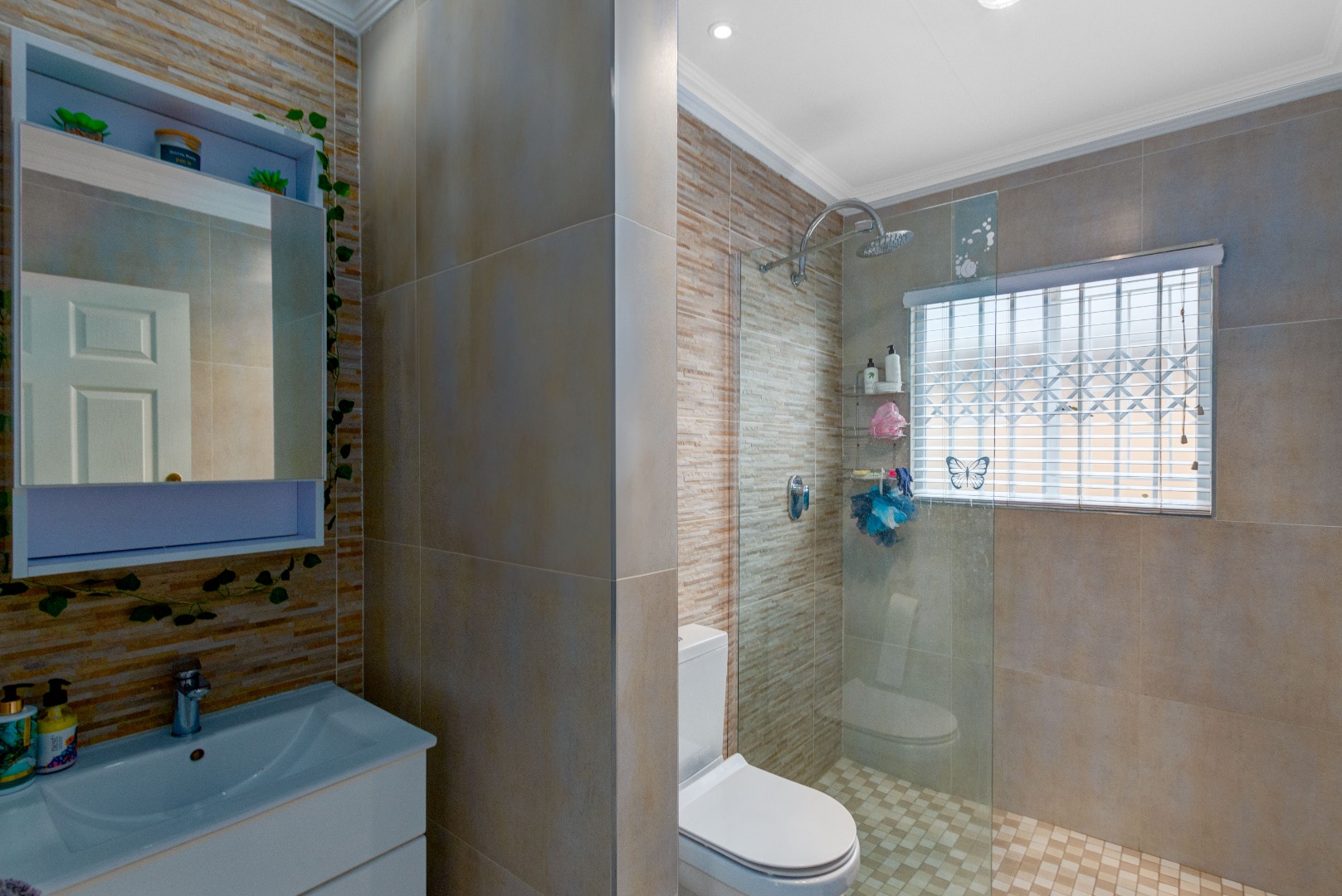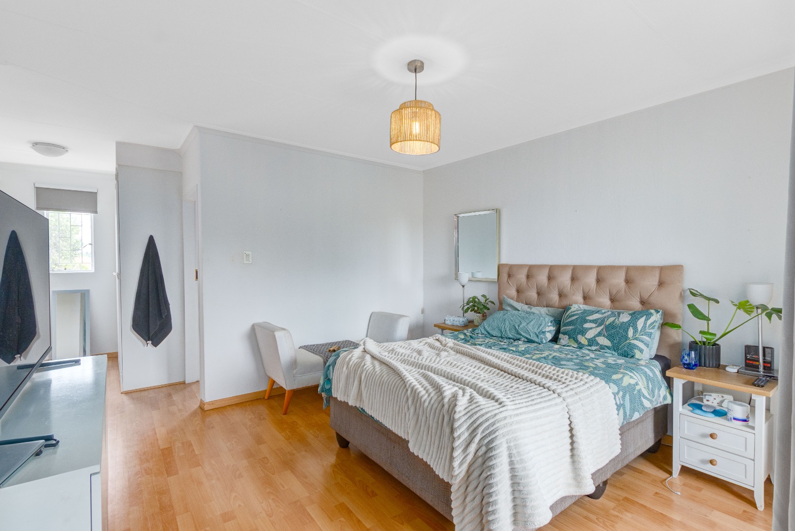Downstairs, you'll find two spacious bedrooms, both offering plenty of cupboard space, along with a neat and elegant bathroom fitted with a toilet, basin, and shower.