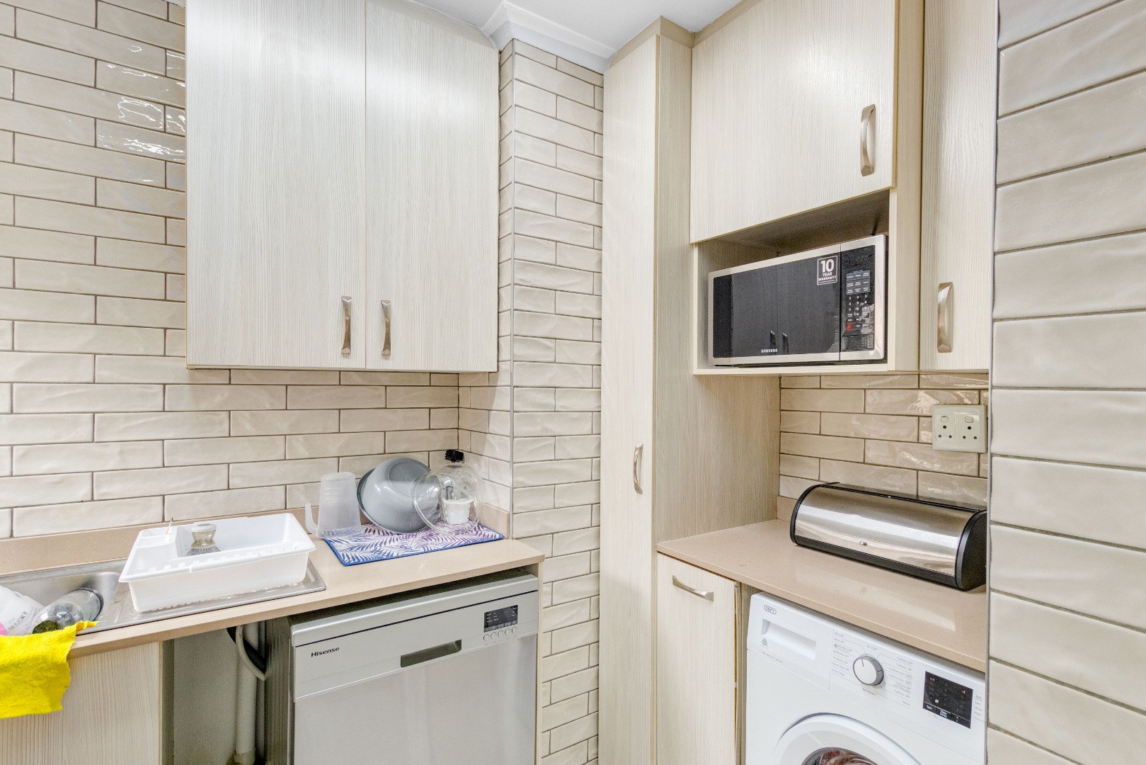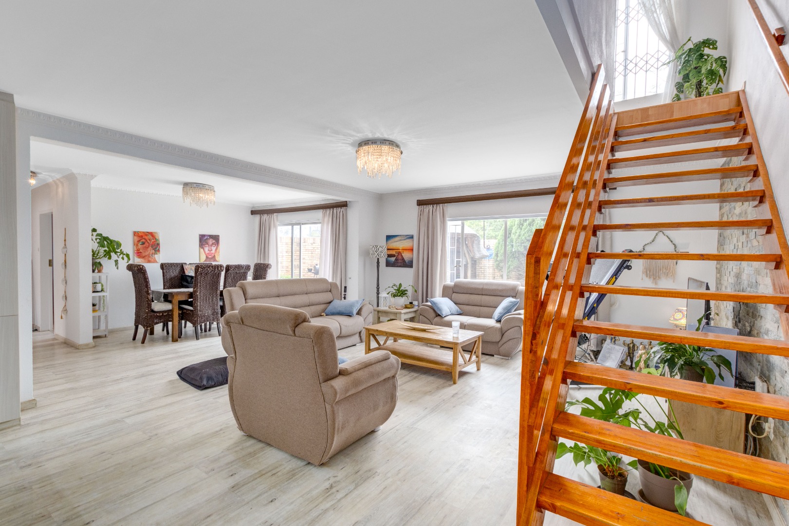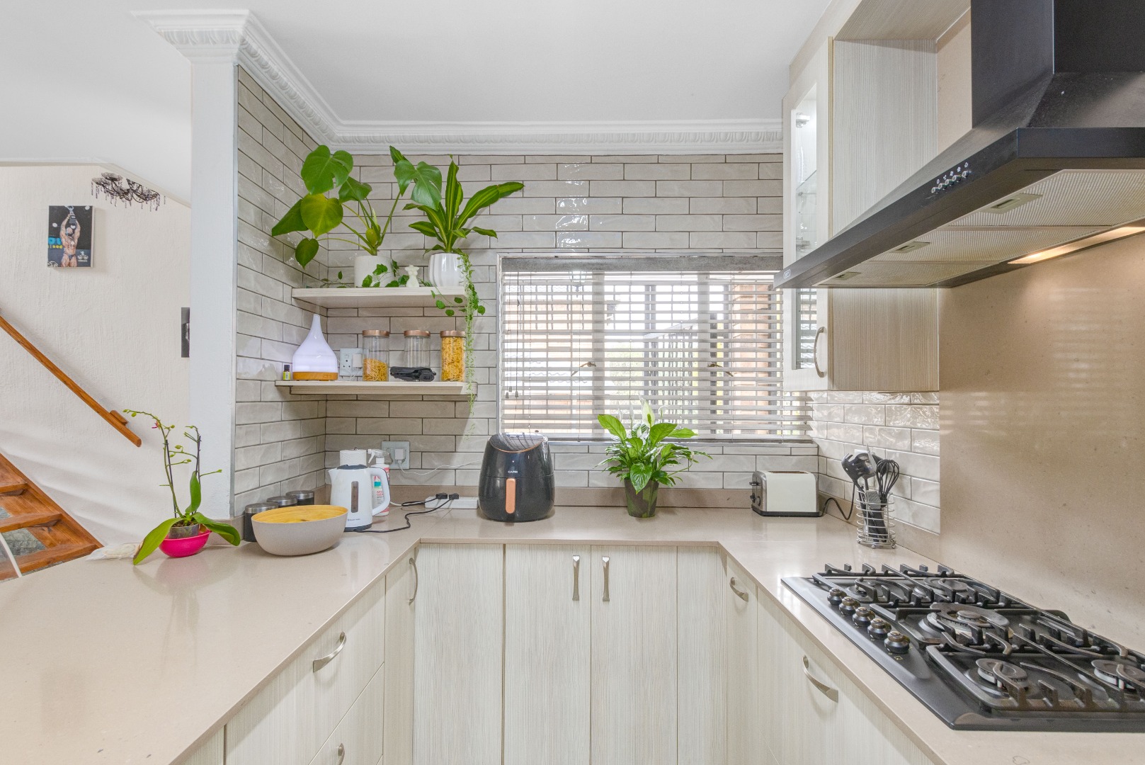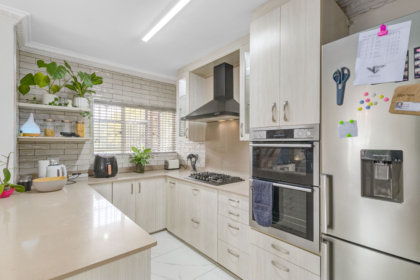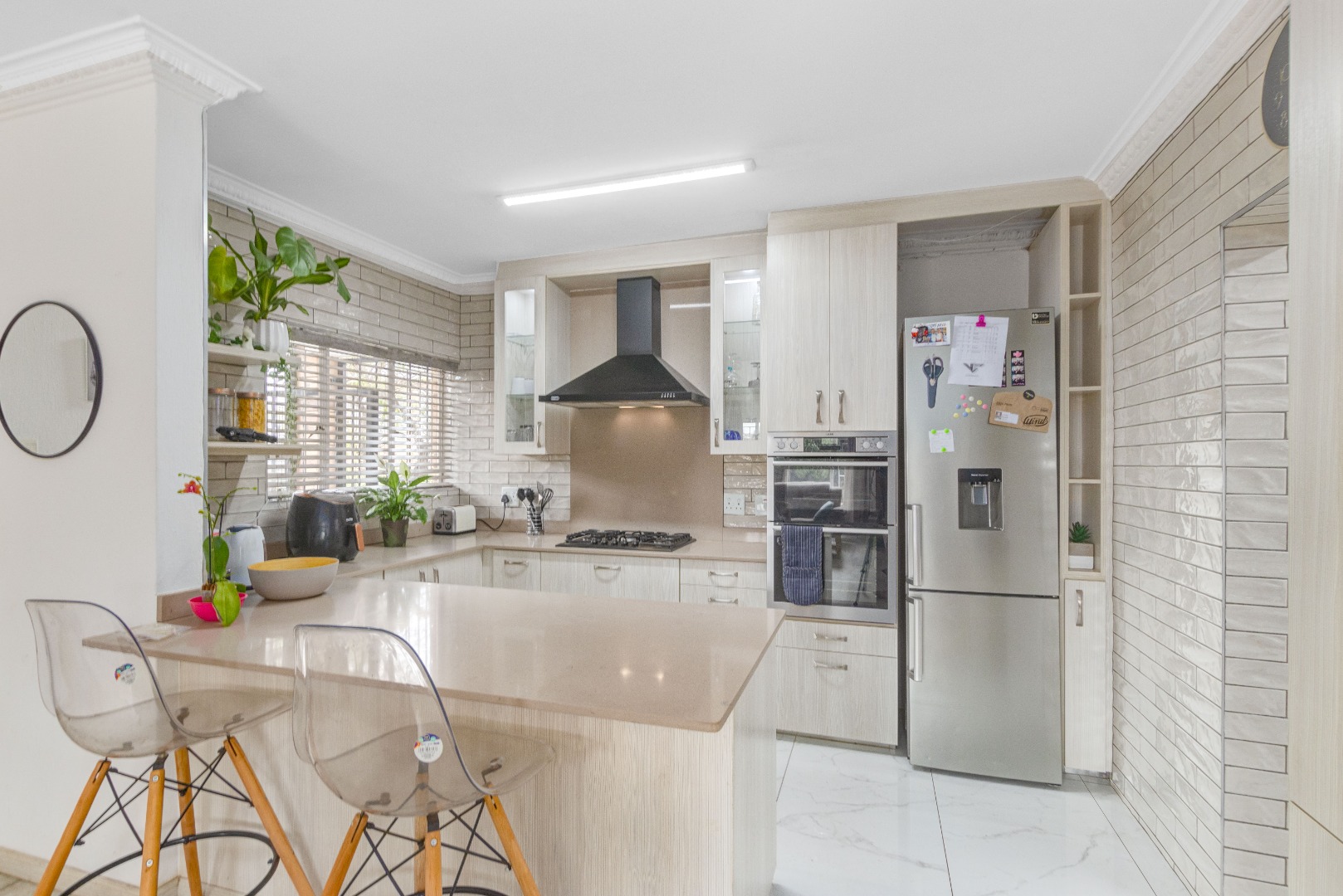 The heart of the home is the stunning kitchen, featuring Caesarstone countertops, ample cupboard space, and a cozy breakfast nook. The kitchen is equipped with a gas stove, double eye-level oven, and an extractor fan. For added convenience, there's a separate scullery with space for two appliances, a double basin, and additional cupboard space.