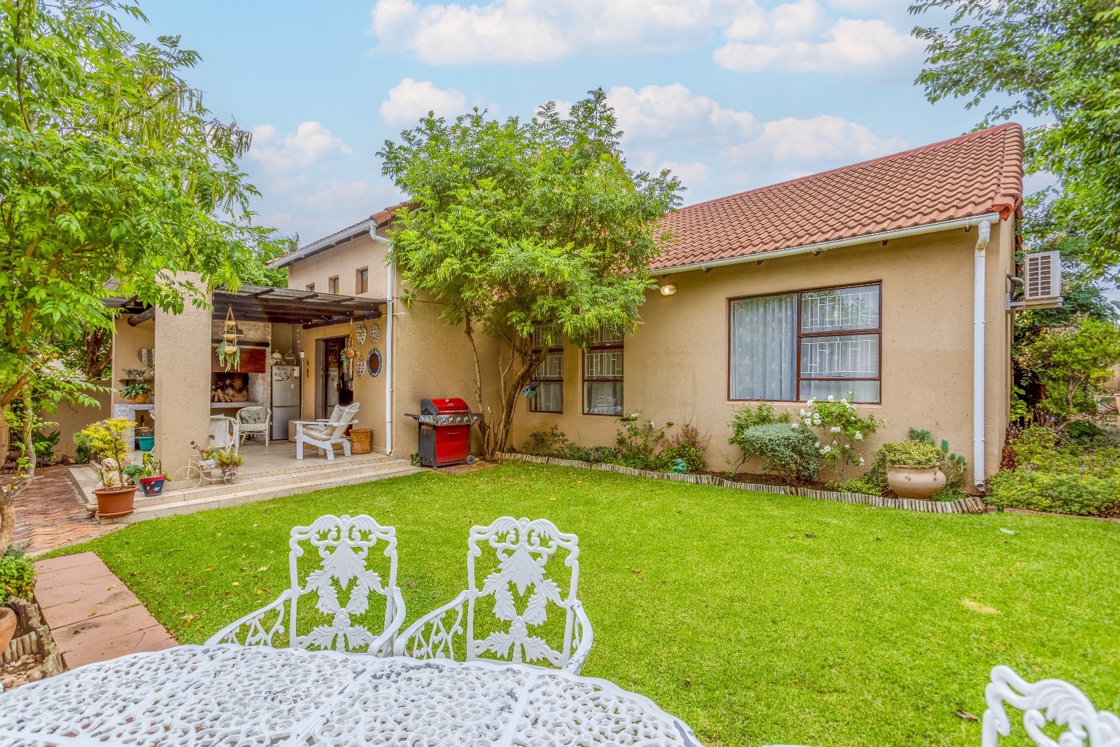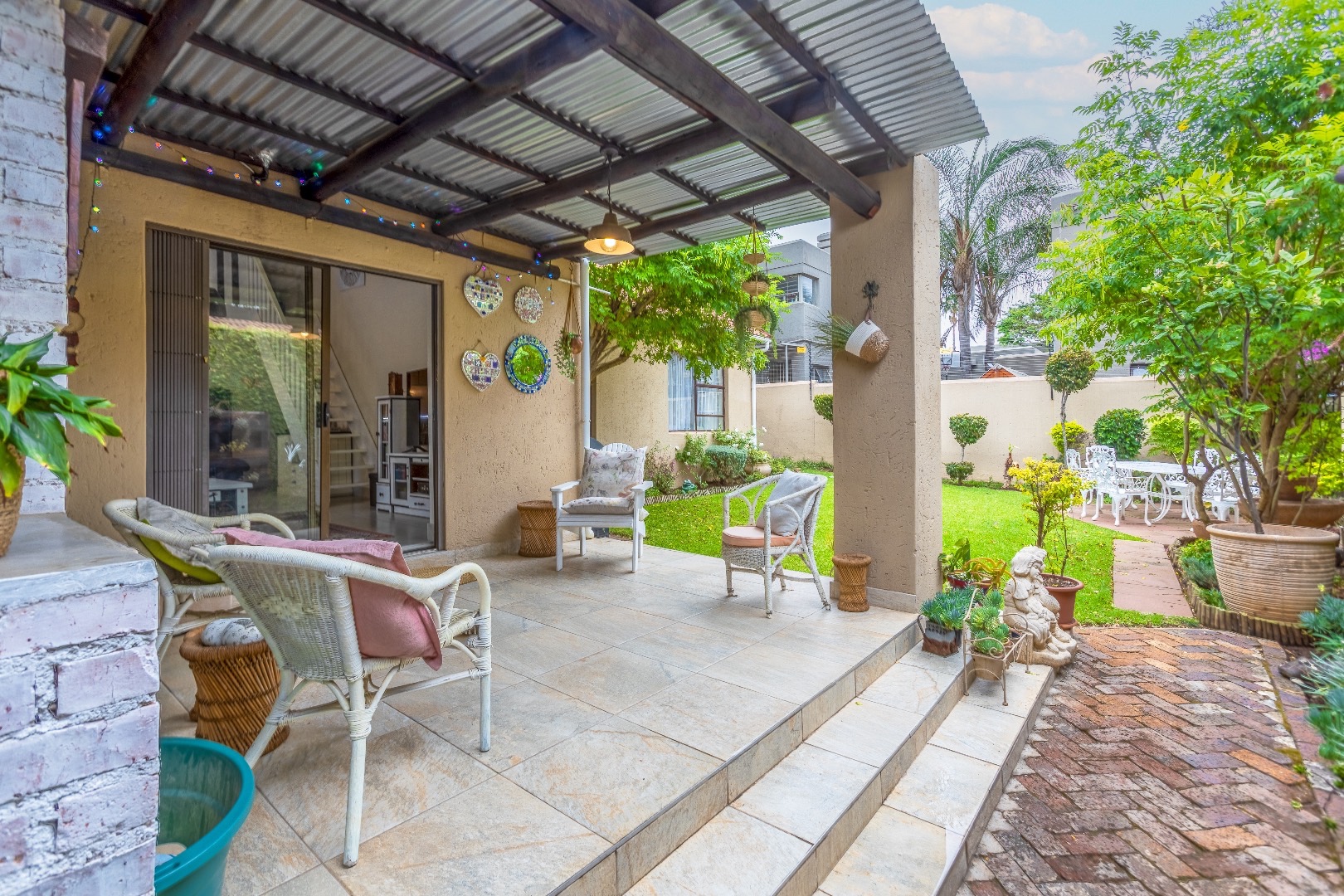 Outside is a covered patio, pergola and private wrap around garden. (Included in the rental is a gardener once a week)