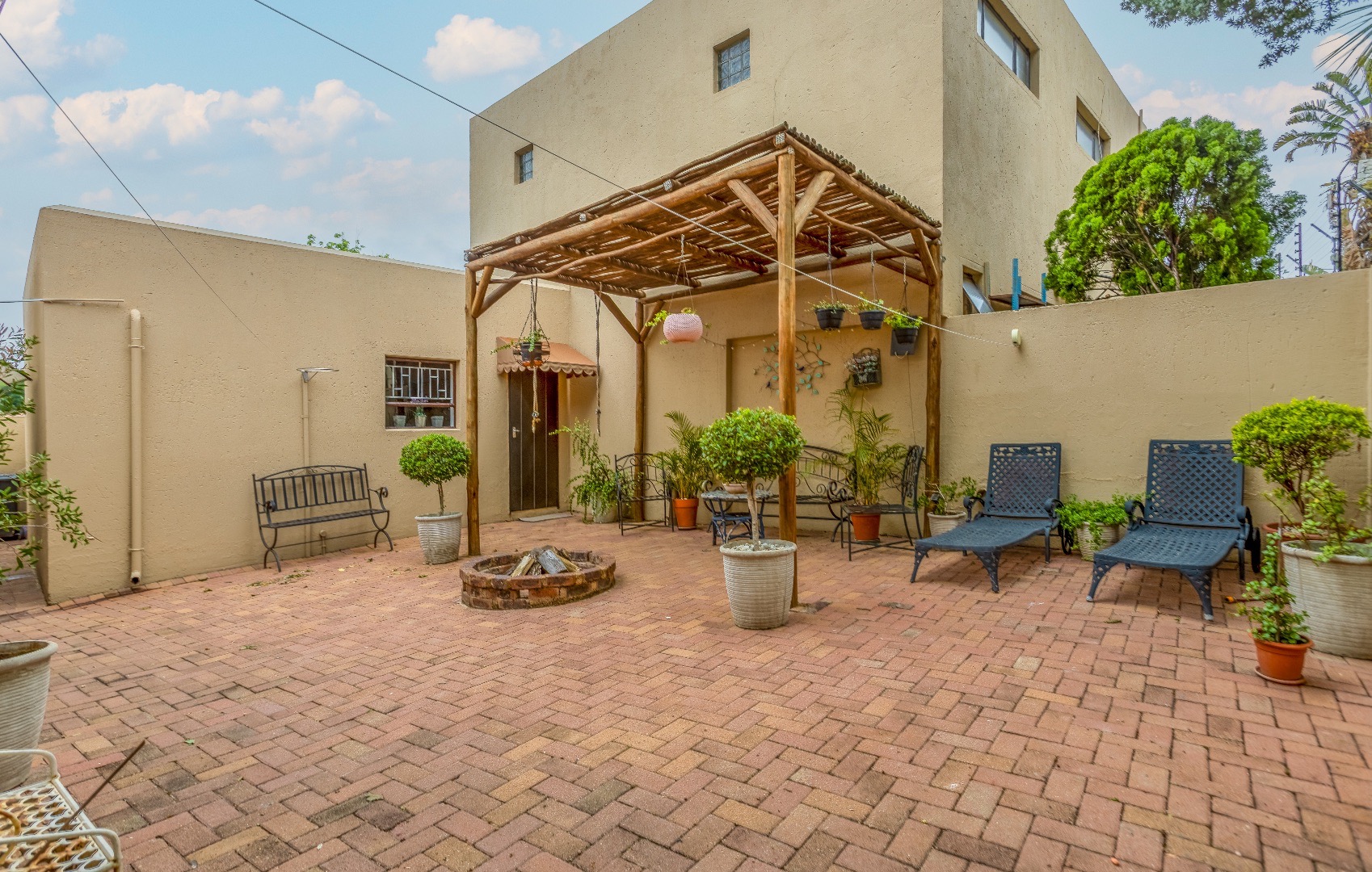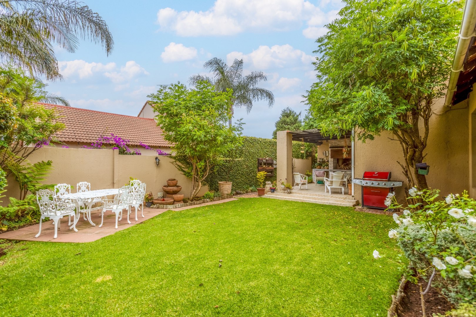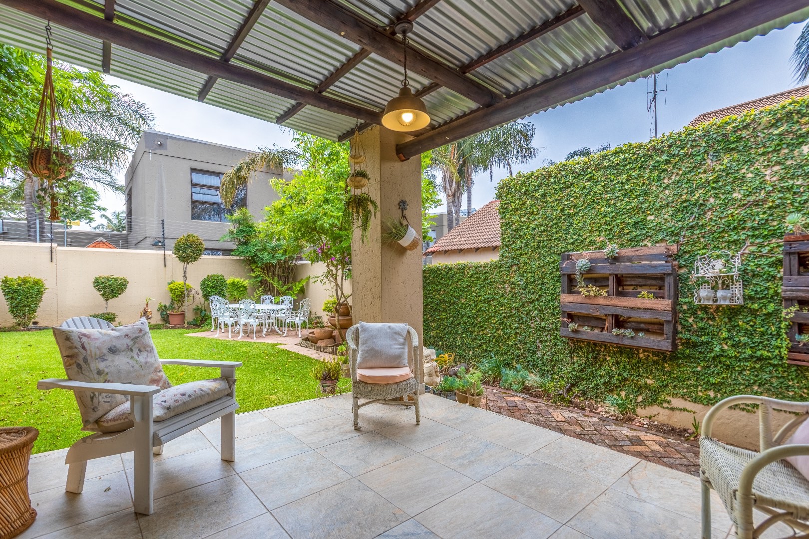 Outside is a covered patio, pergola and private wrap around garden. (Included in the rental is a gardener once a week)