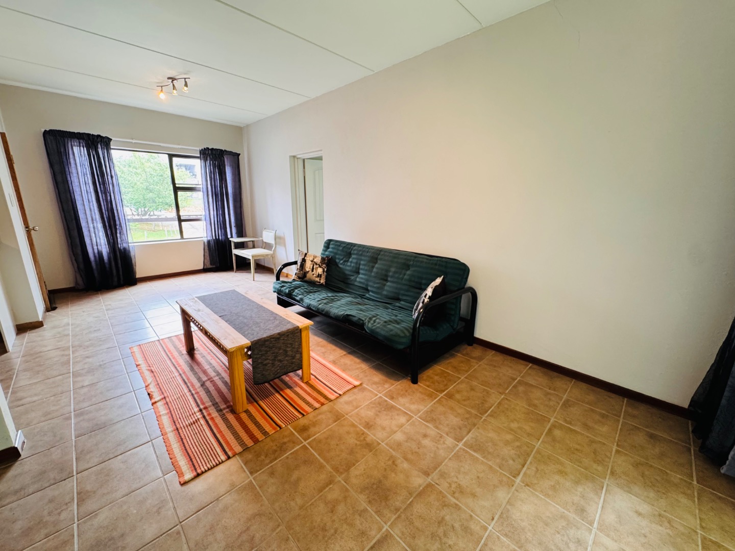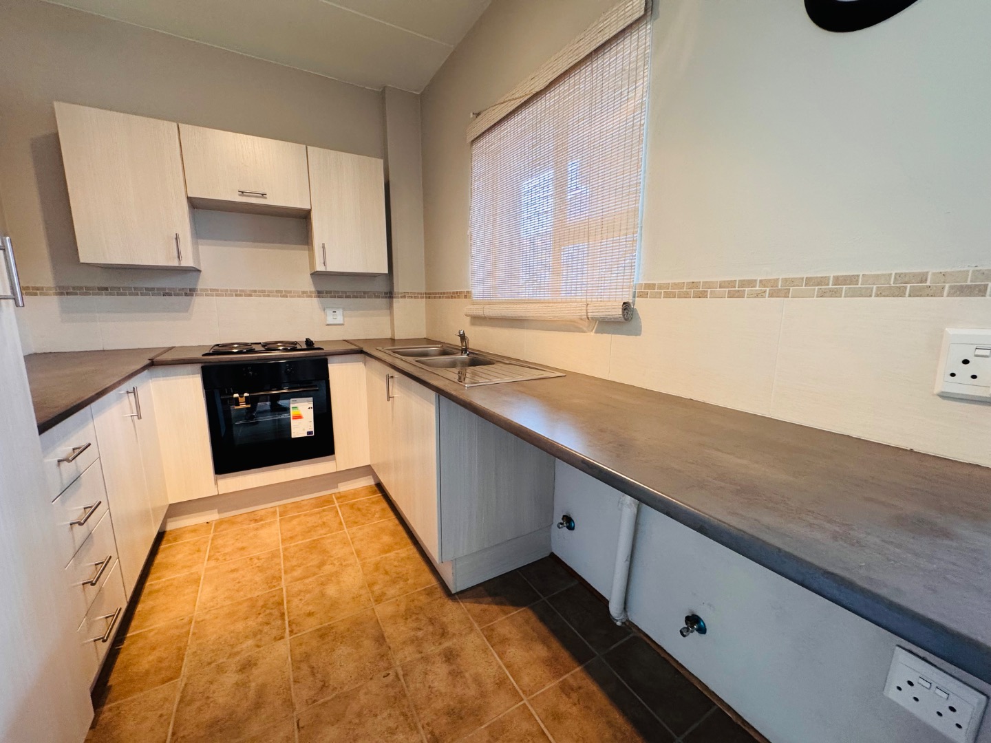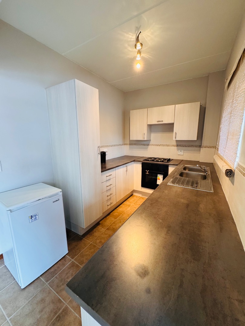 This inviting 2-bedroom, 2-bathroom rental unit in Honeydew Grove offers comfortable living. The open-plan lounge and dining area feature easy-to-maintain tiled flooring. The modern, U-shaped kitchen is equipped with light wood-look cabinetry, dark laminate countertops, a built-in oven and hob, and a double sink, providing a functional space for meal preparation, with space for a double door fridge and 2 under counter wet appliances.