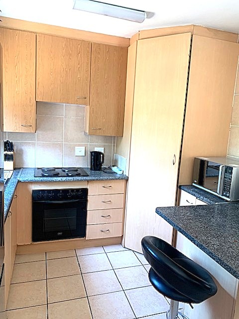Designed for comfortable living, the residence features an open-plan layout that seamlessly connects the living and dining areas, enhanced by natural light and durable tiled flooring throughout. The functional kitchen boasts light wood cabinetry, granite countertops, a built-in oven and hob and a convenient breakfast bar, making it ideal for everyday meals.