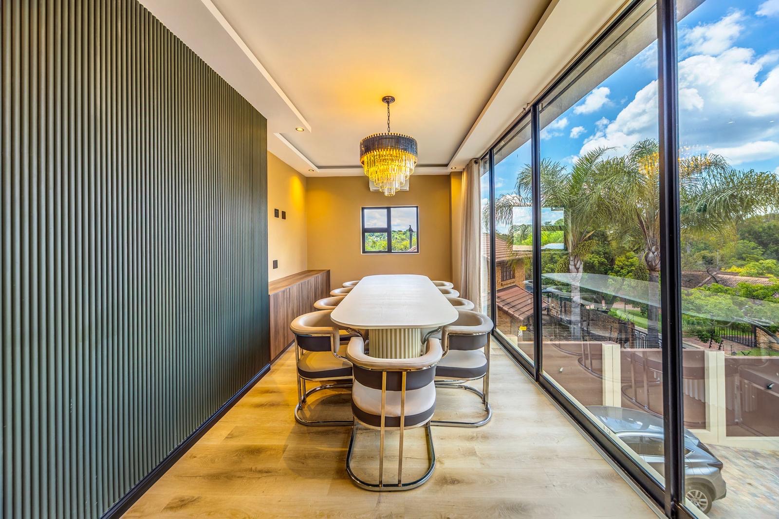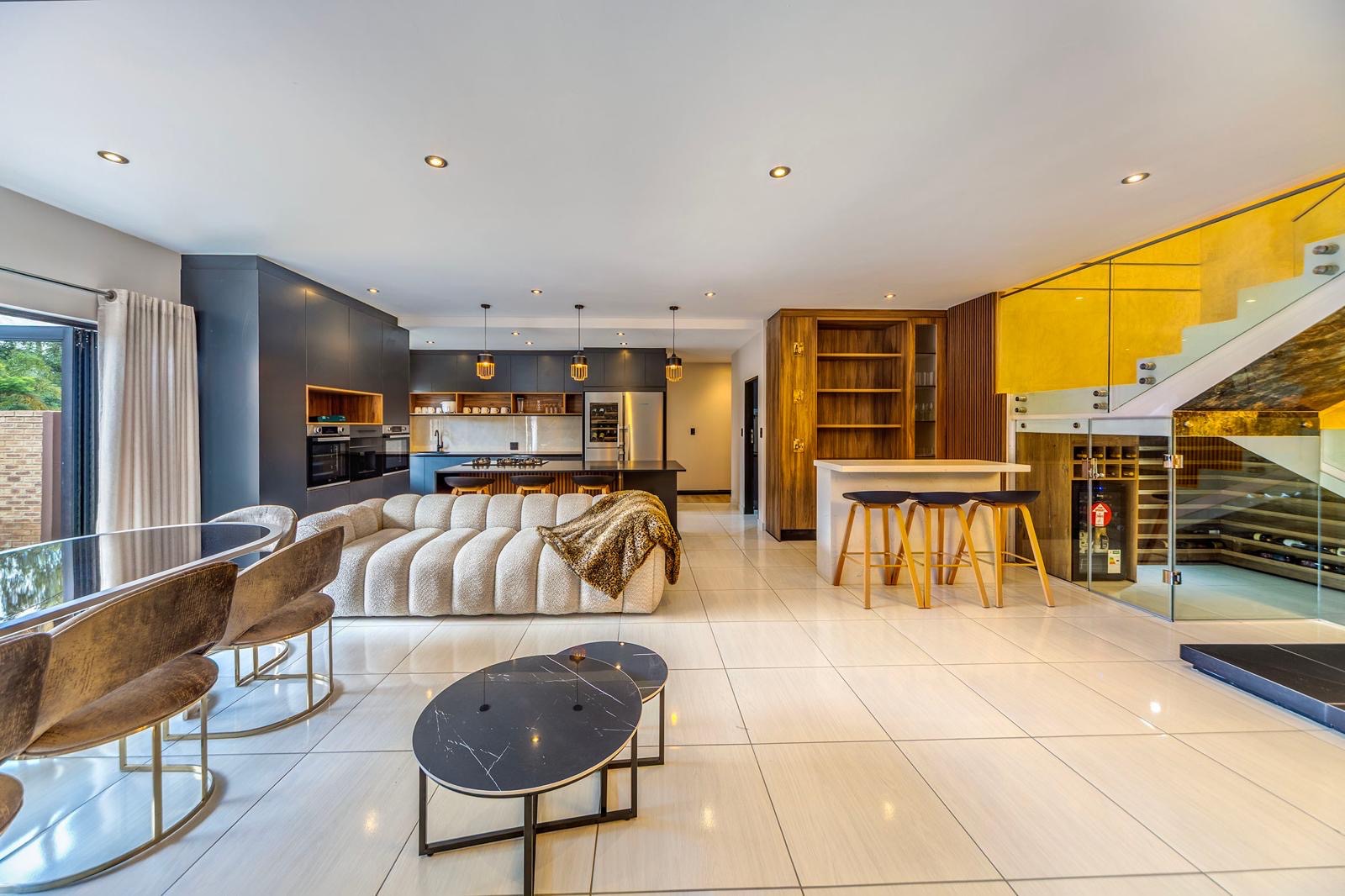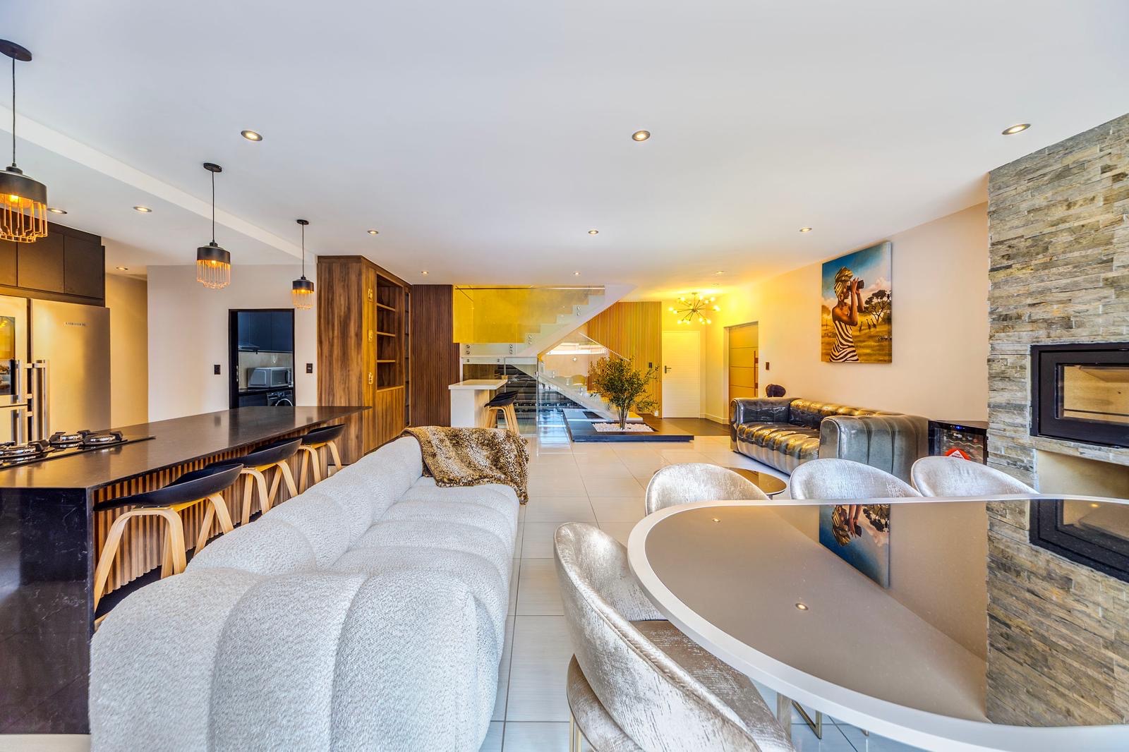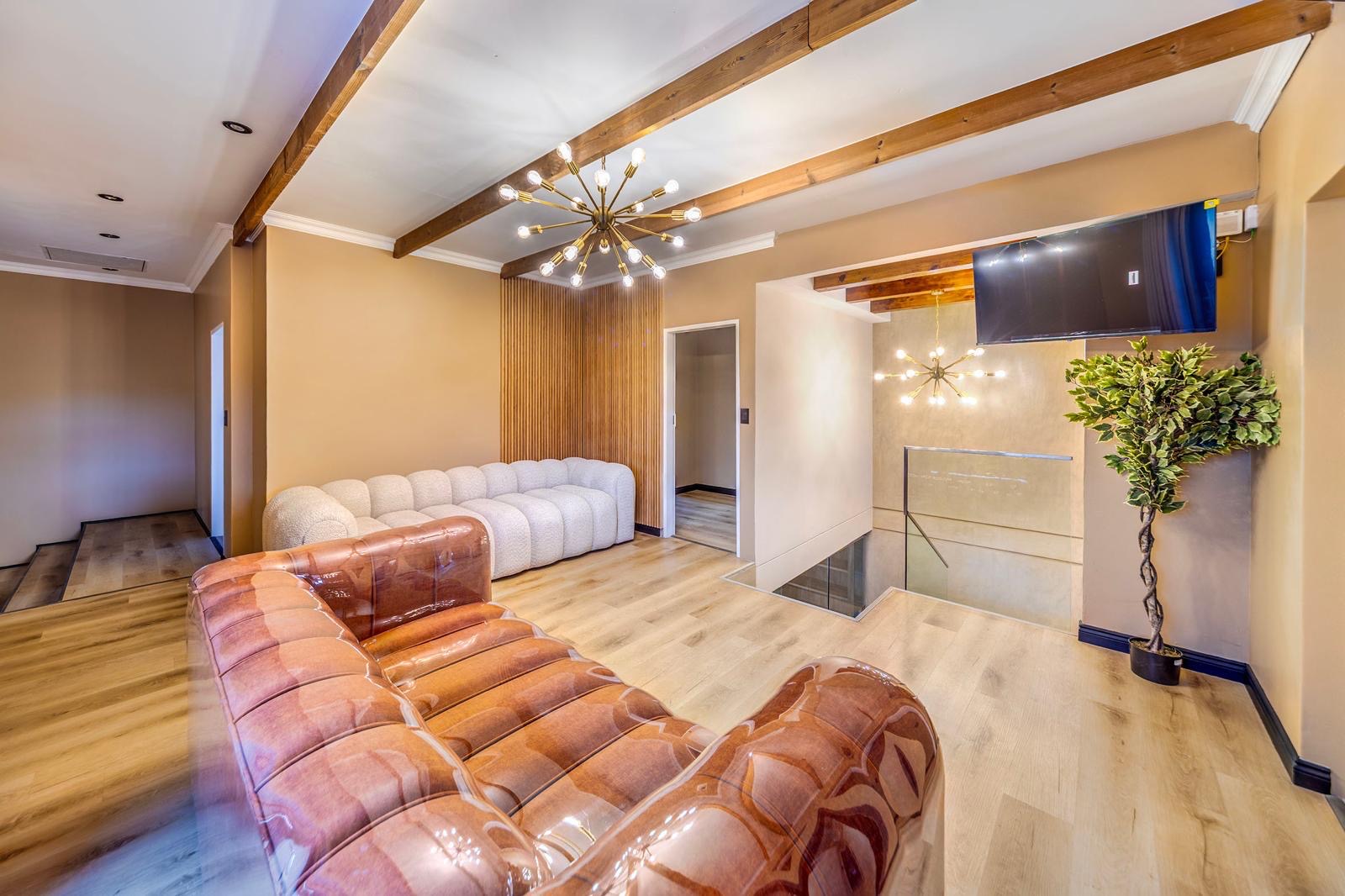 This stunning 6-bedroom house for rent in Bryanston West is semi furnished and elegantly decorated. The spacious living room features high ceilings, a cozy fireplace, and large windows that overlook the beautifully landscaped backyard. The modern kitchen is equipped with top-of-the-line appliances and ample storage space.
