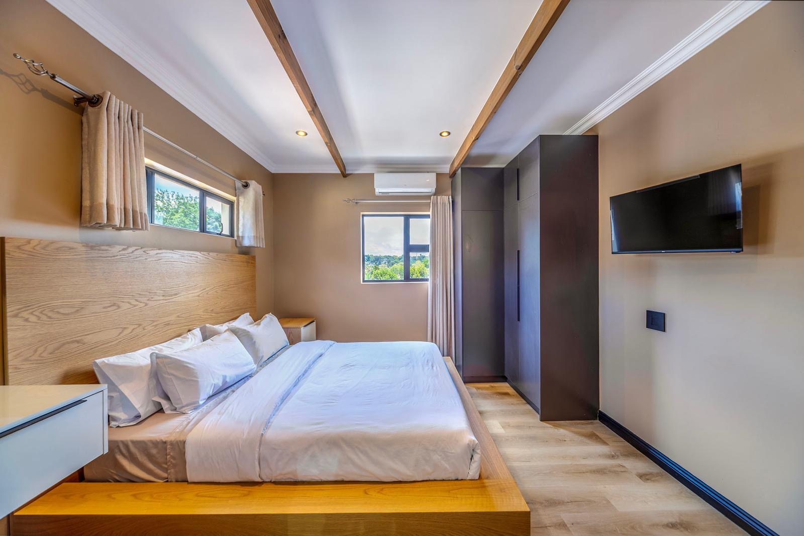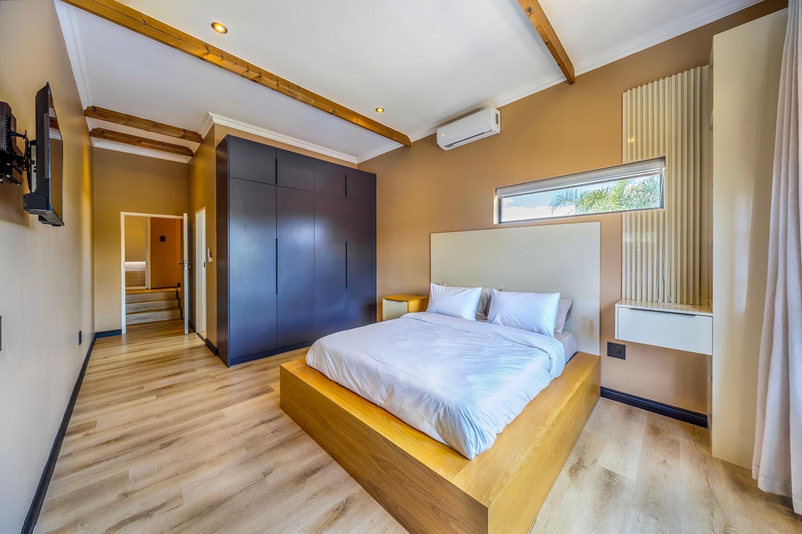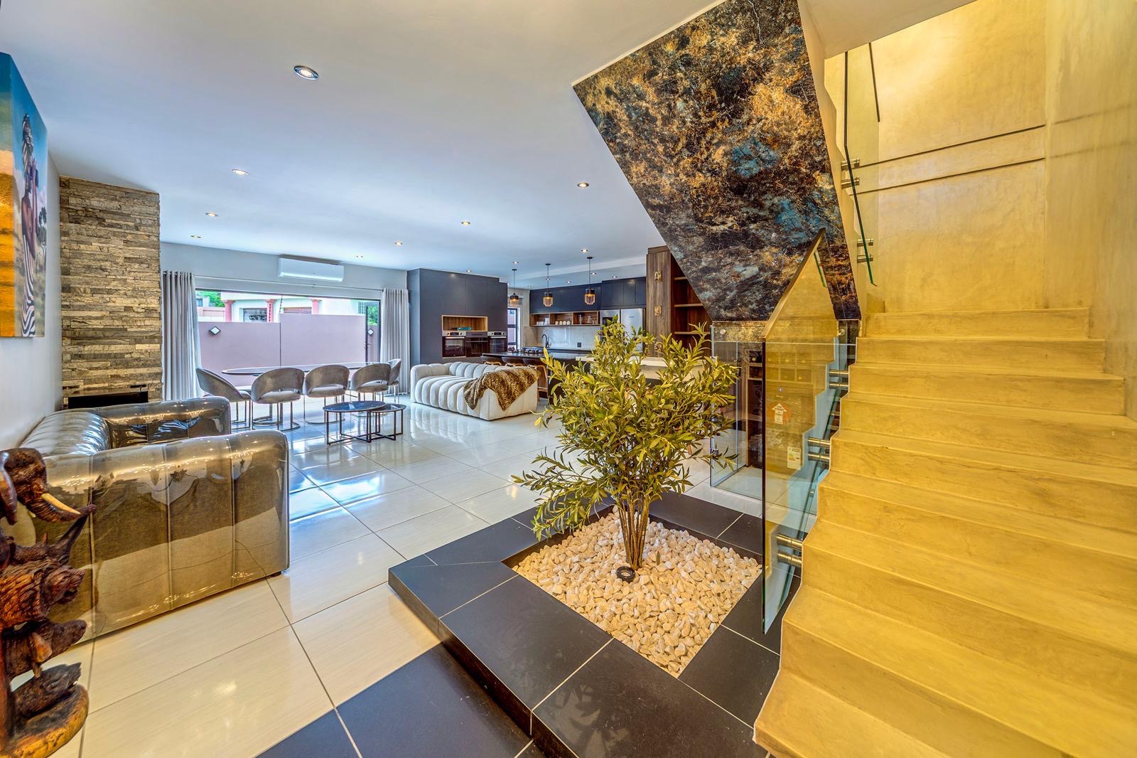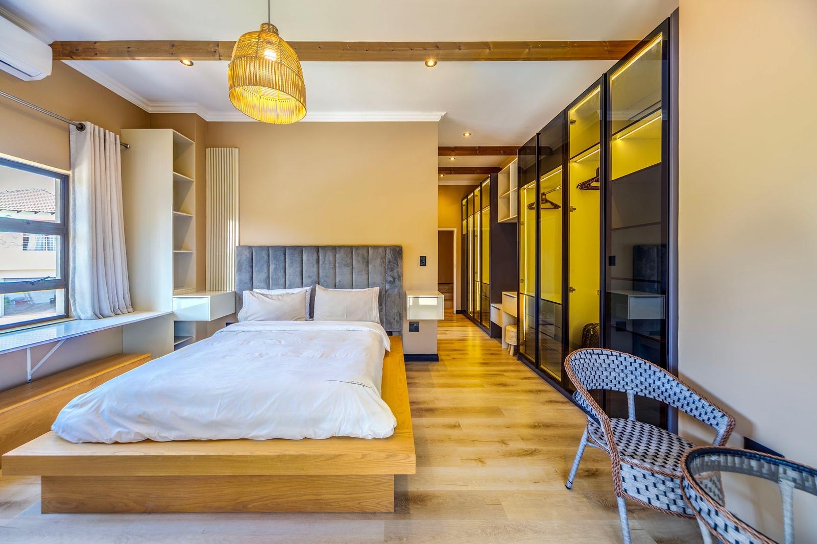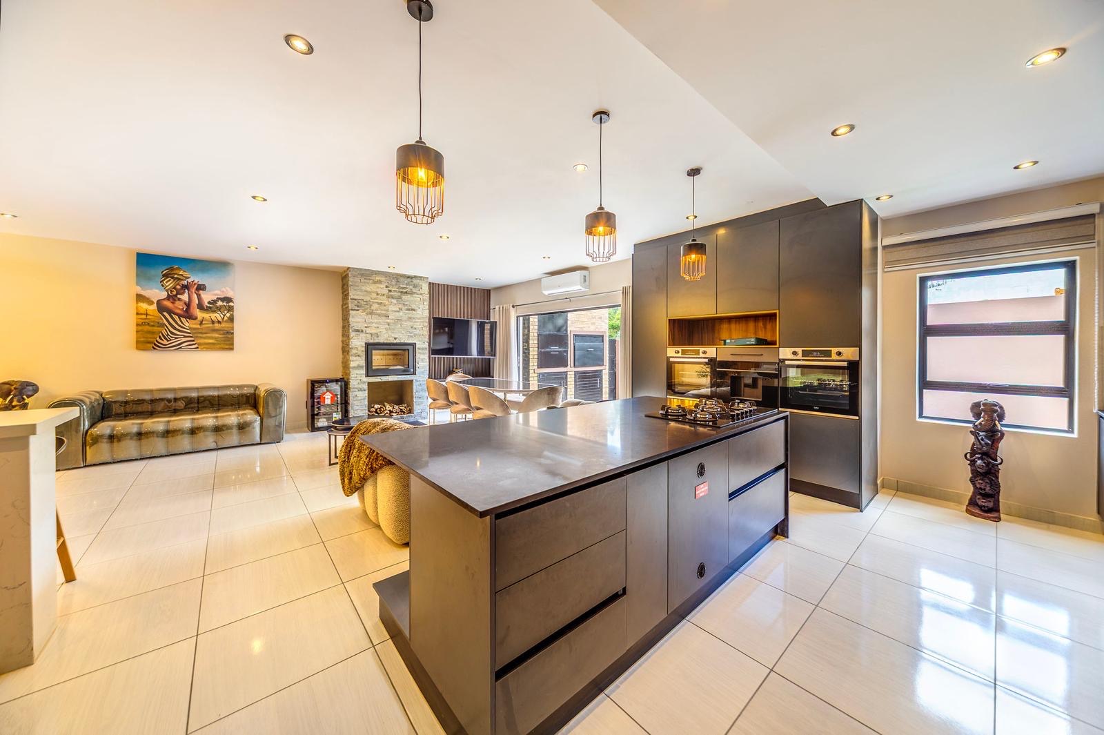 This stunning 6-bedroom house for rent in Bryanston West is semi furnished and elegantly decorated. The spacious living room features high ceilings, a cozy fireplace, and large windows that overlook the beautifully landscaped backyard. The modern kitchen is equipped with top-of-the-line appliances and ample storage space.