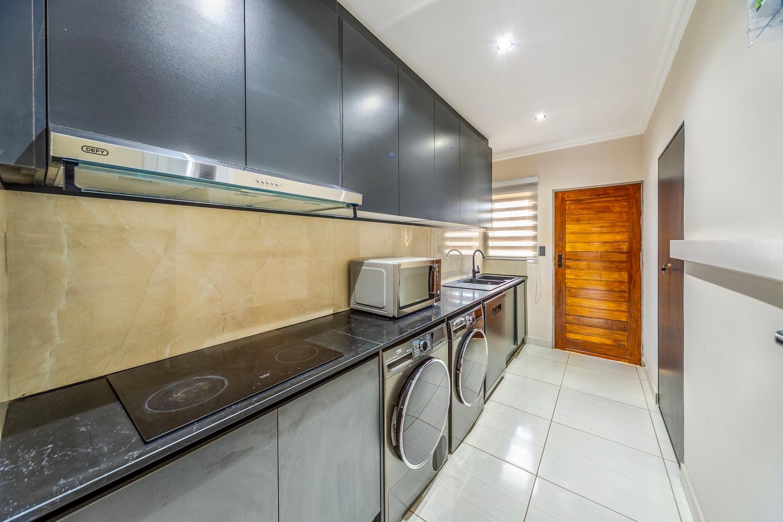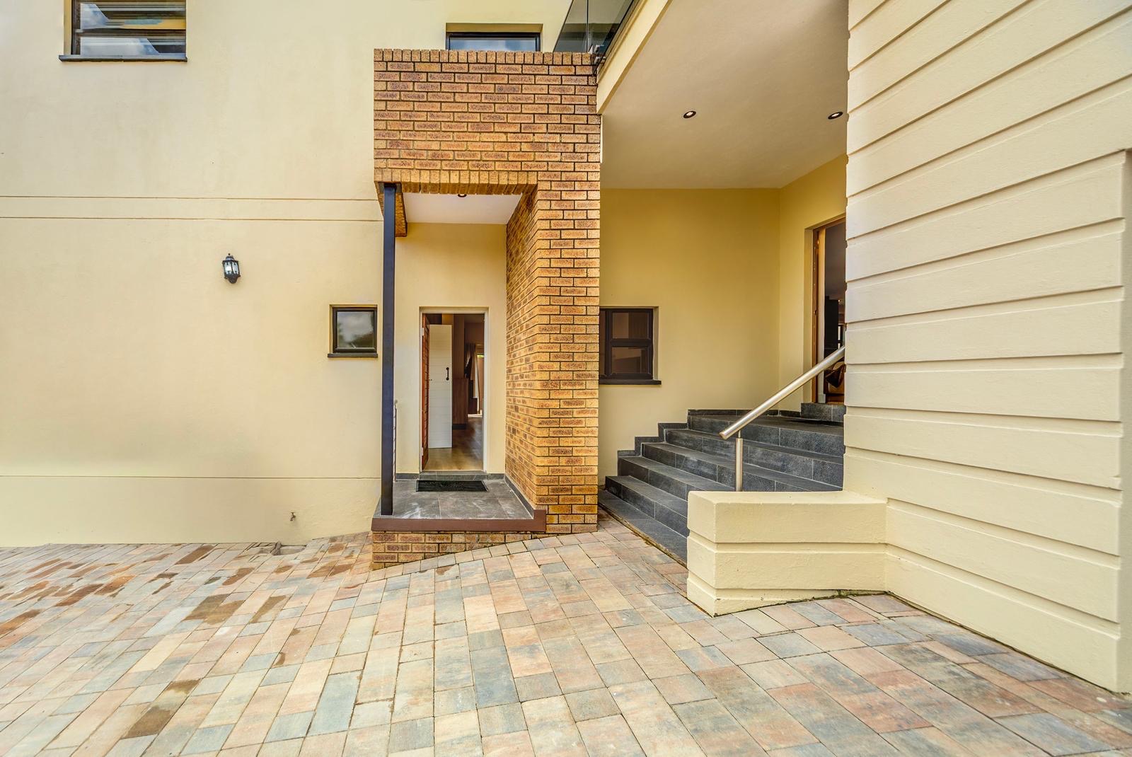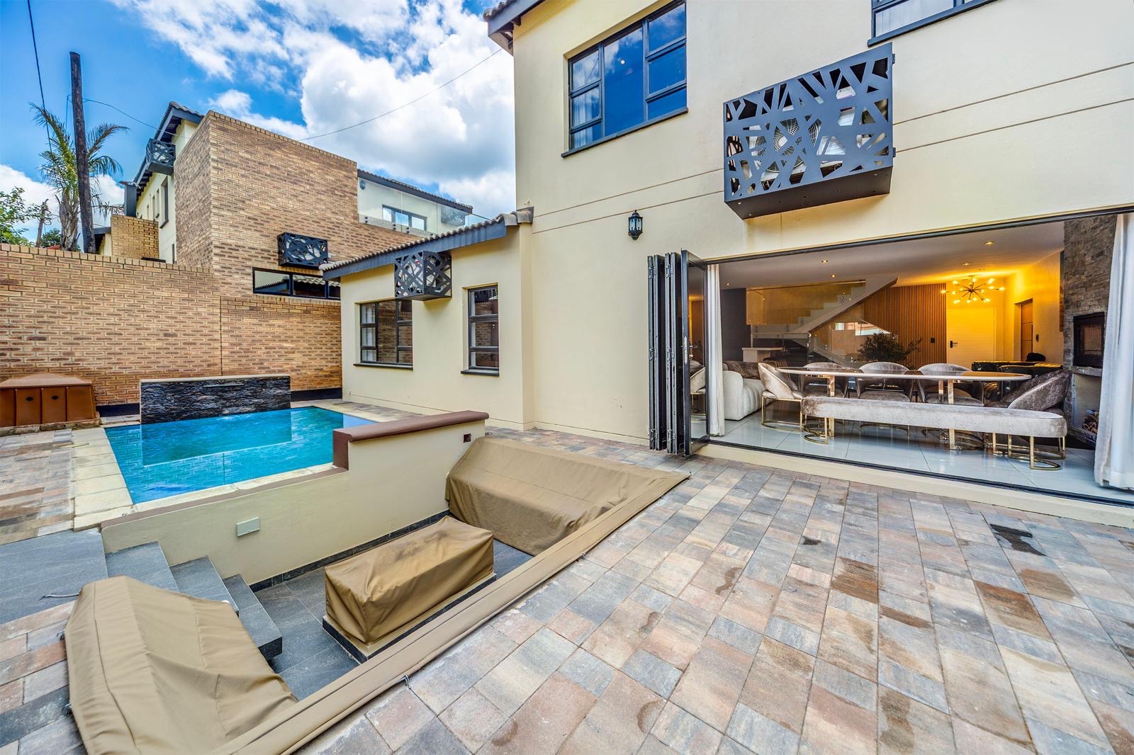 The house also boasts a private swimming pool, perfect for enjoying the warm South African weather. The outdoor area includes a patio with comfortable seating and a barbecue area, making it ideal for entertaining guests.