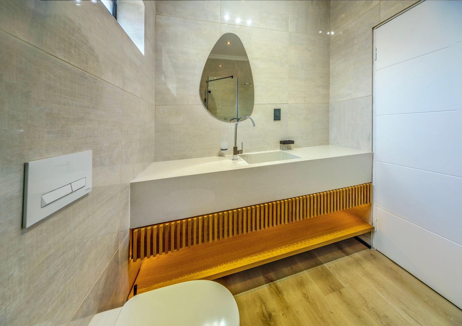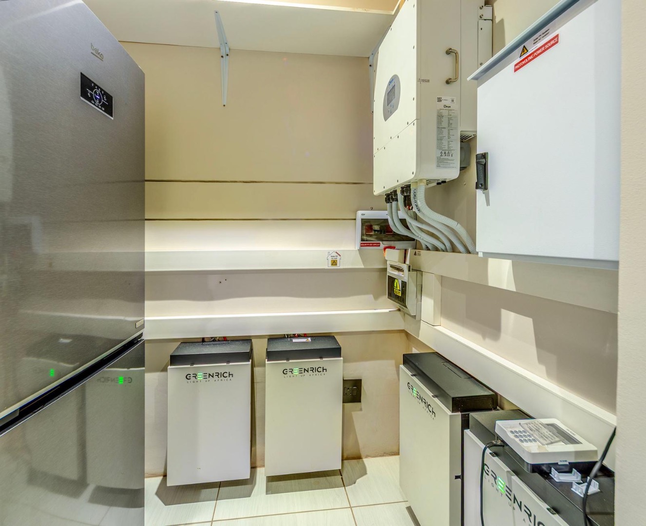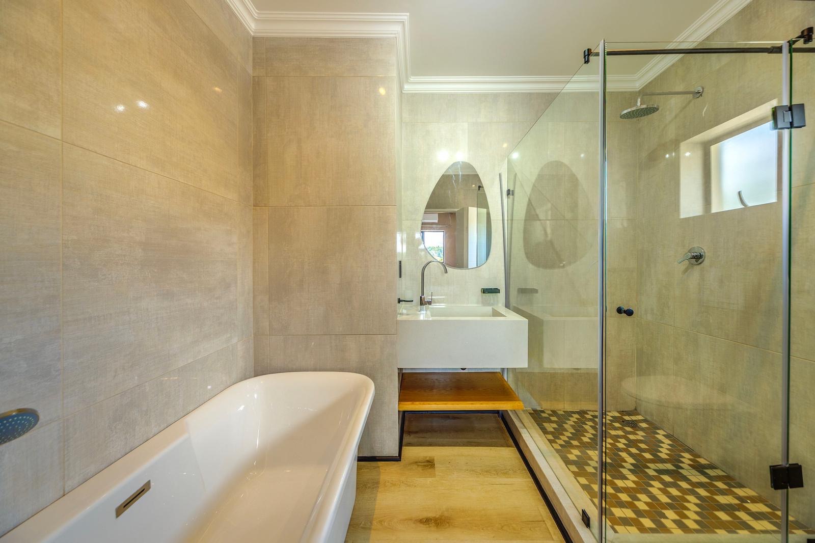 The house also boasts a private swimming pool, perfect for enjoying the warm South African weather. The outdoor area includes a patio with comfortable seating and a barbecue area, making it ideal for entertaining guests.