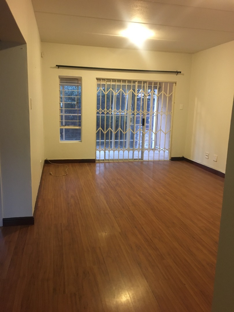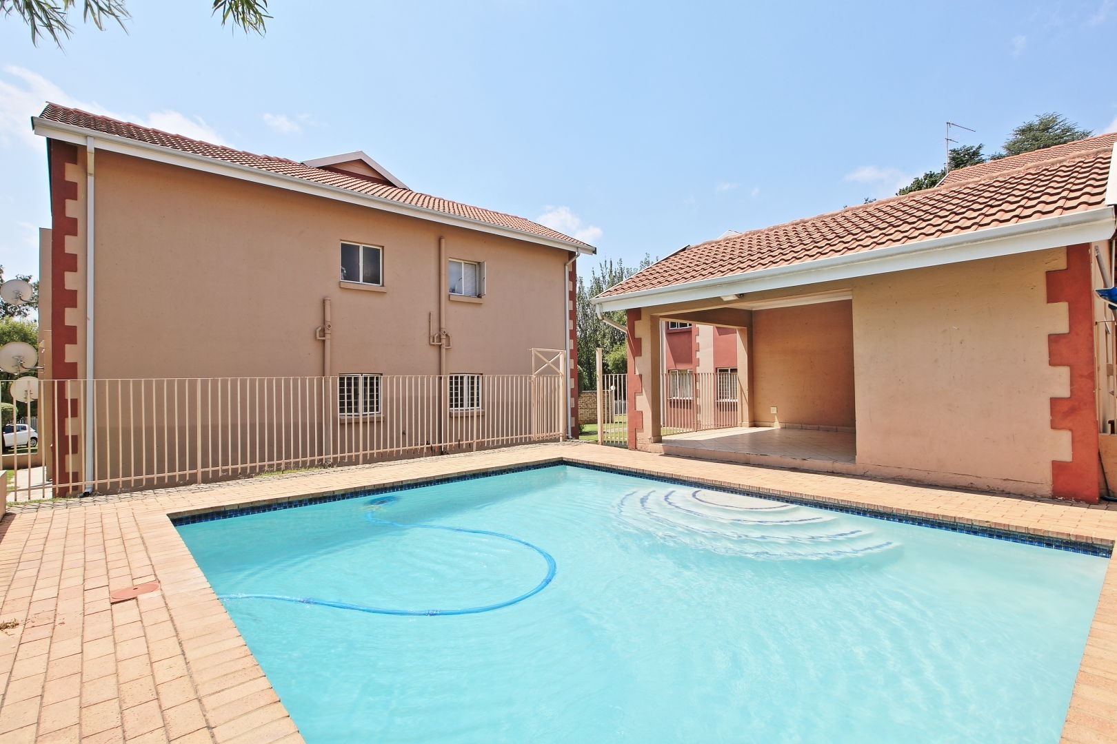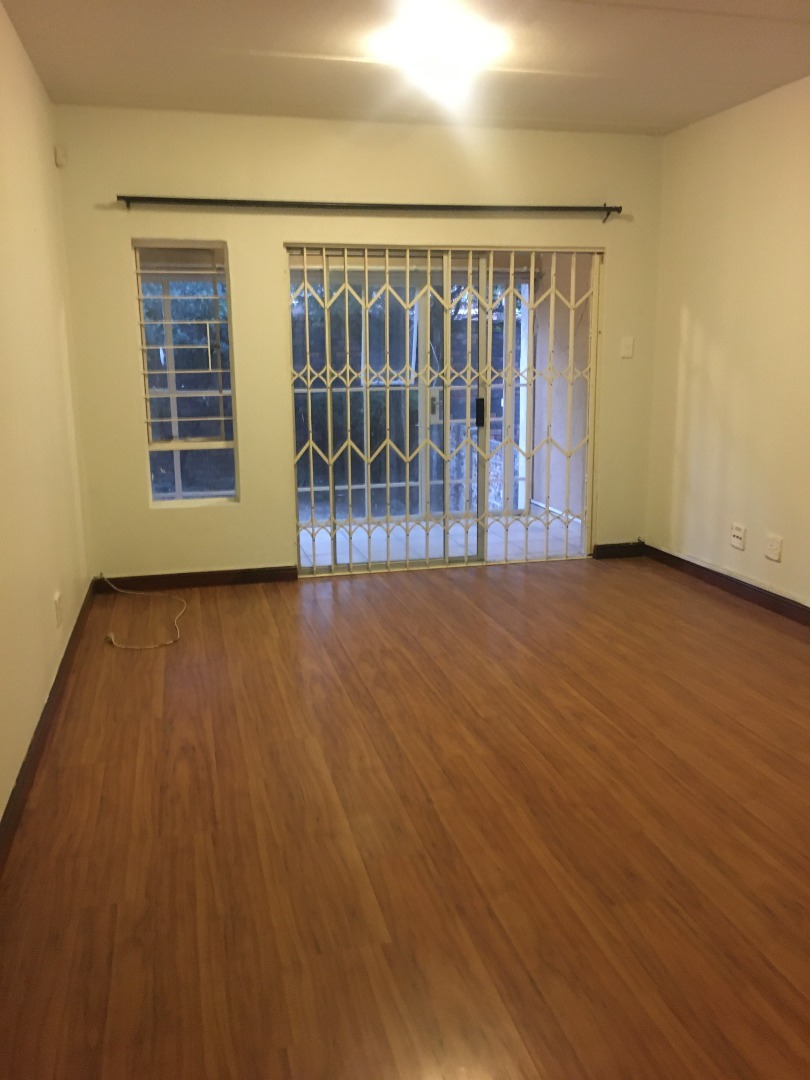 This unit boasts 2 bedrooms and 2 bathrooms (main en-suite). The primary bedroom's bathroom features a rejuvenating shower, while the second bathroom offers a relaxing tub. Step inside to discover remarkably spacious open-plan living areas, including a dining space suitable for a standard 6-seater table and a cozy lounge suite. The lounge gracefully extends onto an enclosed patio, providing a charming view of the private garden. The kitchen offers ample cupboard space and a designated space for a washing machine. A generously sized corner pantry, room for a single-door fridge, and a delightful breakfast nook complete the kitchen amenities. The unit features easy-to-maintain wooden flooring throughout, making cleaning effortless. Safety is a top priority, with a security trellis door at the patio entrance and a gate securing the main entrance. Furthermore, the complex provides 24-hour security, a refreshing swimming pool, and a welcoming clubhouse. Conveniently situated near the Woodmead retail center, the Buccleuch Montessori primary schools, restaurants, and various amenities, this unit offers easy access to the highway.