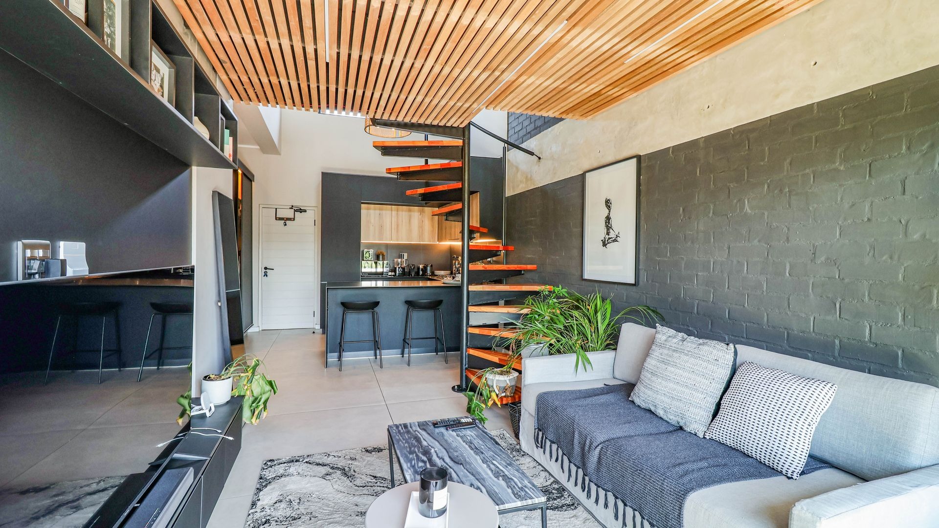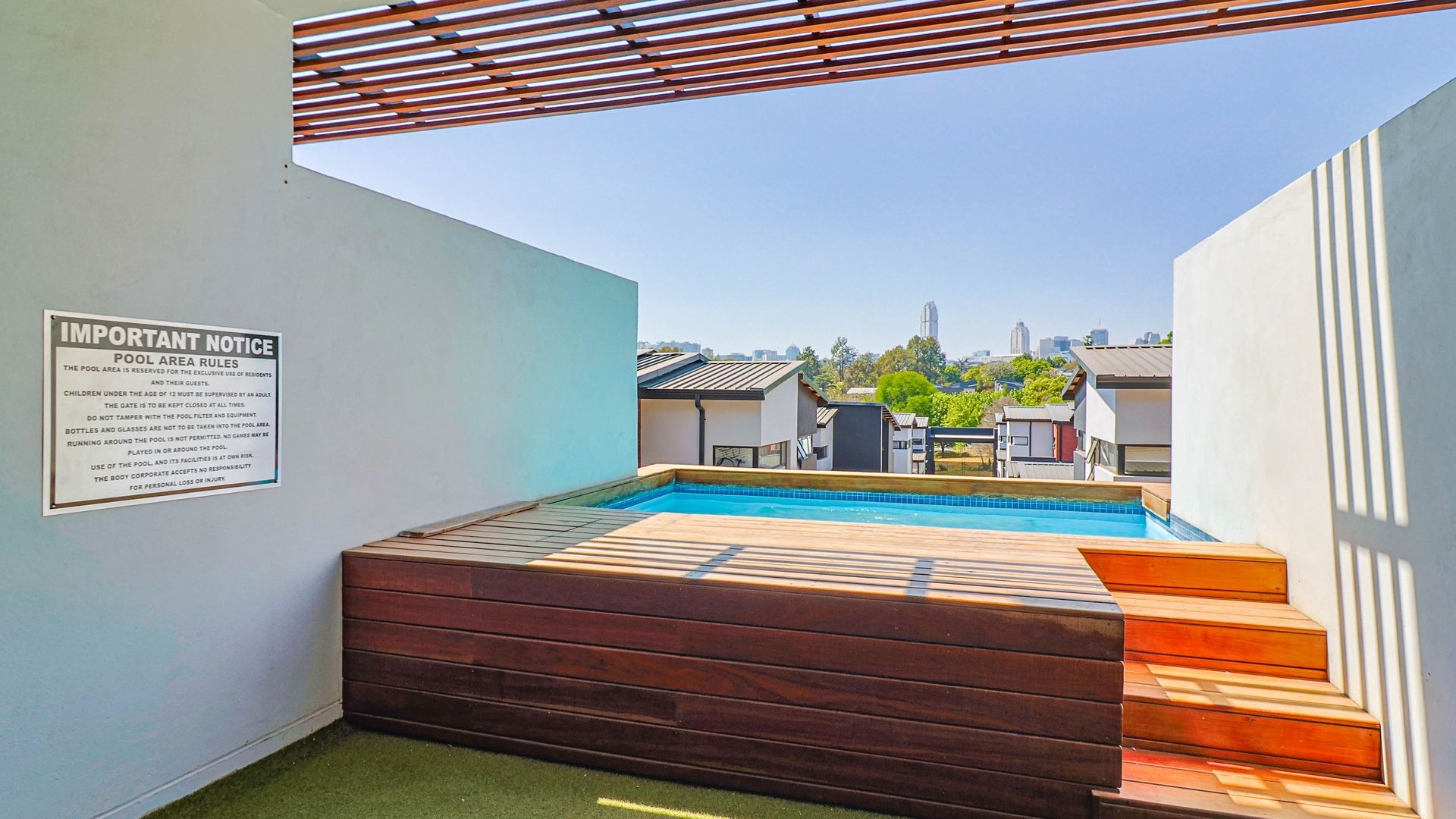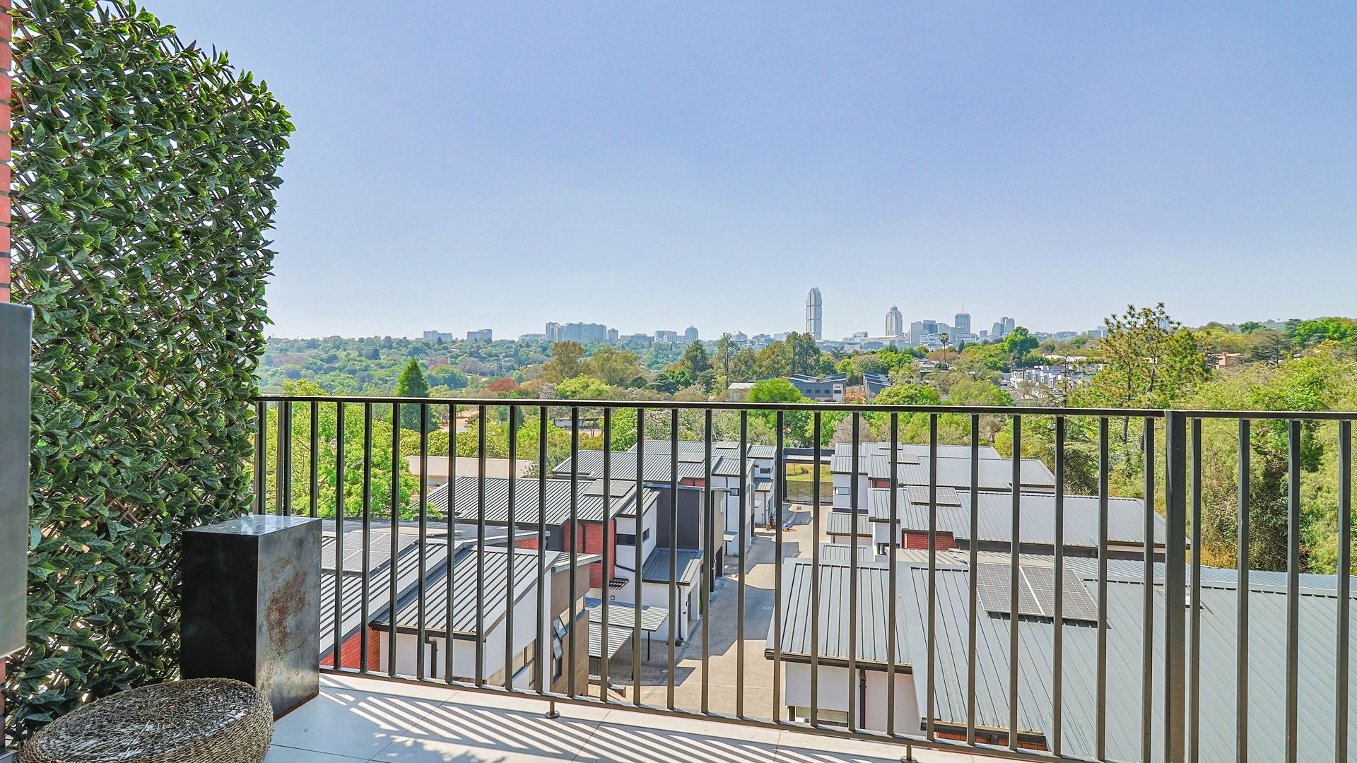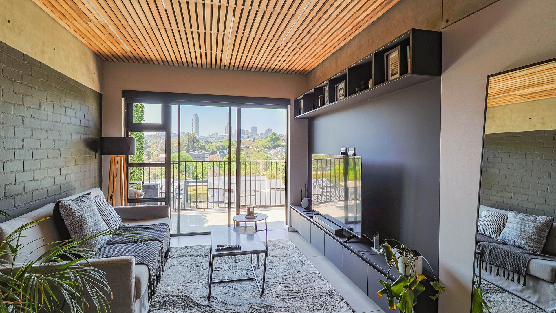 Open plan lounge elegantly decorated with built in Tv stand and shelving. Wooden roof for added beauty and design. Leads out onto a breath taking large balcony with views of Sandton's skyline. Built in loft makes this one bed so spacious.