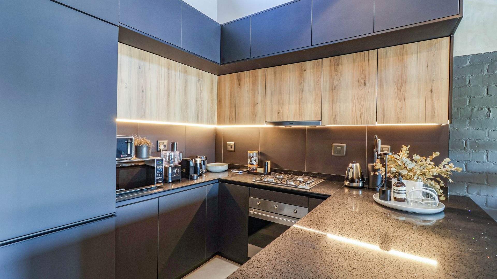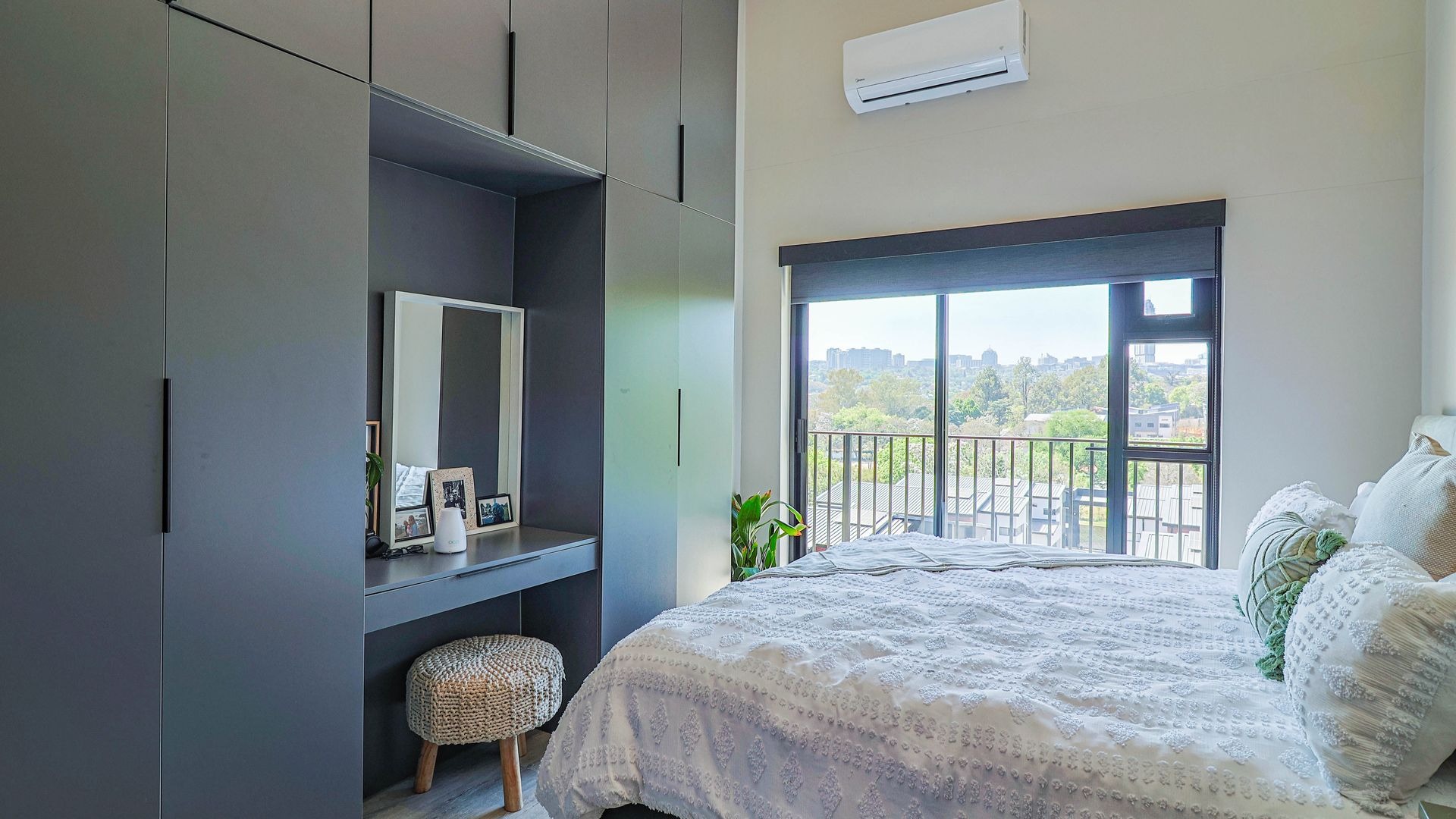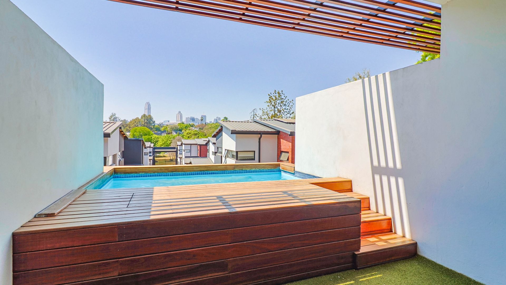 Open plan lounge elegantly decorated with built in Tv stand and shelving. Wooden roof for added beauty and design. Leads out onto a breath taking large balcony with views of Sandton's skyline. Built in loft makes this one bed so spacious.