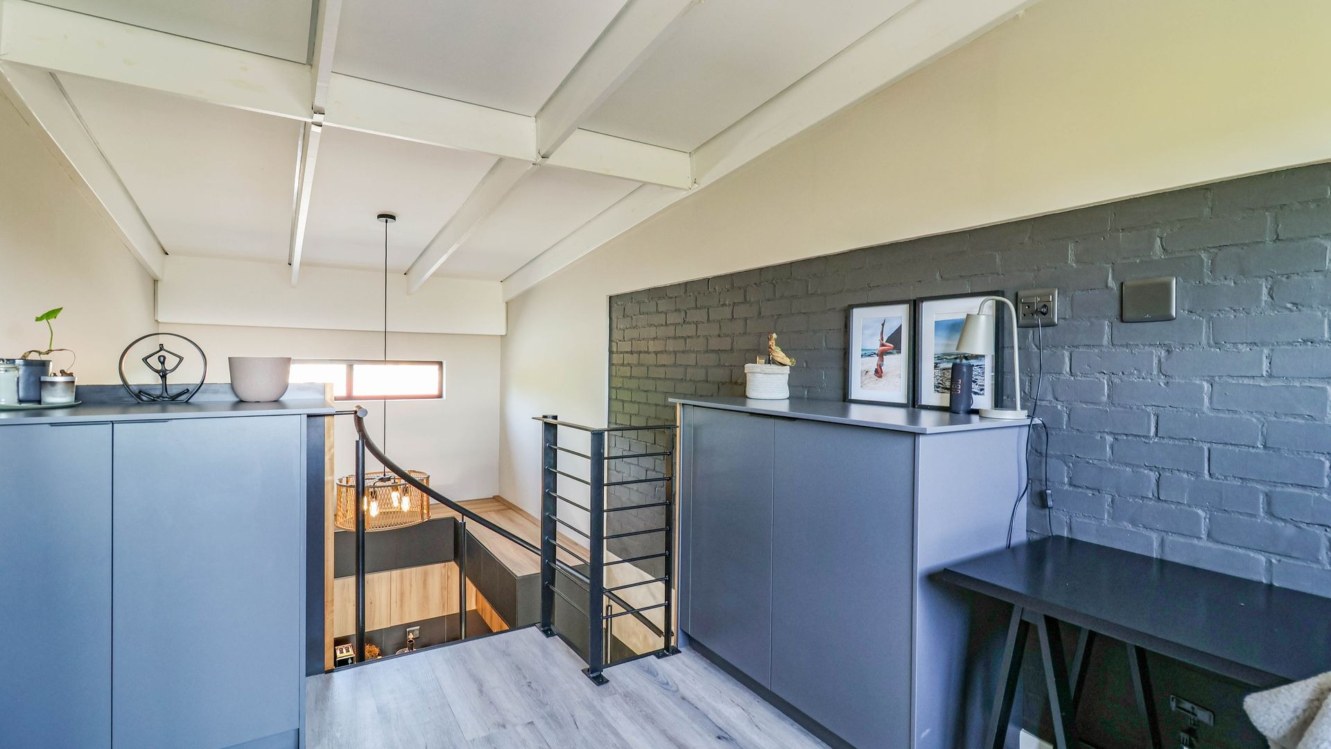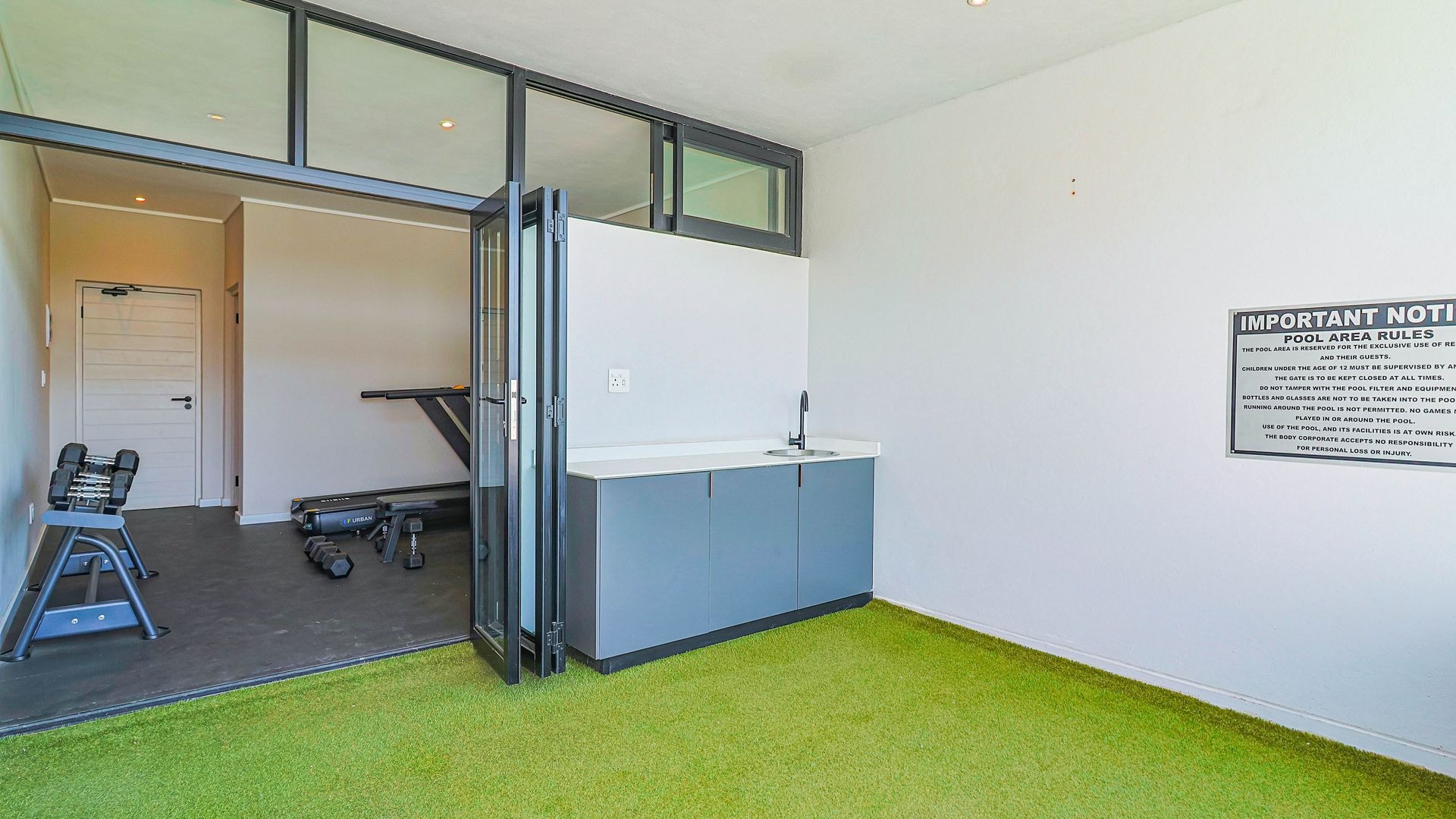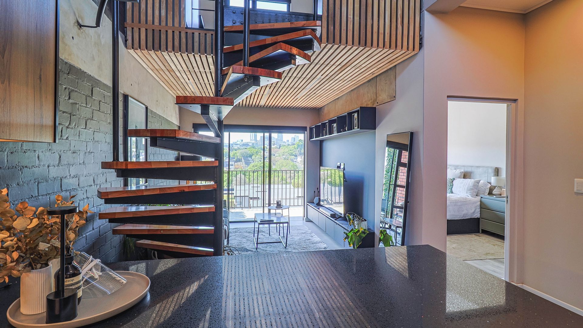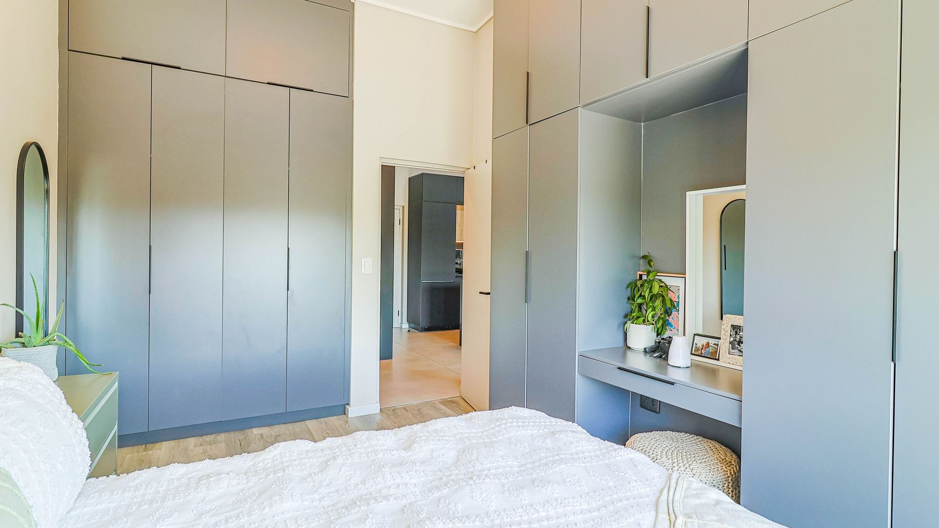 Open plan lounge elegantly decorated with built in Tv stand and shelving. Wooden roof for added beauty and design. Leads out onto a breath taking large balcony with views of Sandton's skyline. Built in loft makes this one bed so spacious.