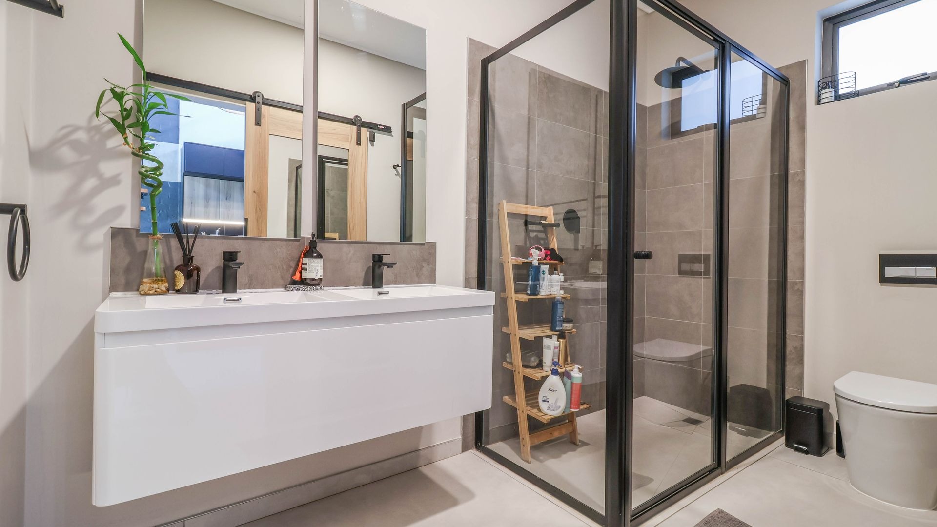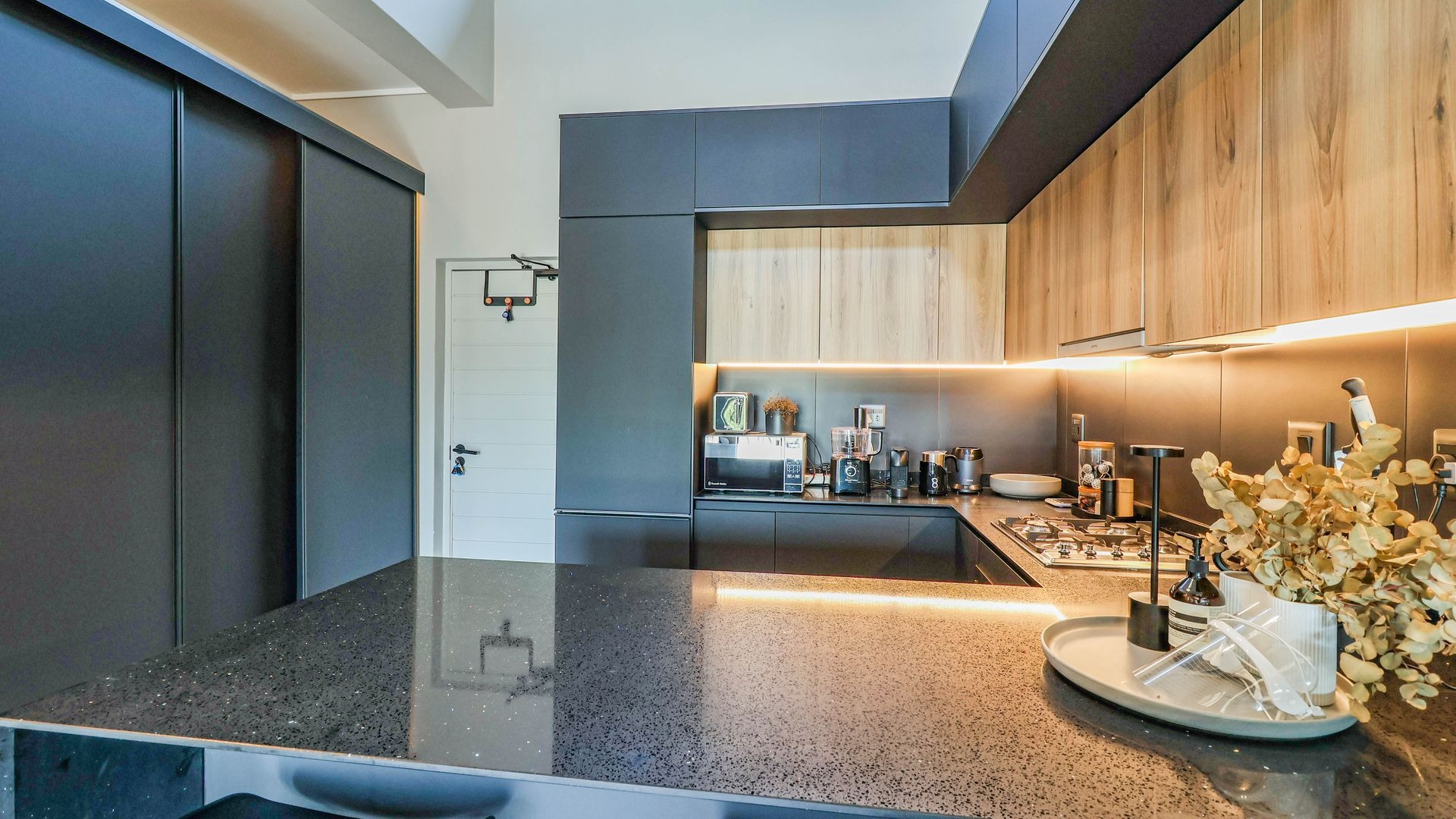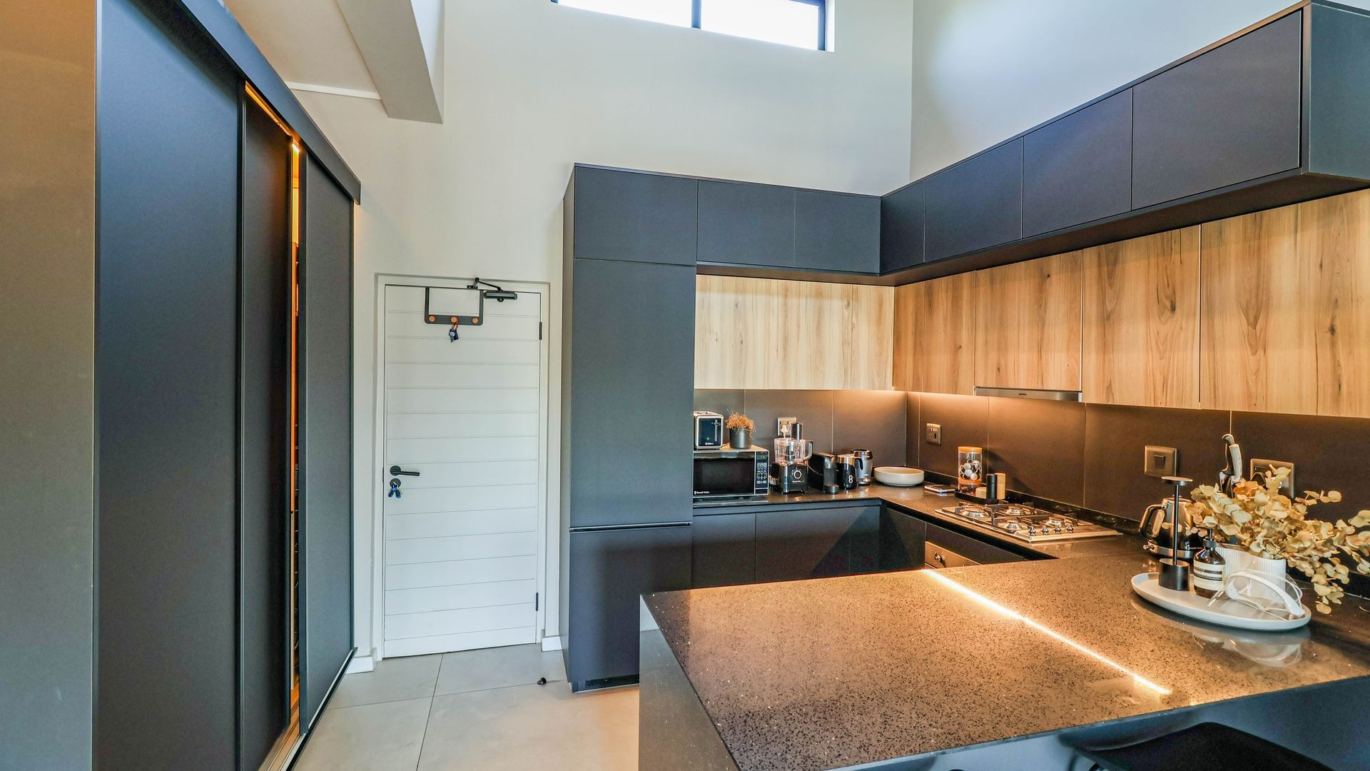 Walk into a welcoming home designed with the utmost taste. Well appointed kitchen with built in fridge, gas hob, oven and extractor. Kitchen has a closed off scullery for added neatness. Dishwasher ansd washing machine points. This stunning black and wood kitchen is a dream kitchen, finished with black granite tops. Breakfast bar counter.