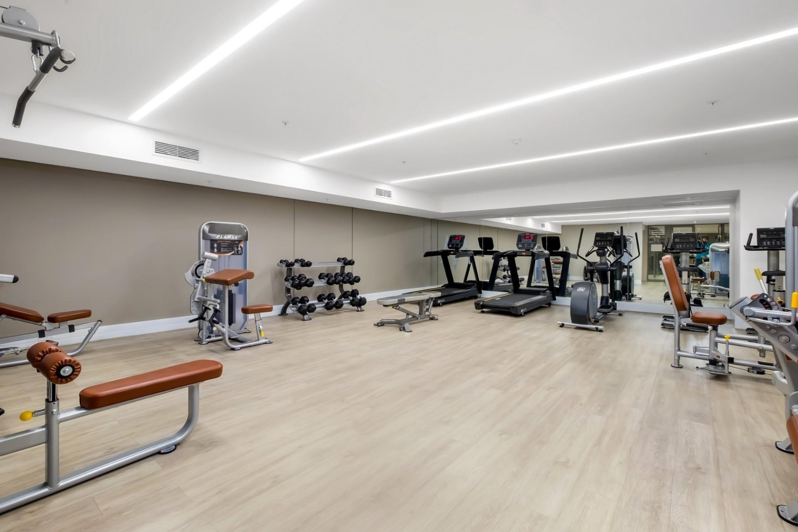 In the kitchen, the high gloss cabinets are complimented by Caesarstone counters and tiled floors which continue through to the living area where large windows offer remarkable views over the city.