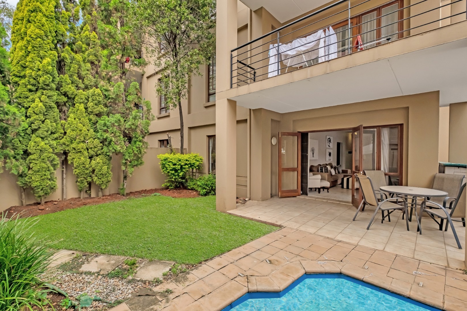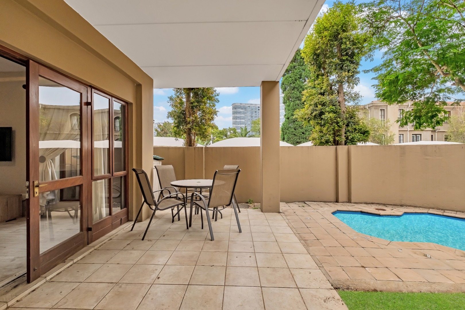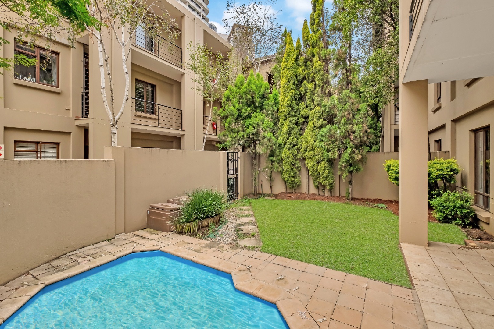 Full furnished executive ground floor apartment with private garden and splash pool within walking distance of Investec, Benmore Shopping Centre and Crawford Sandton. Ideal corporate rental. All amenities supplied – just bring your bags and move in!