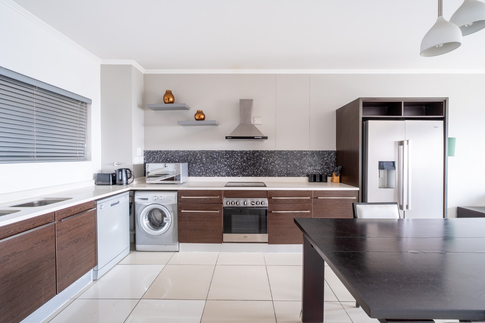 The space is finished off with a contemporary living room and dining area. A fully equipped kitchen is perfect.