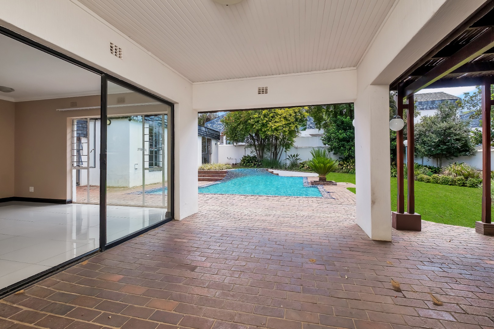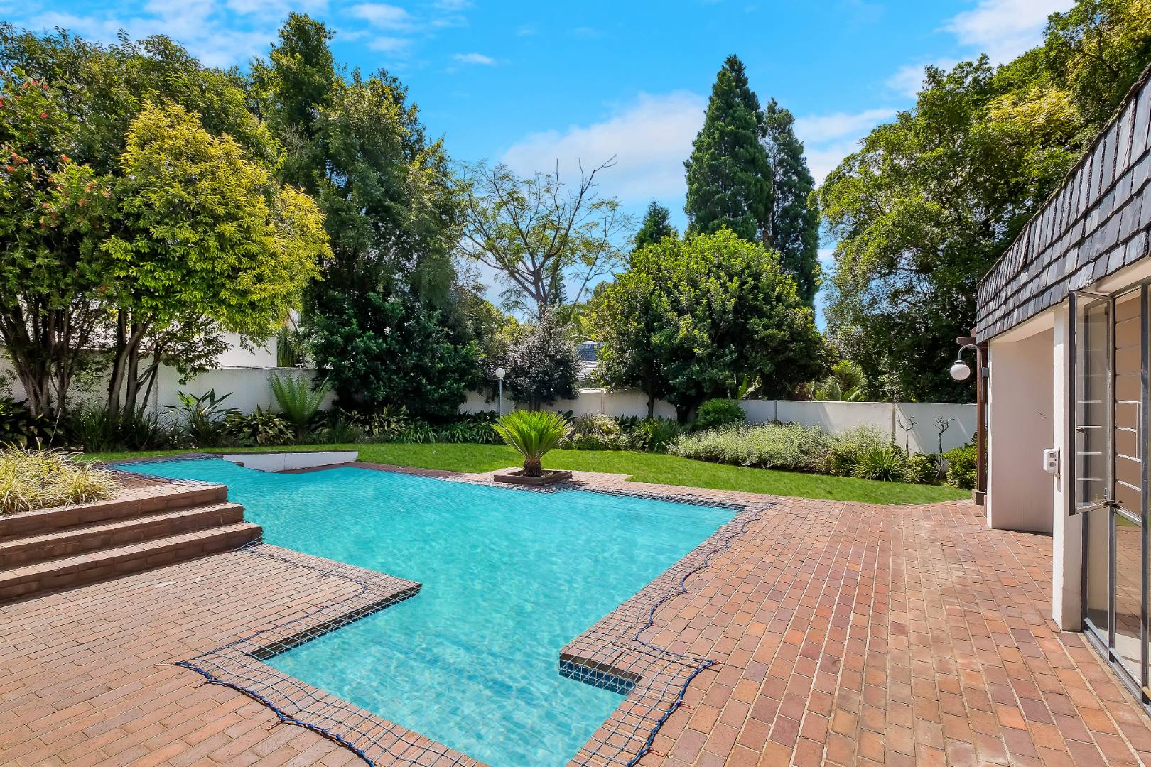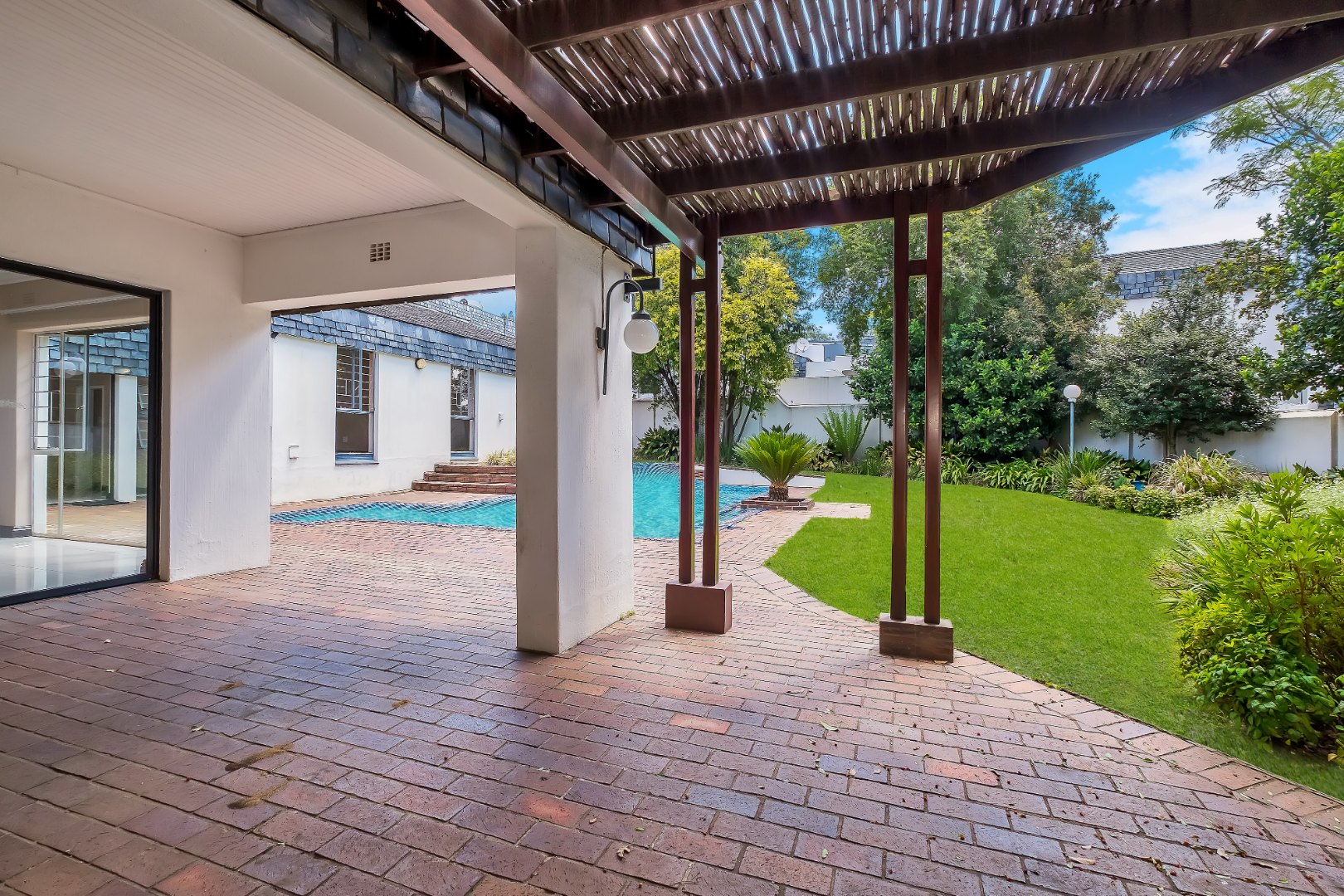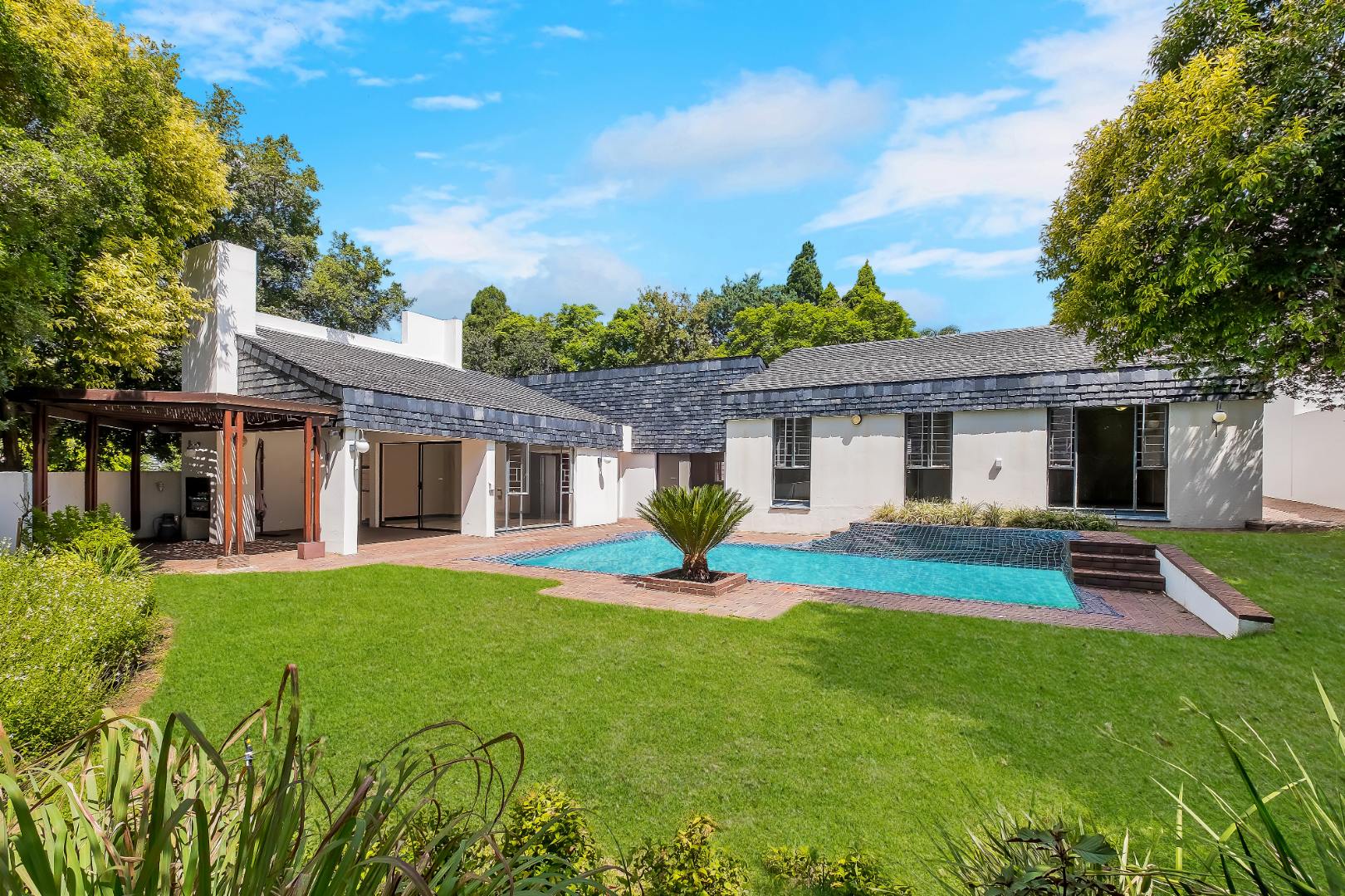 Two light and spacious living areas overlook the well-manicured private garden, good-sized sparkling pool and covered patio with built-in gas braai.