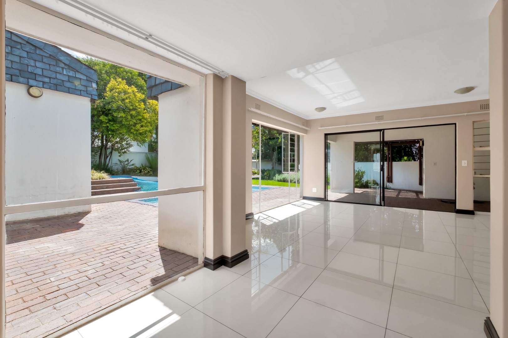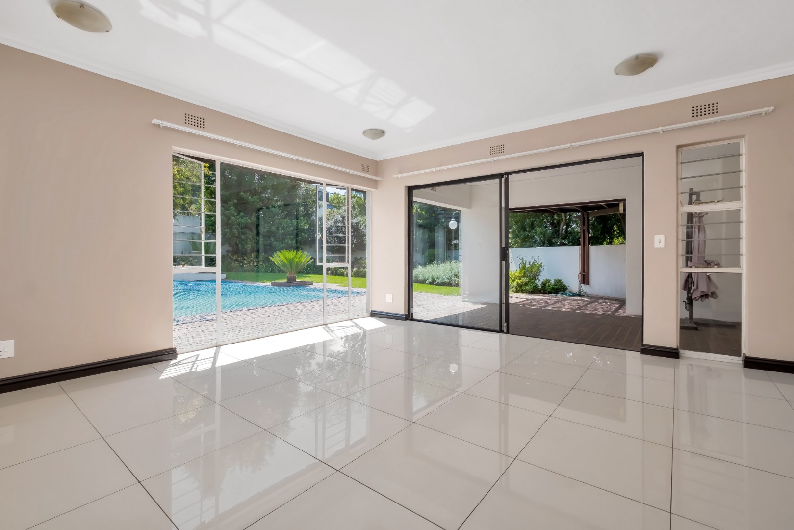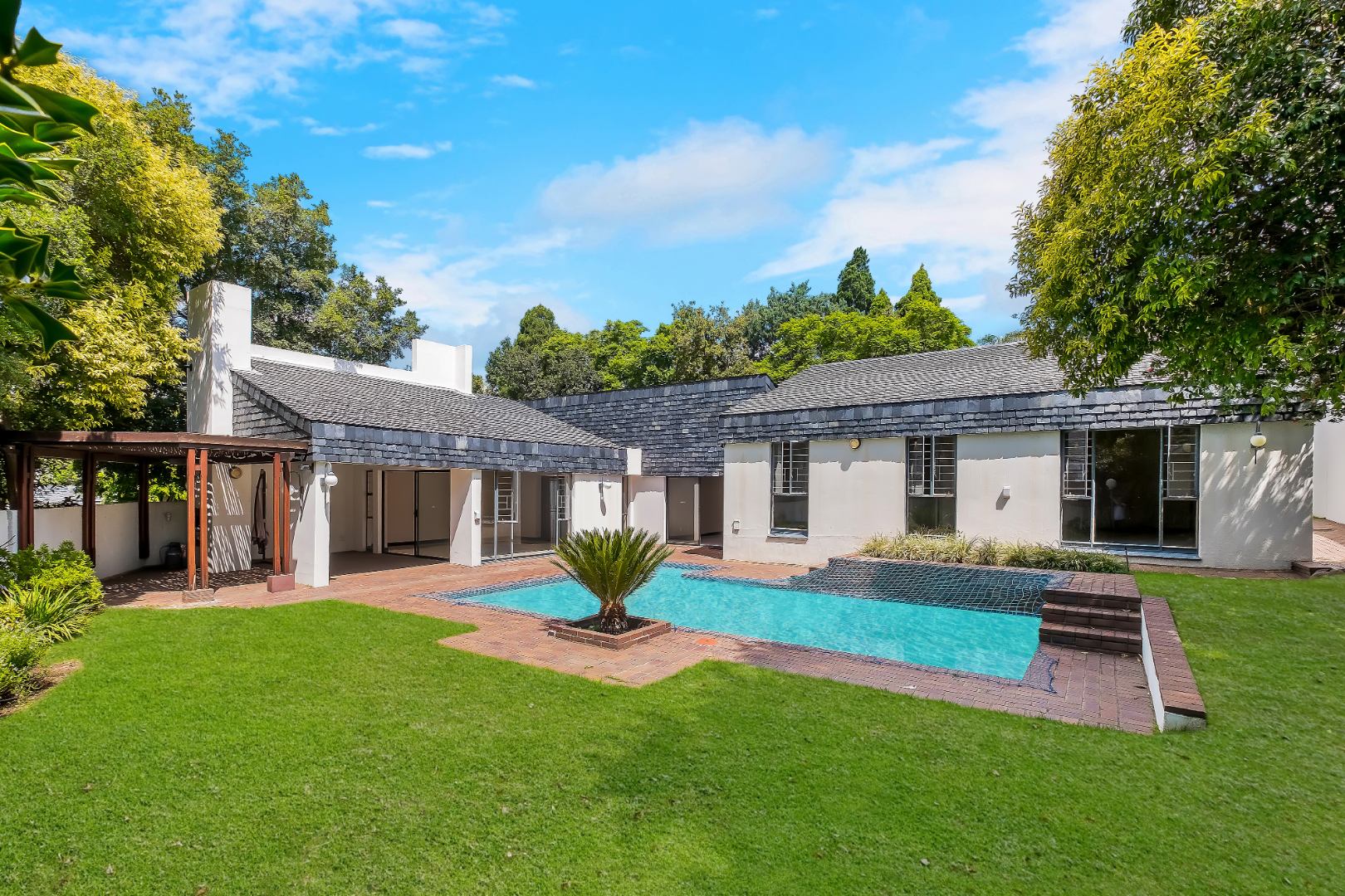 Two light and spacious living areas overlook the well-manicured private garden, good-sized sparkling pool and covered patio with built-in gas braai.