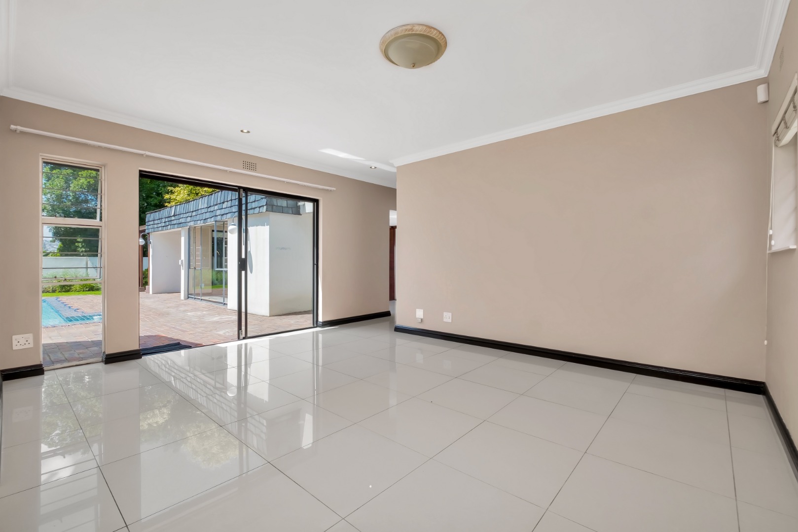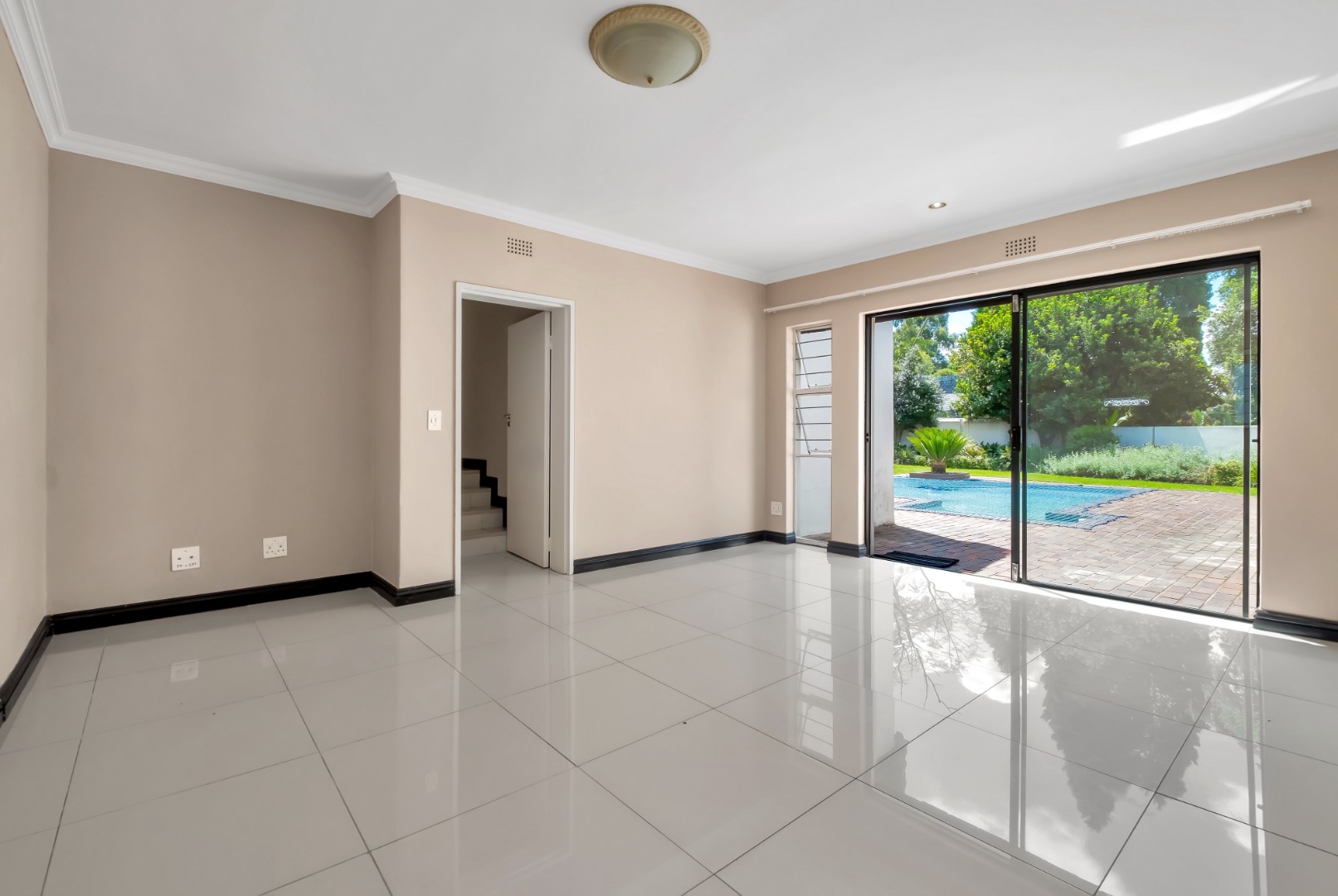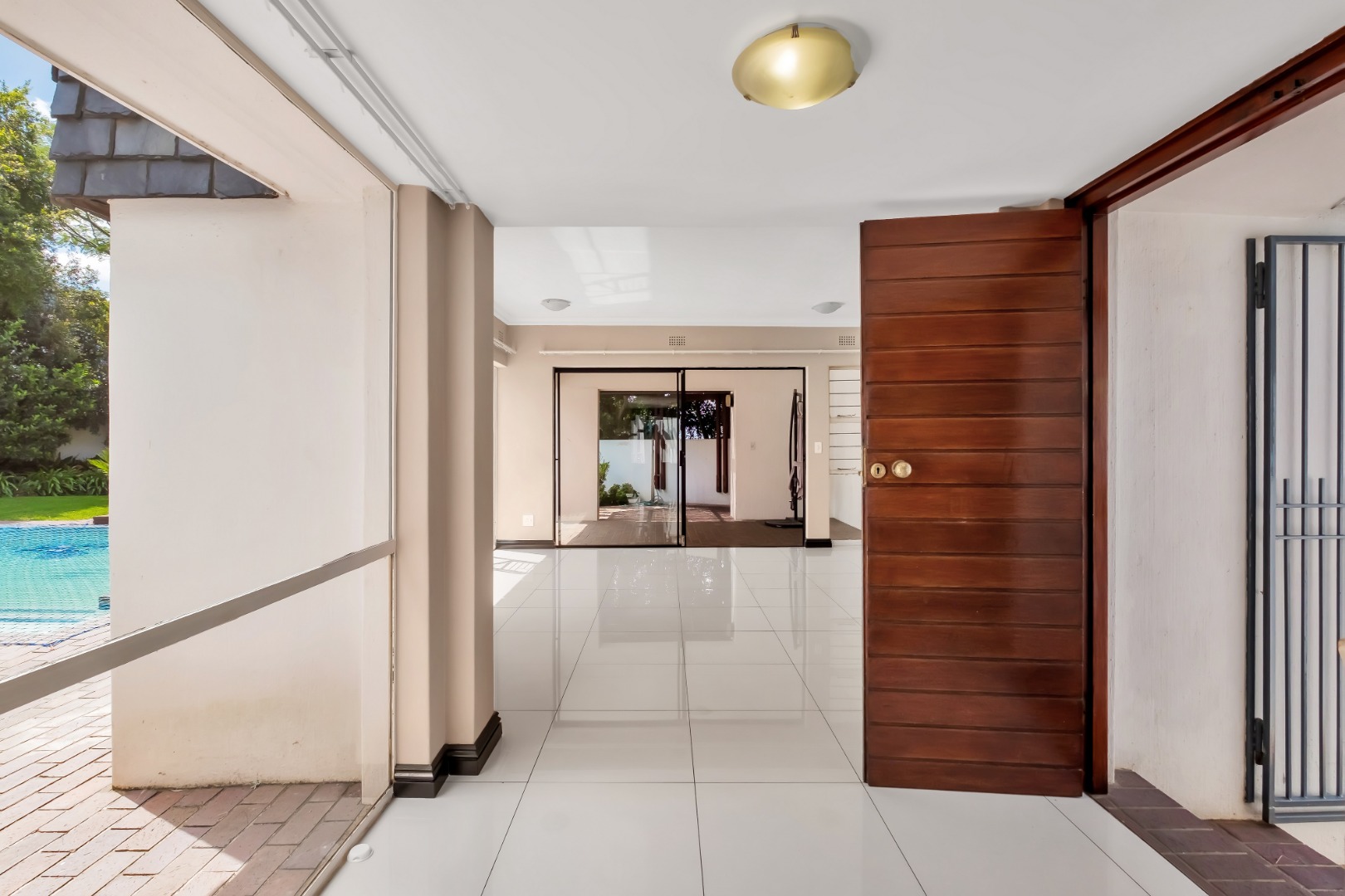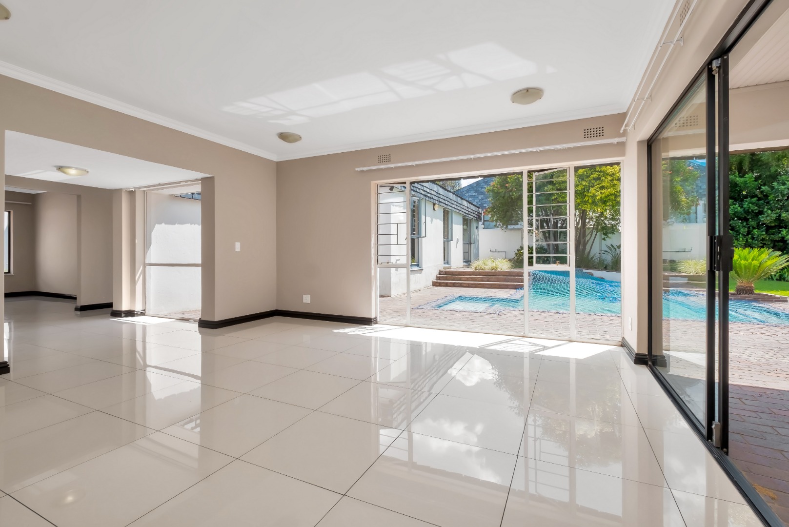 Two light and spacious living areas overlook the well-manicured private garden, good-sized sparkling pool and covered patio with built-in gas braai.