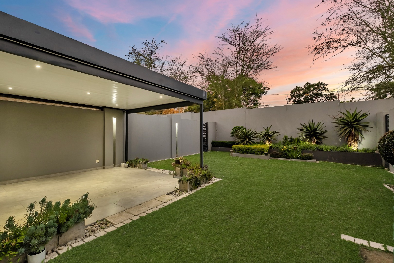 The open-plan living area is the heart of the home, combining a bespoke dining space with feature lighting, a beautifully curated designer kitchen, and a relaxed lounge that overlooks the garden. Stacker doors open to an enclosed patio which further extends to a spacious covered patio, the ideal setting for year-round entertaining with a delightful garden view.