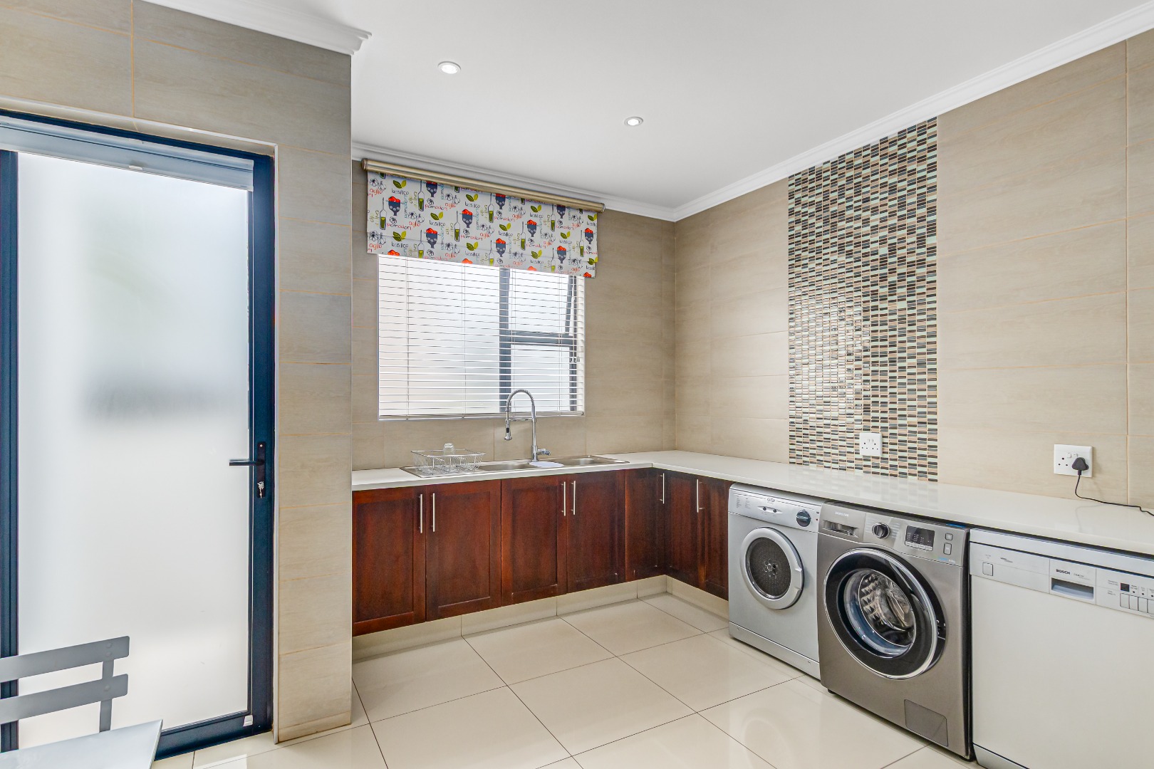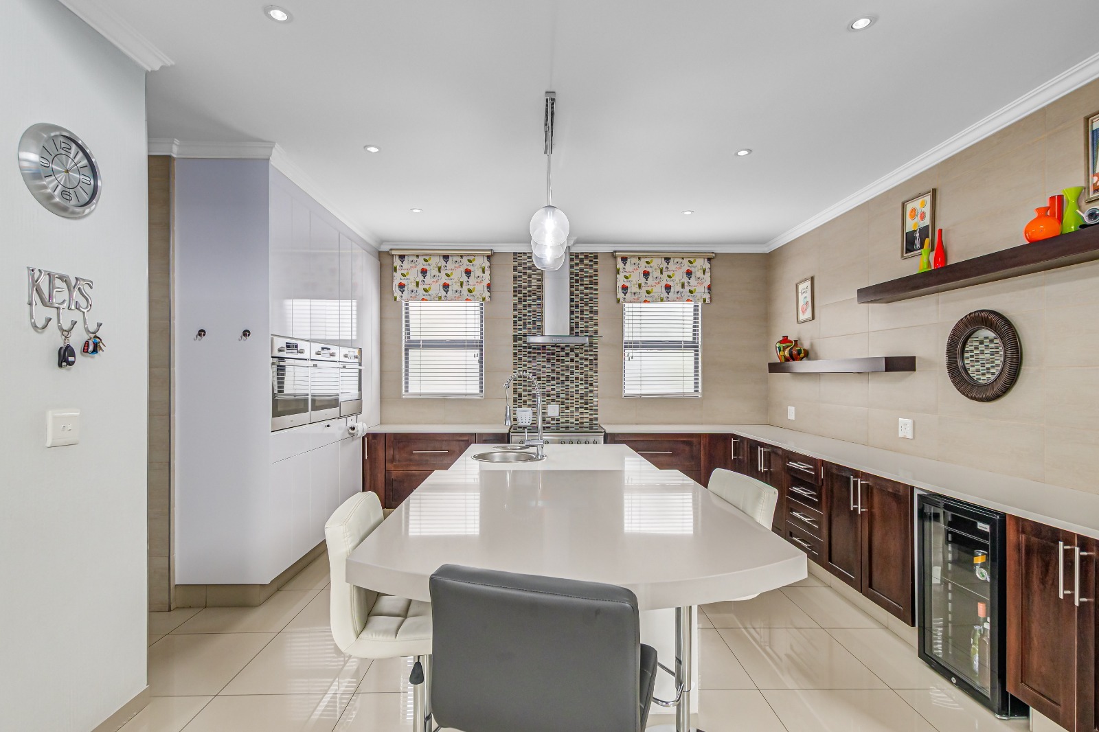 The modern open-plan kitchen is thoughtfully designed, offering a full gas stove and oven, two additional electric ovens, and an integrated oven. A separate scullery and pantry provide ample storage and functionality, catering effortlessly to both everyday living and entertaining.