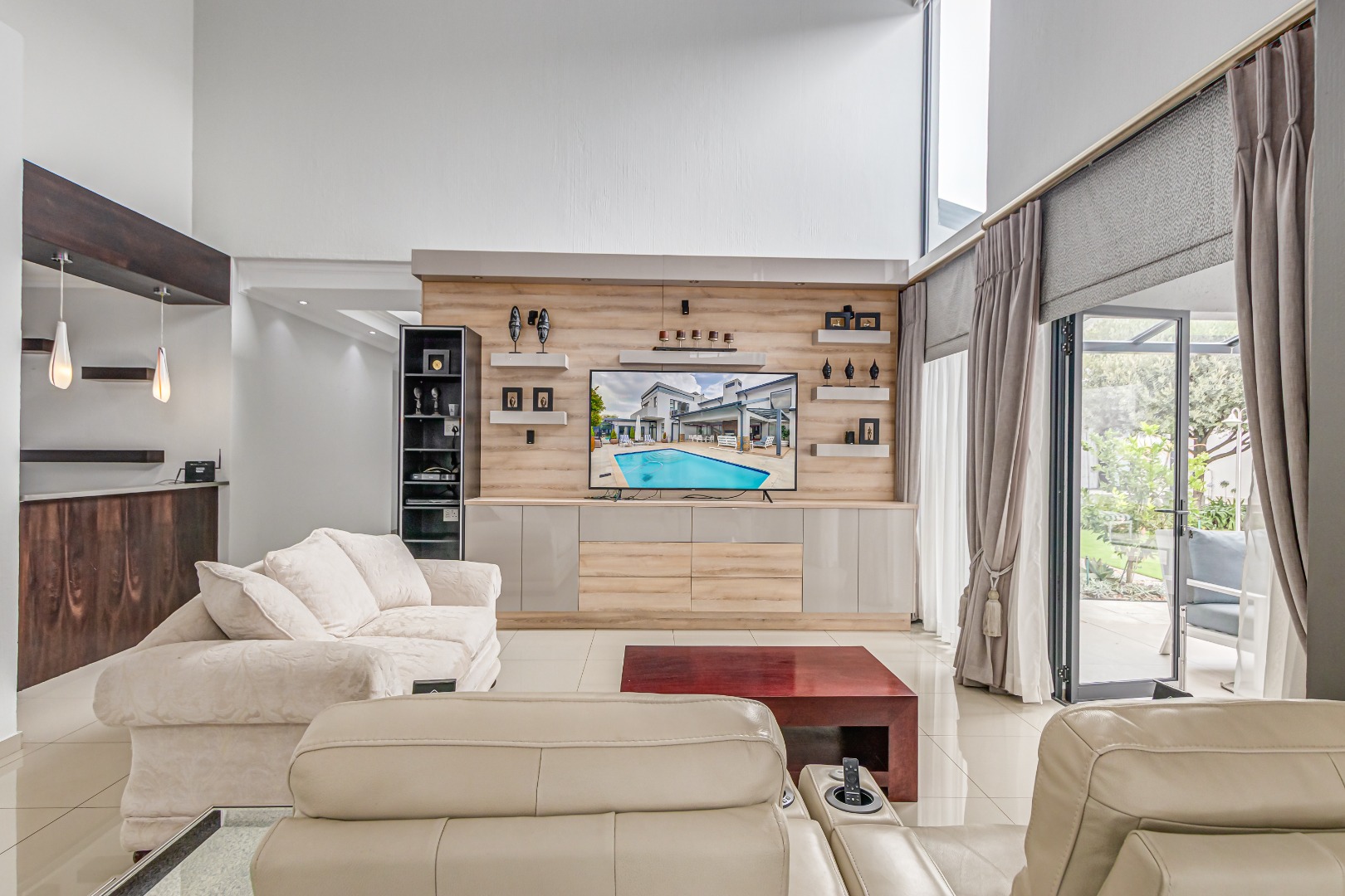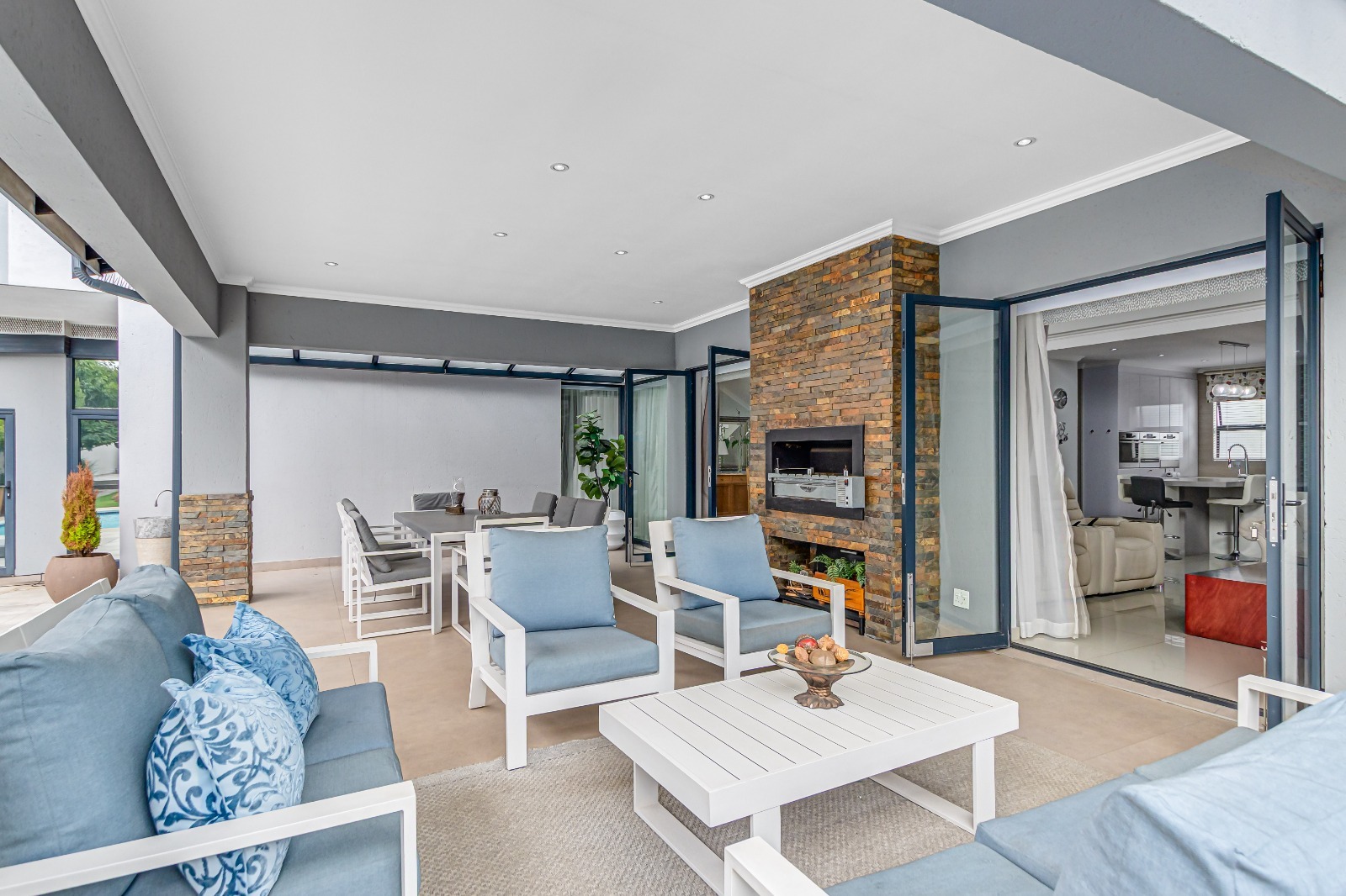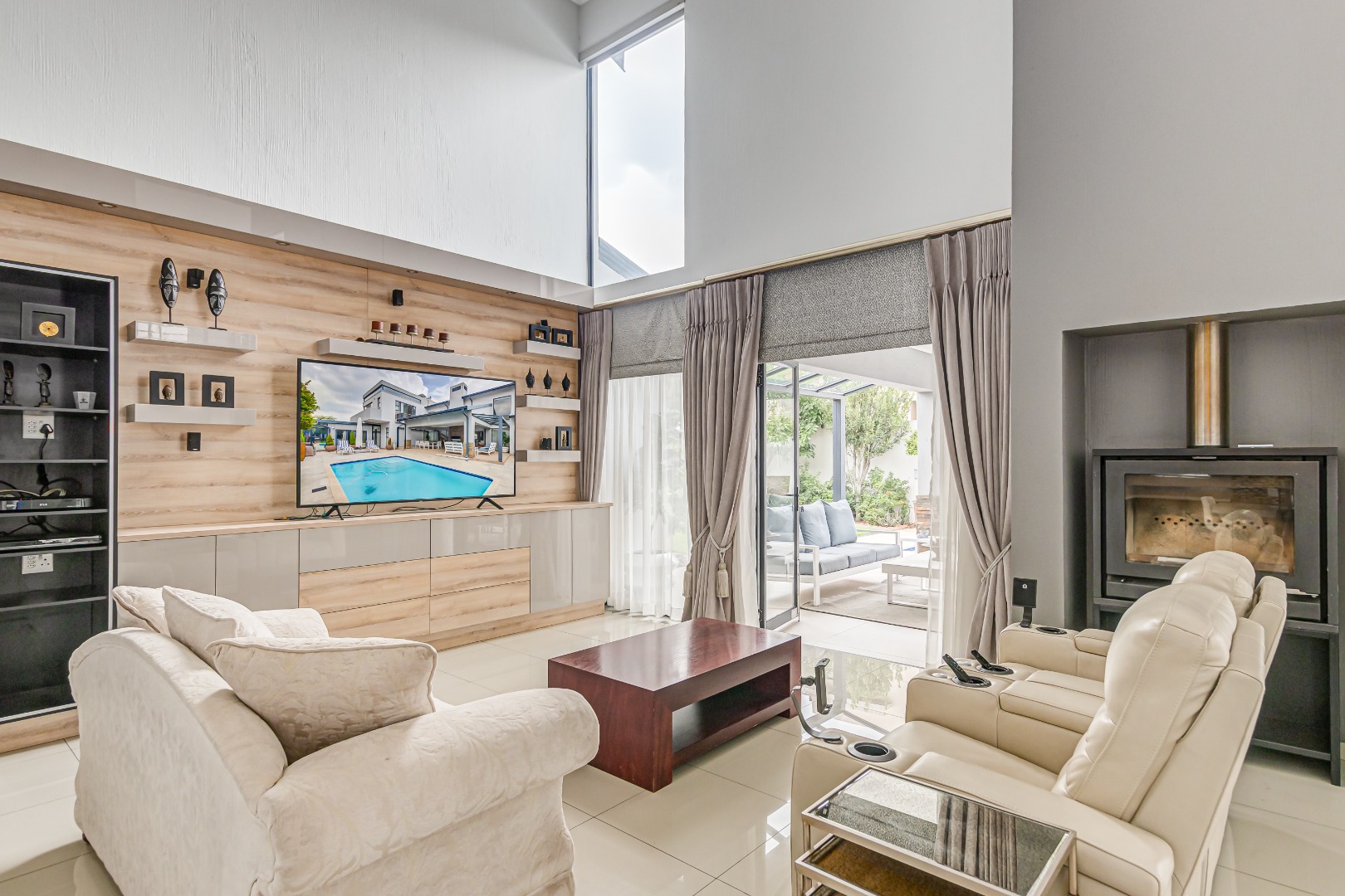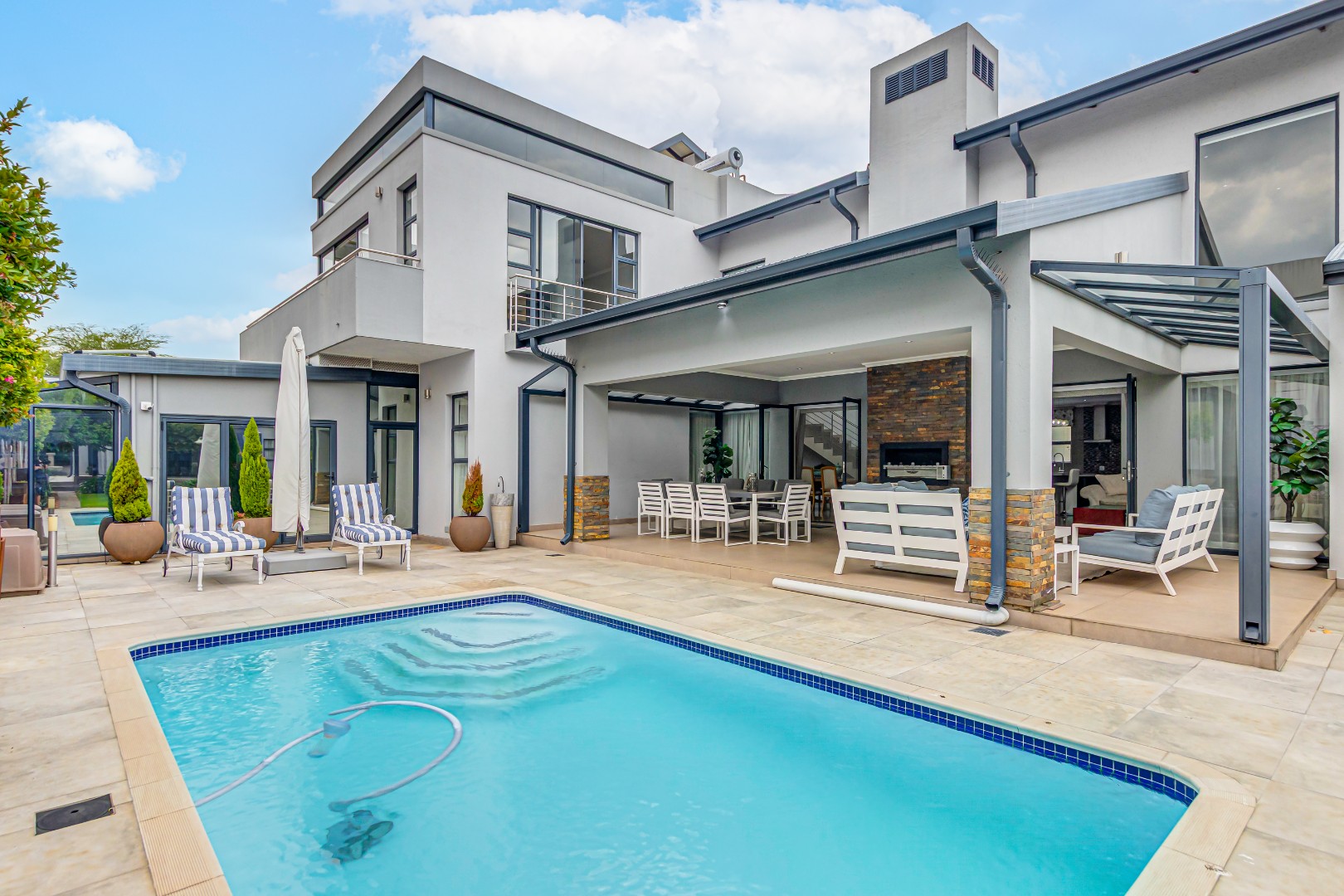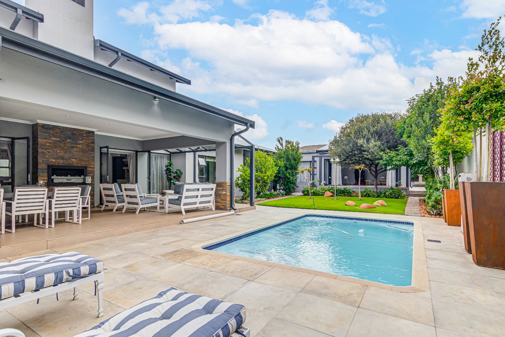Multiple living areas include a stylish TV lounge with a gas fireplace, a formal or family lounge overlooking the garden, and an open-plan dining room that seamlessly connects to the covered entertainment patio. This inviting outdoor space is complete with a built-in braai and overlooks a sparkling, heated swimming pool and well-established garden, perfect for year-round enjoyment.