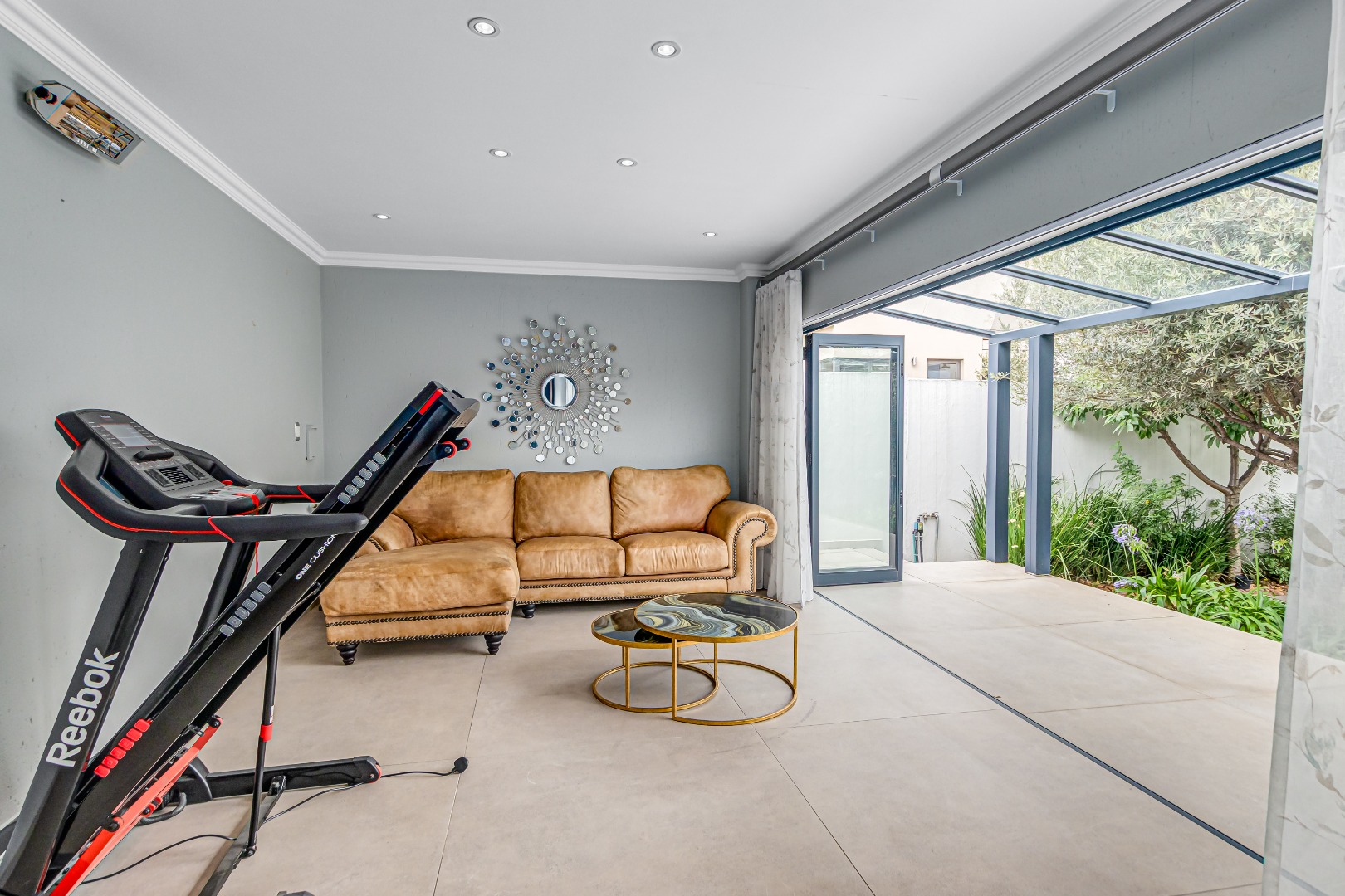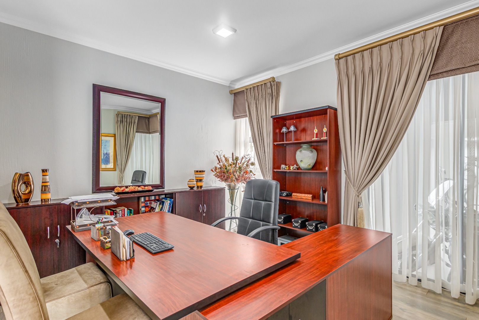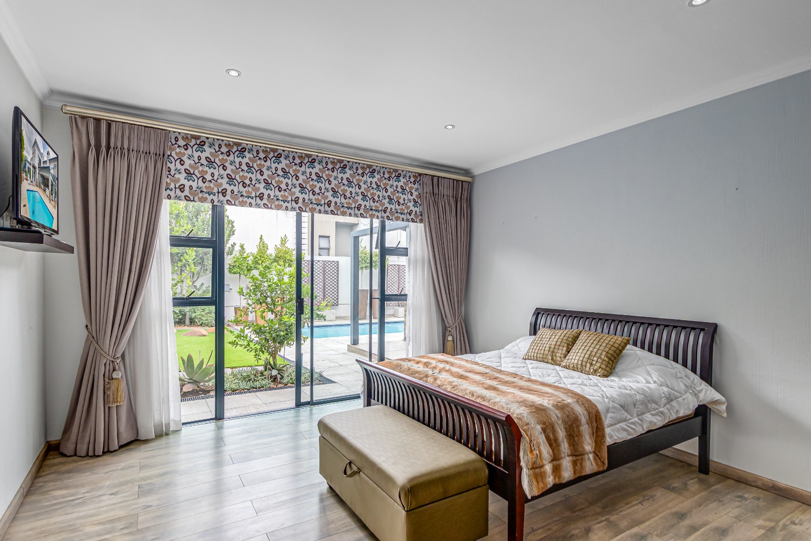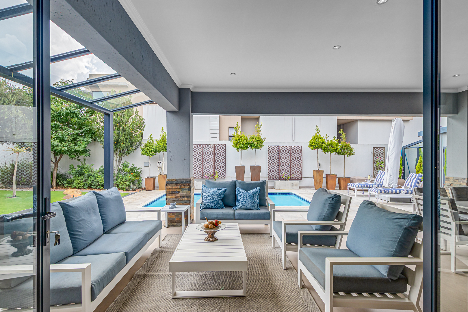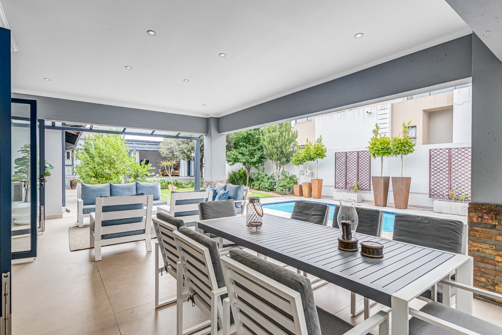 Multiple living areas include a stylish TV lounge with a gas fireplace, a formal or family lounge overlooking the garden, and an open-plan dining room that seamlessly connects to the covered entertainment patio. This inviting outdoor space is complete with a built-in braai and overlooks a sparkling, heated swimming pool and well-established garden, perfect for year-round enjoyment.