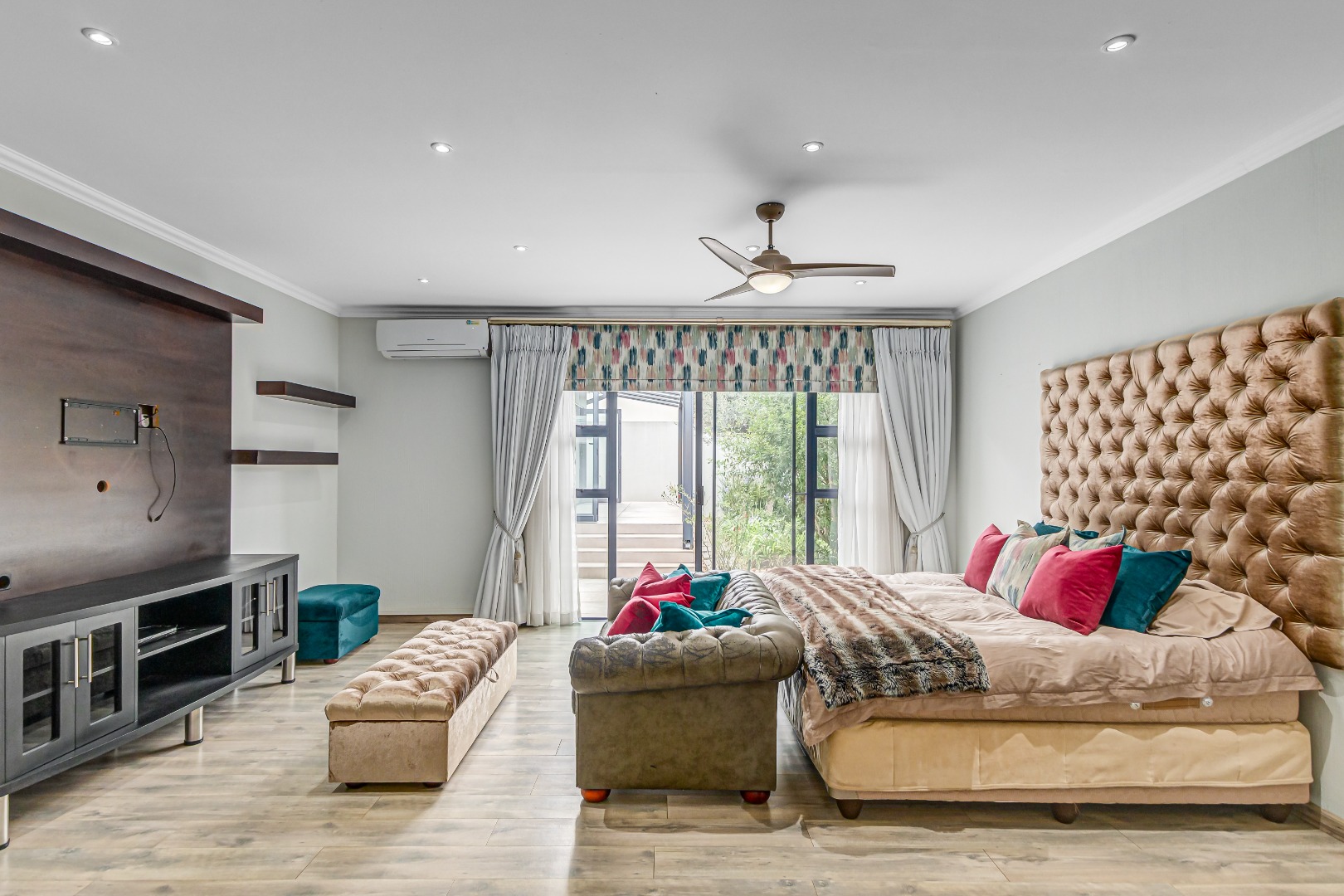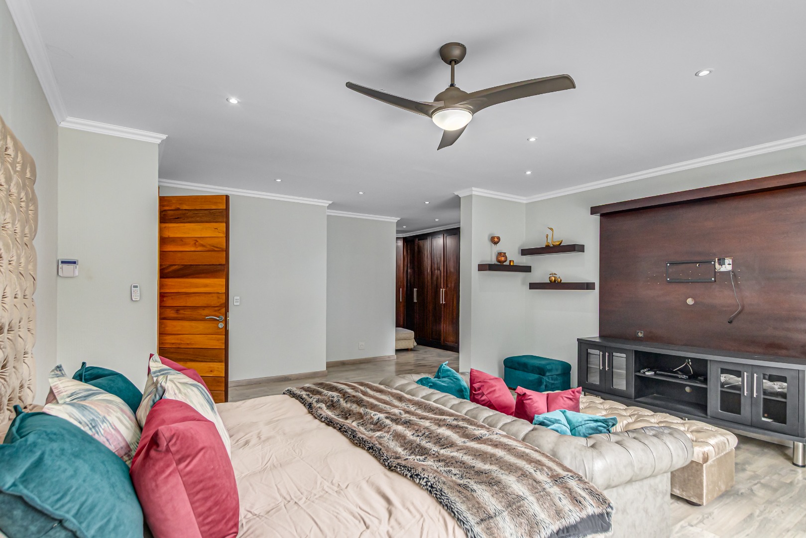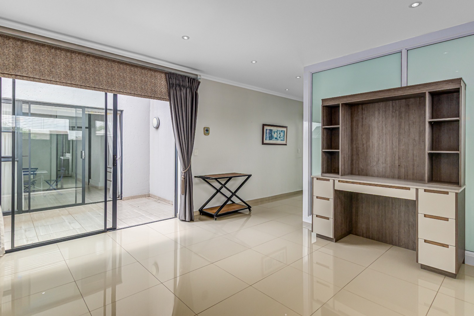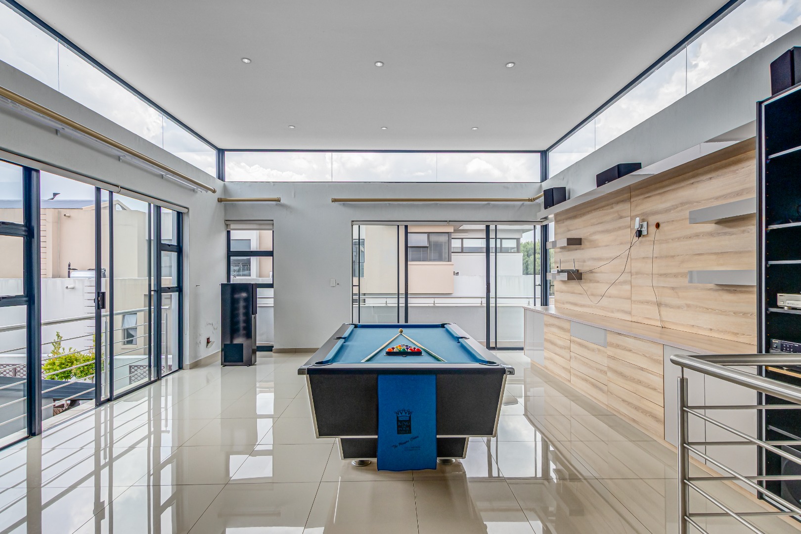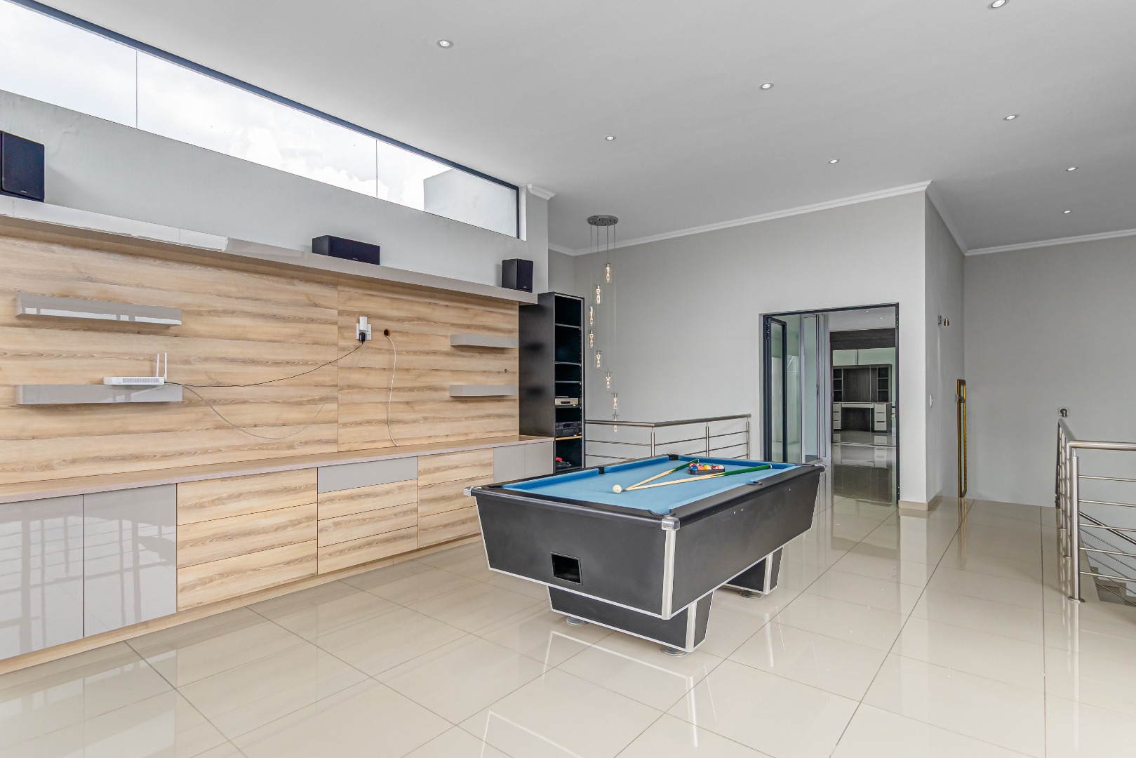 Upstairs, a spacious additional living area with a built-in wall unit opens onto a private patio, creating an ideal family entertainment or relaxation space.