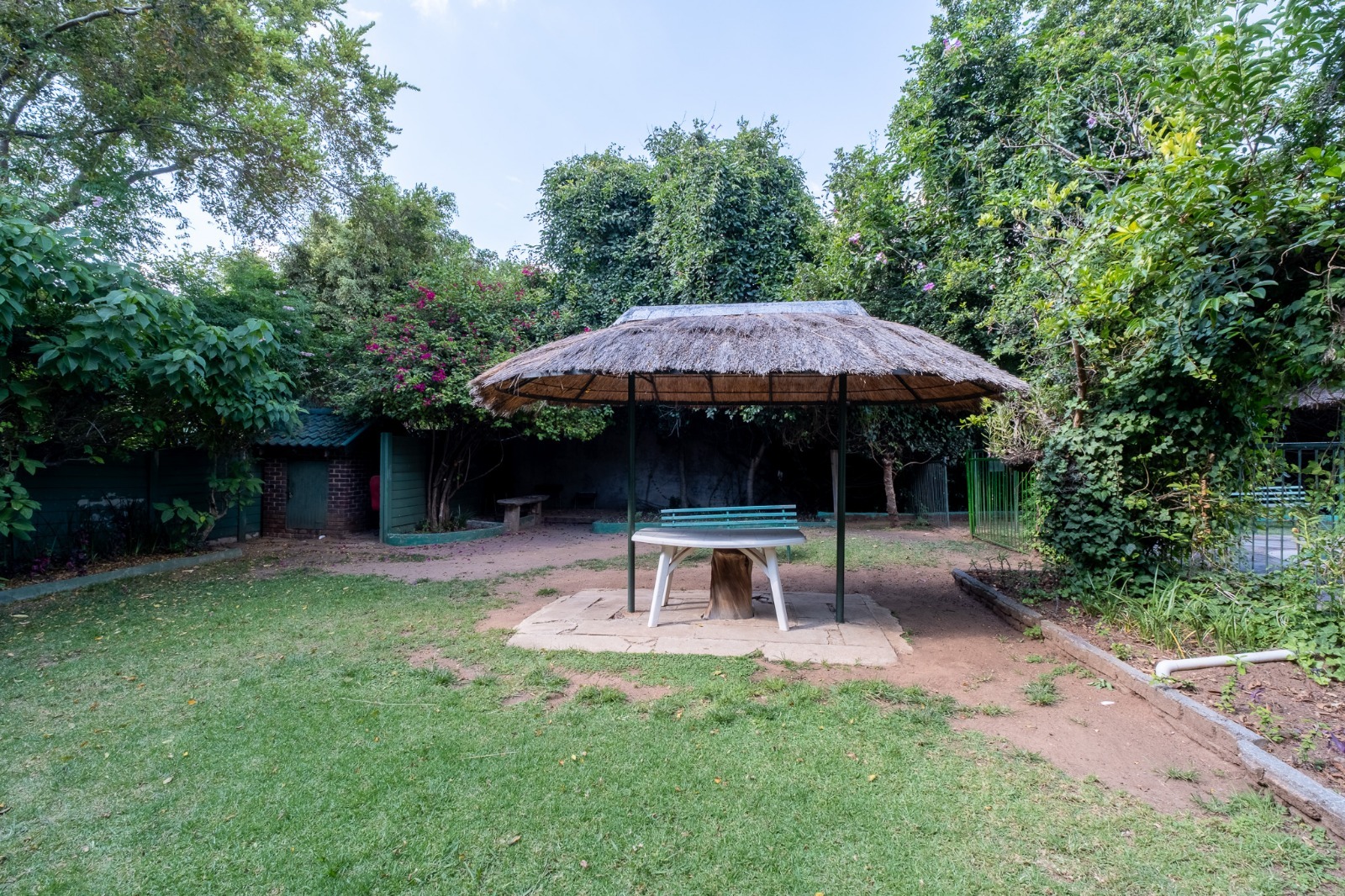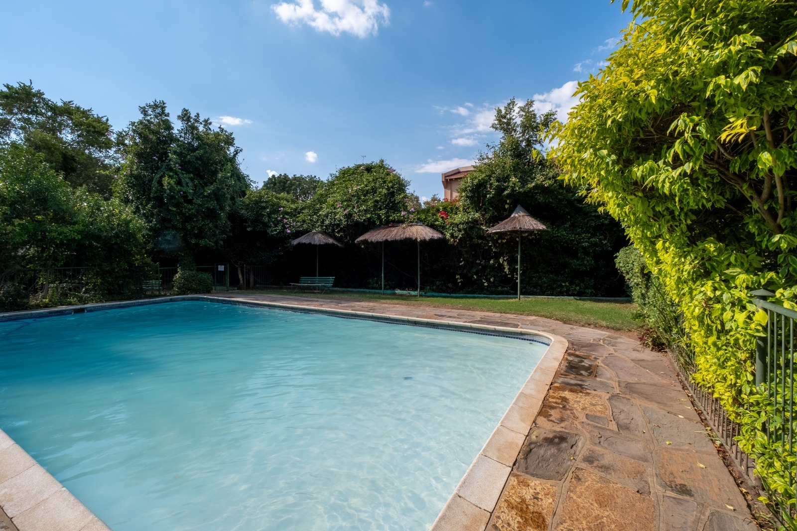Large swimming pool. Communal braai area in a lush garden.