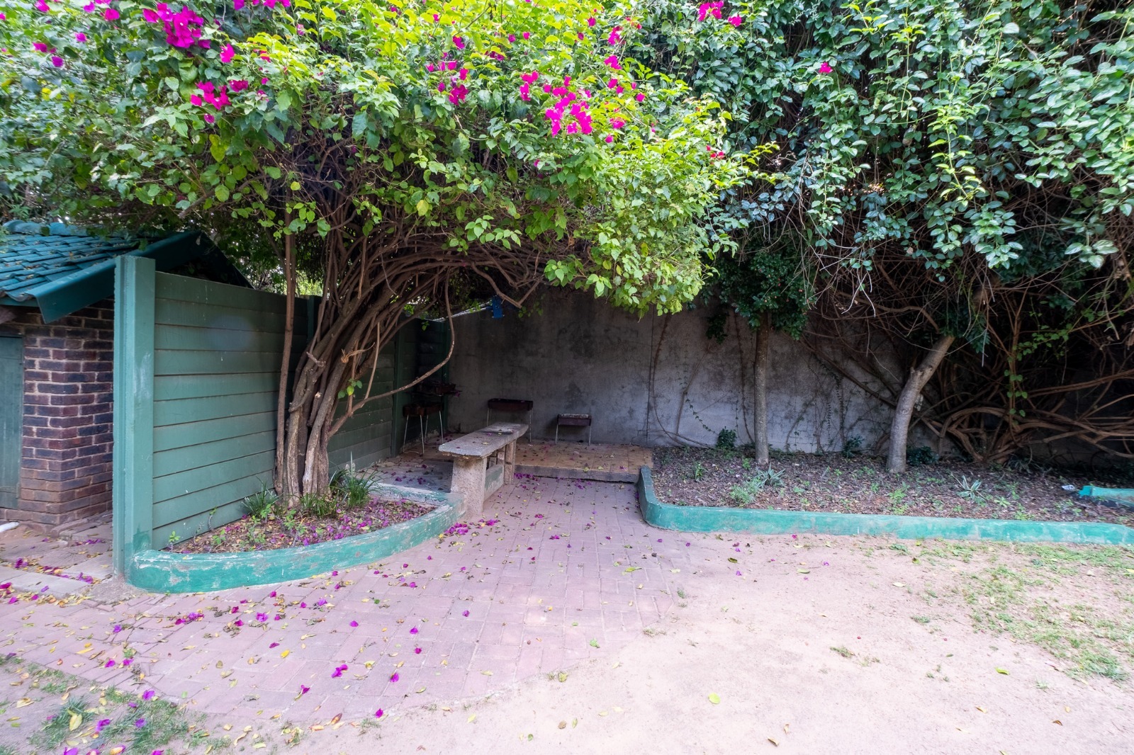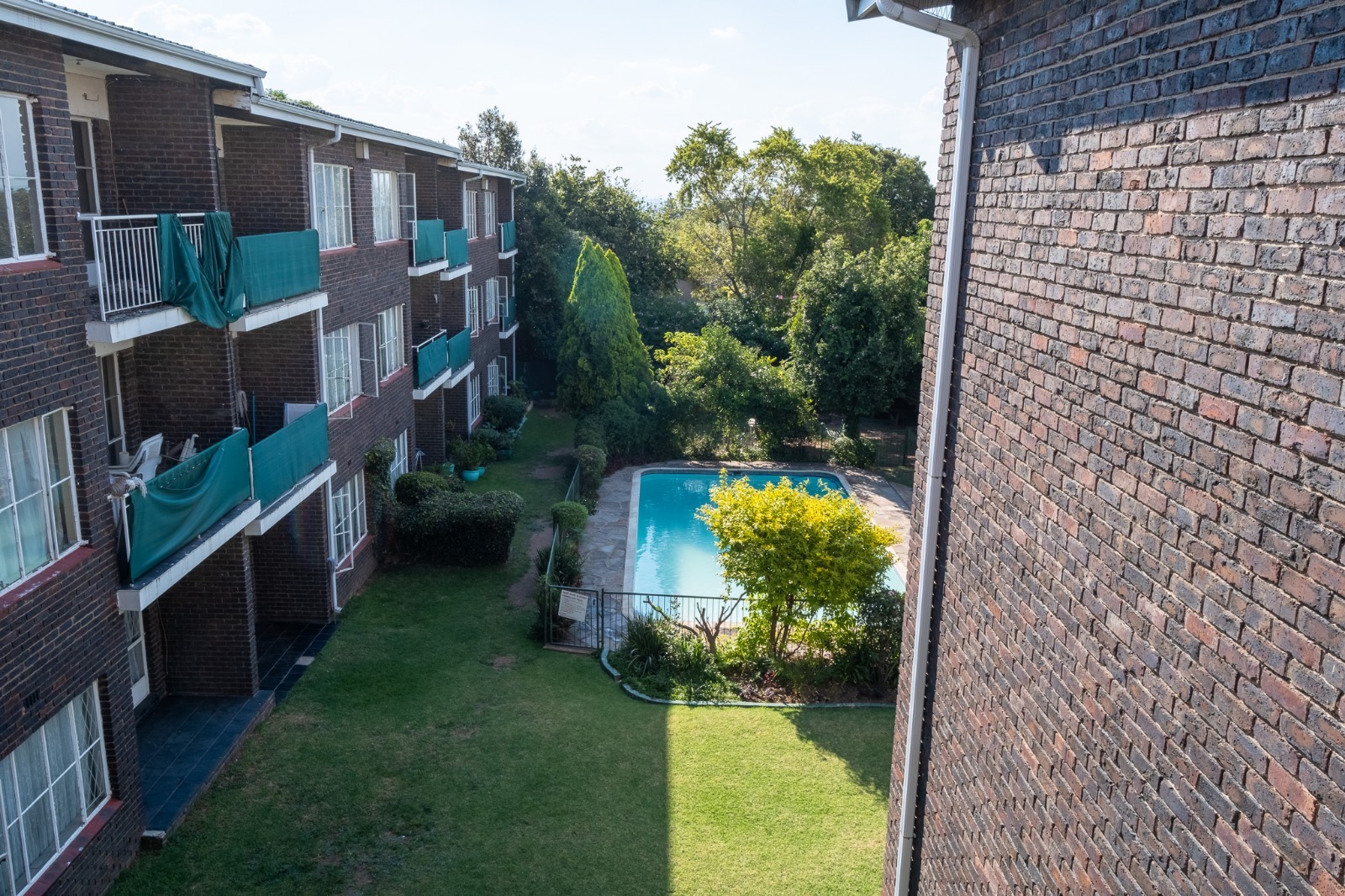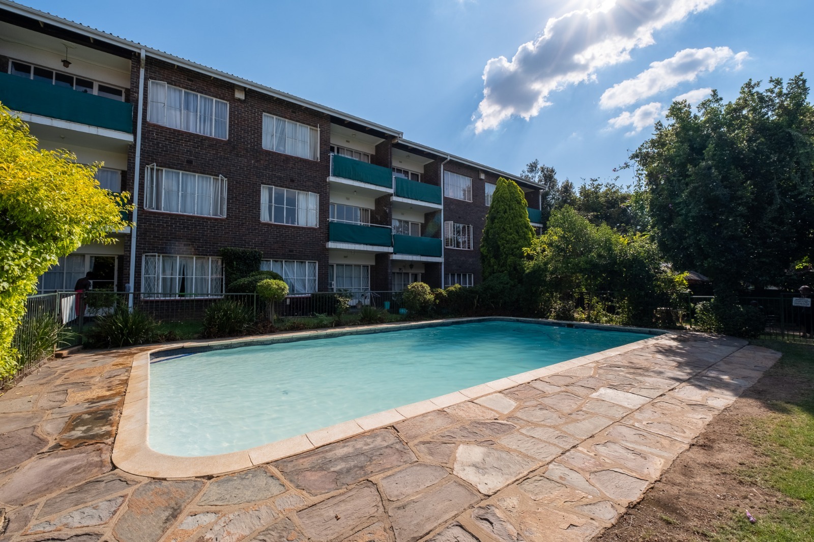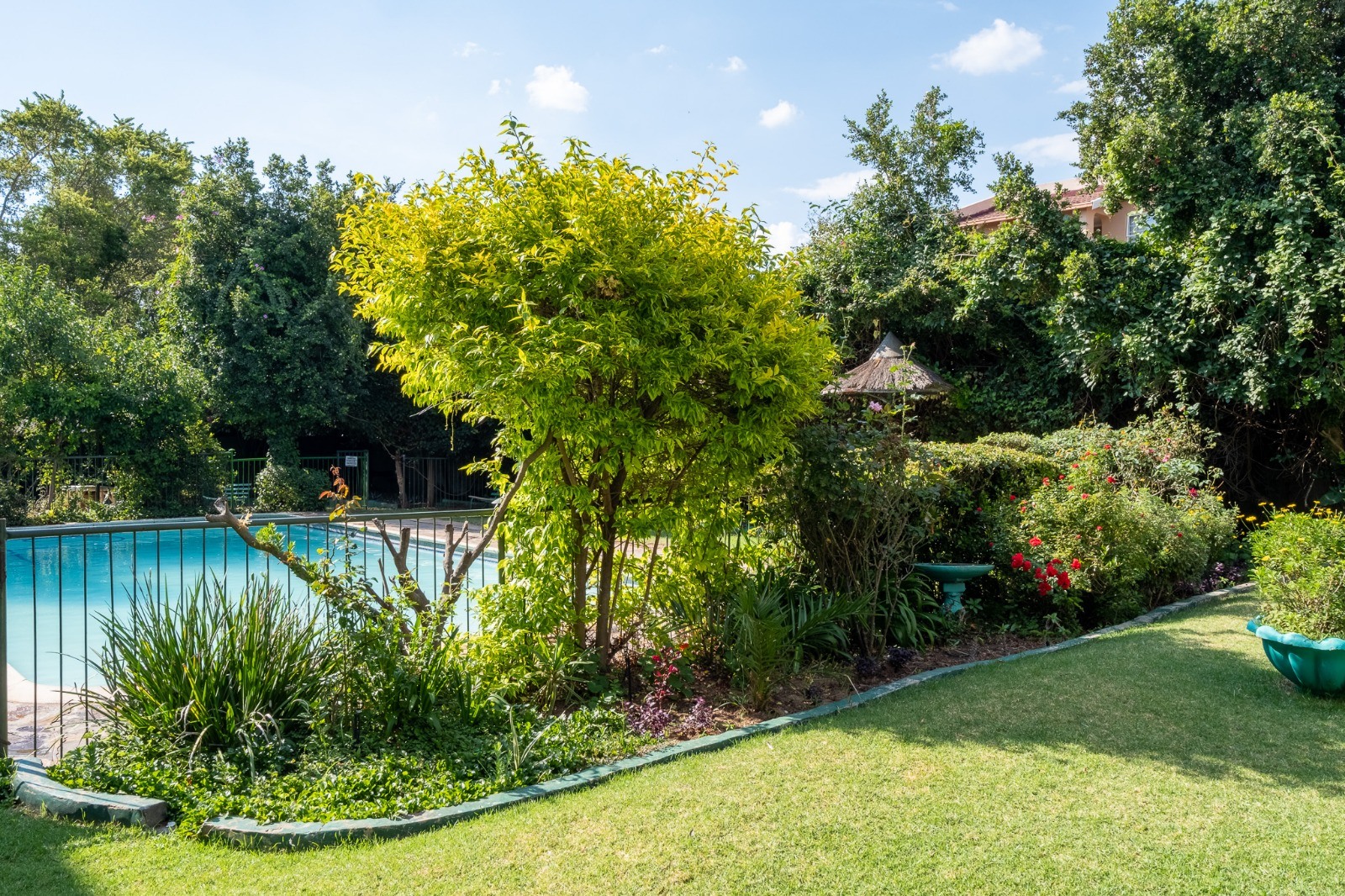 Large swimming pool. Communal braai area in a lush garden.