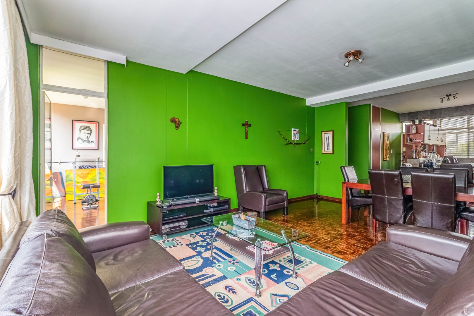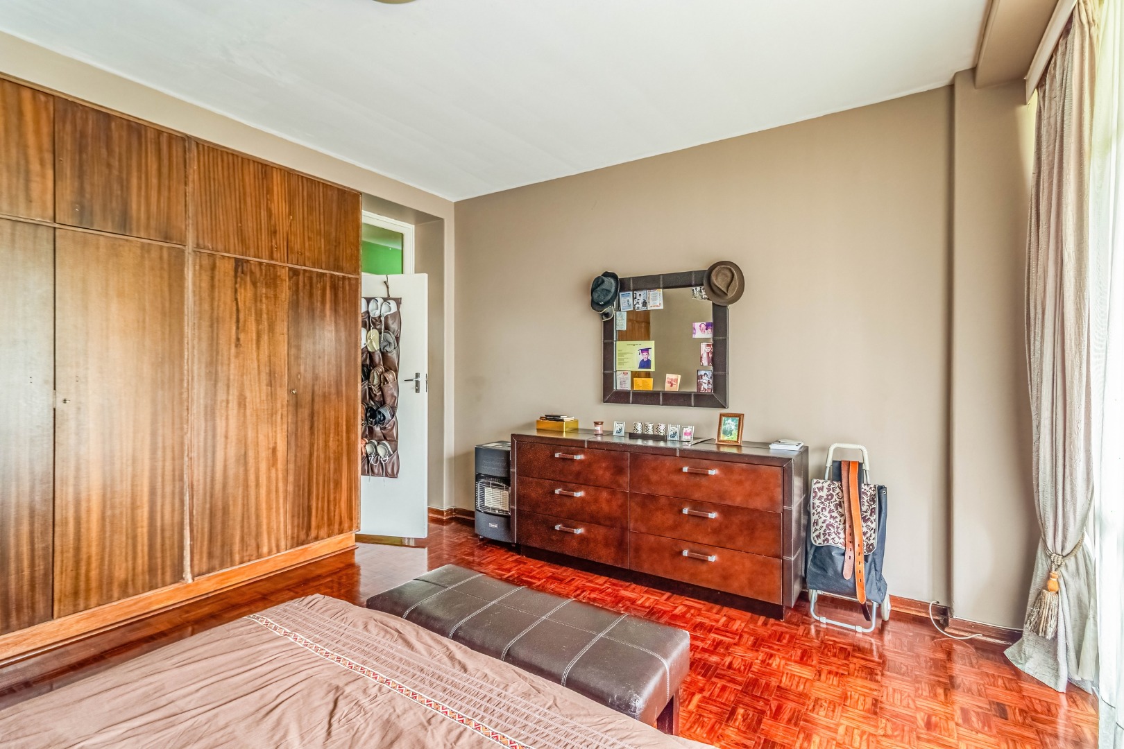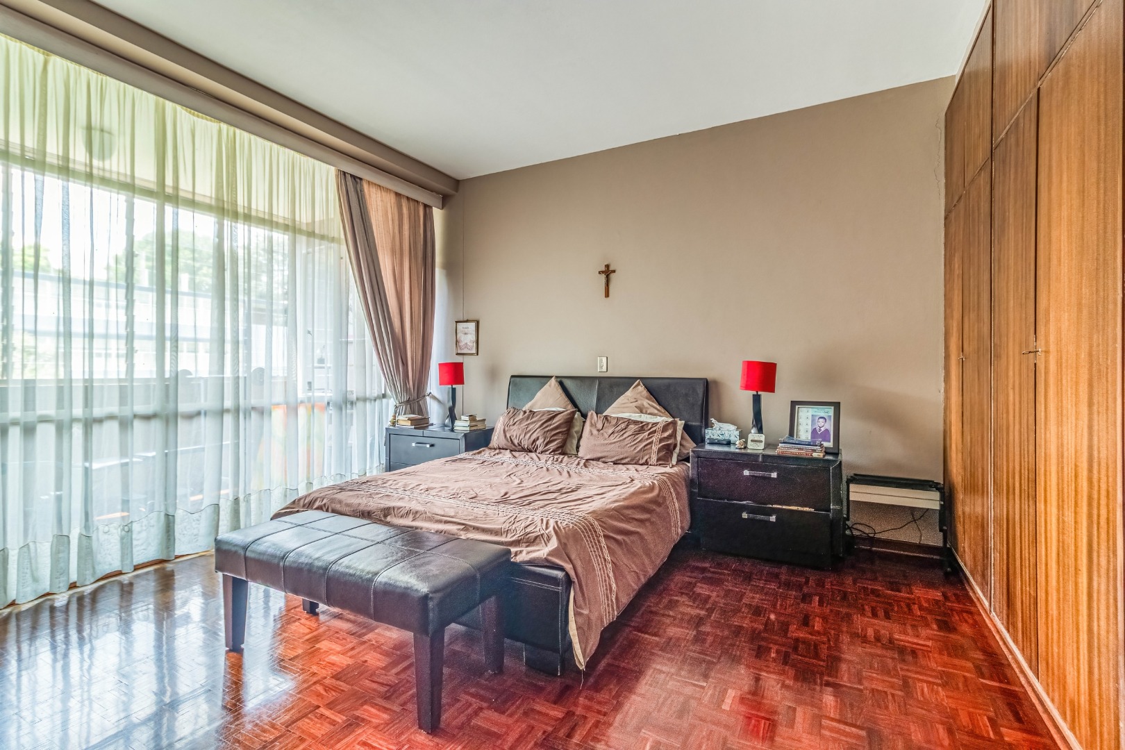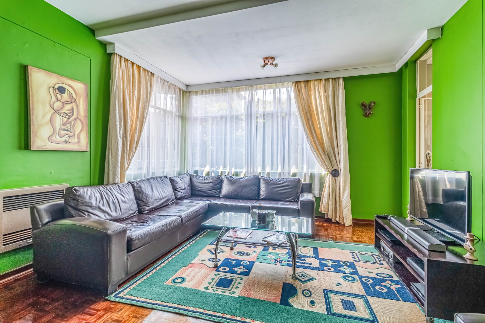Parquet wooden floors throughout, old-world-sized living & dining room leading to enclosed patio with aluminium sliders.