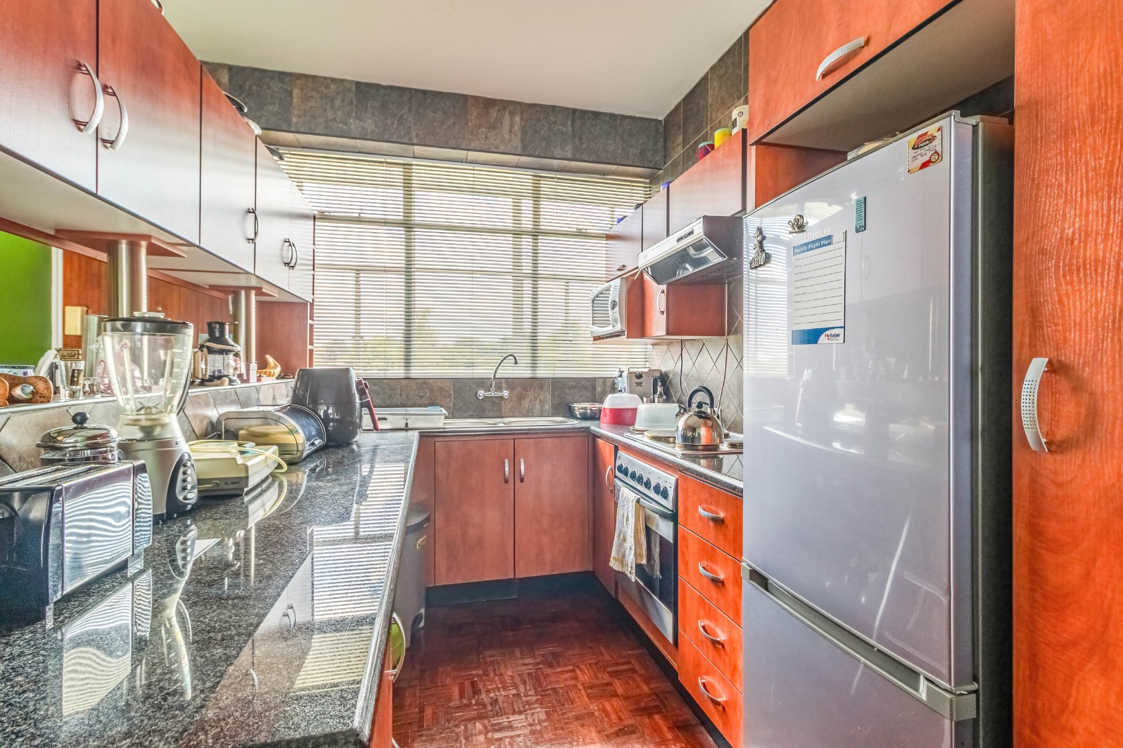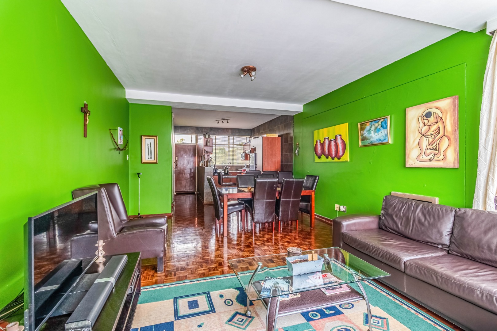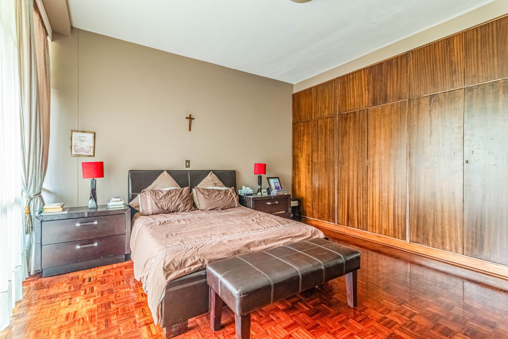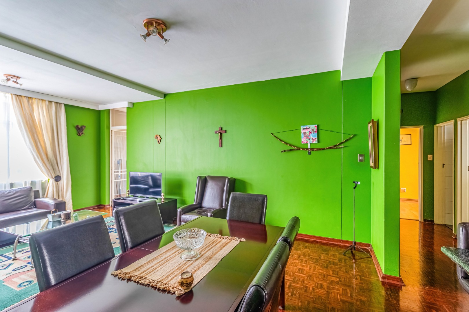 Parquet wooden floors throughout, old-world-sized living & dining room leading to enclosed patio with aluminium sliders.