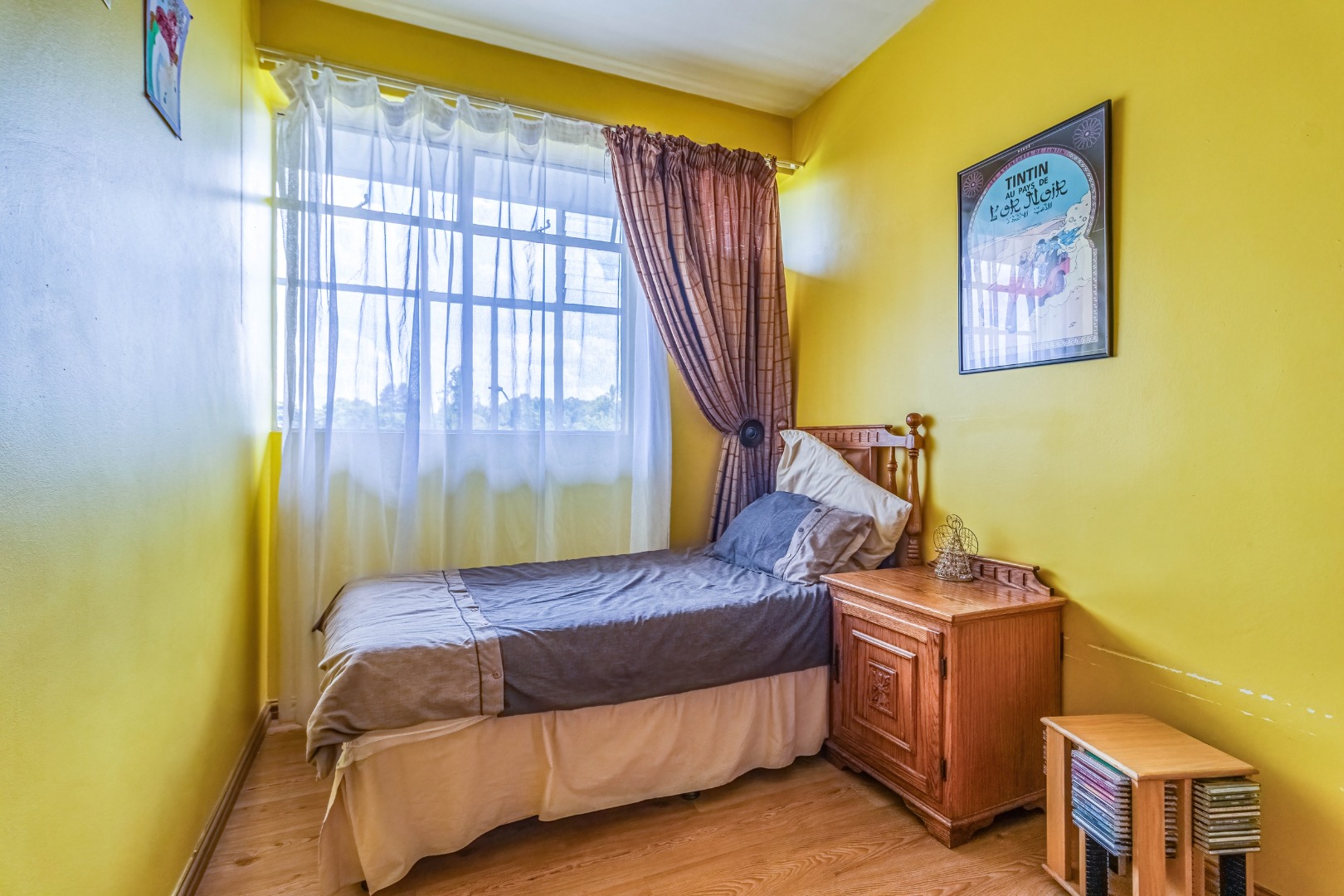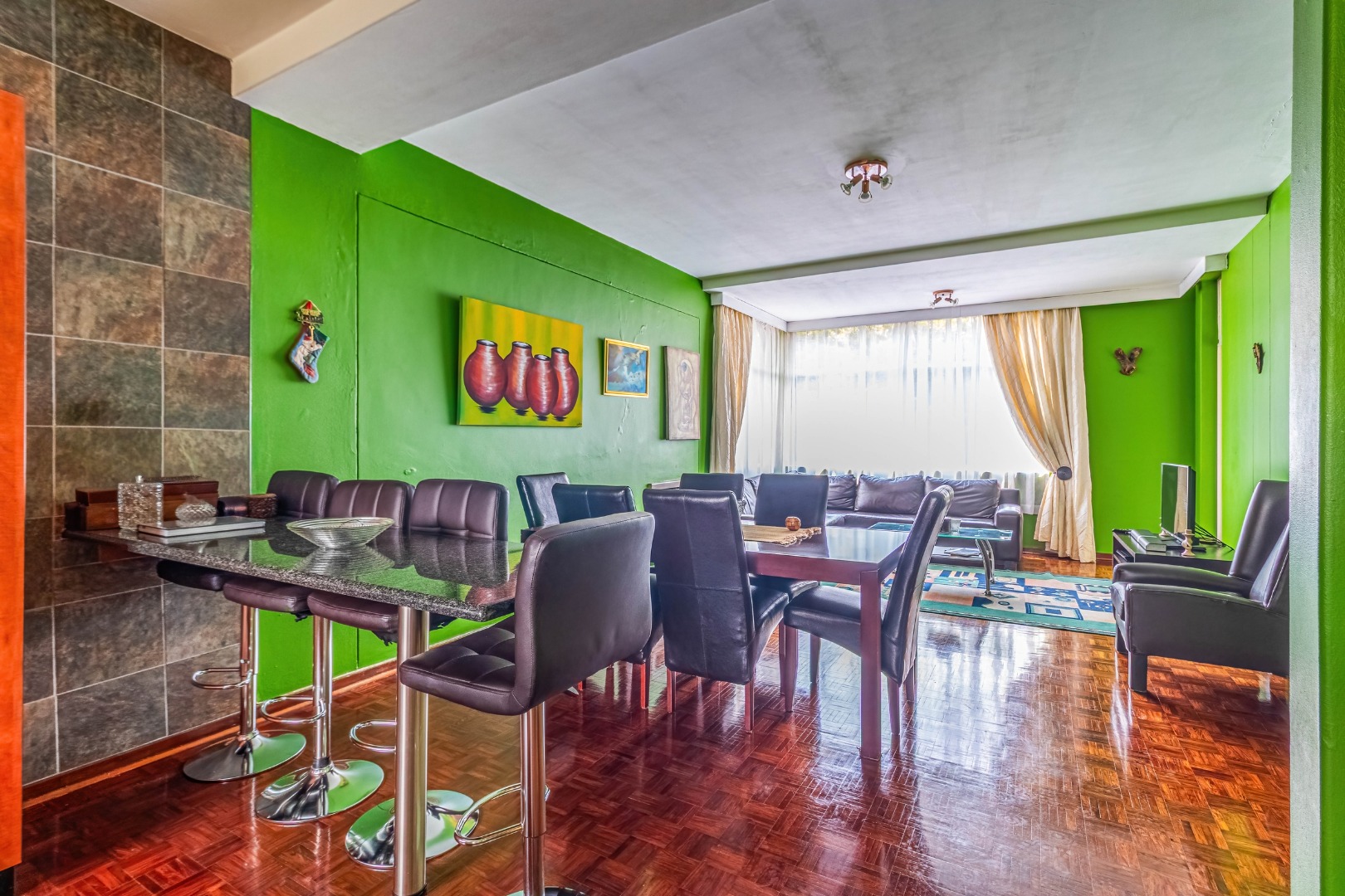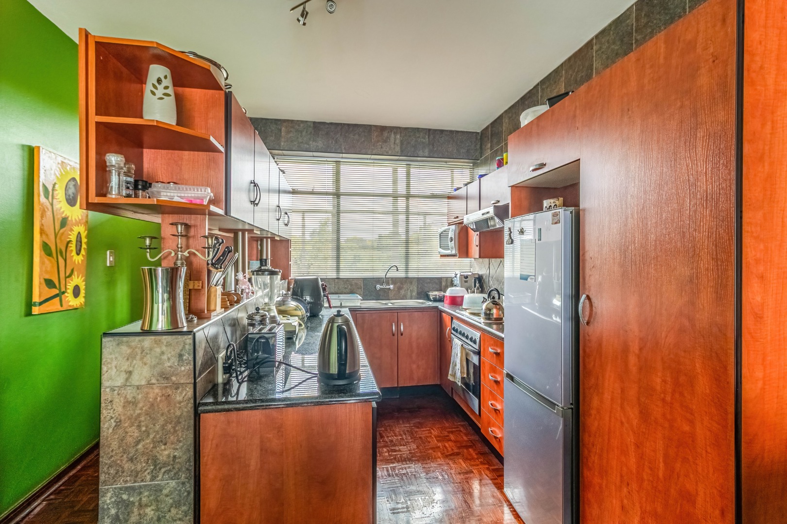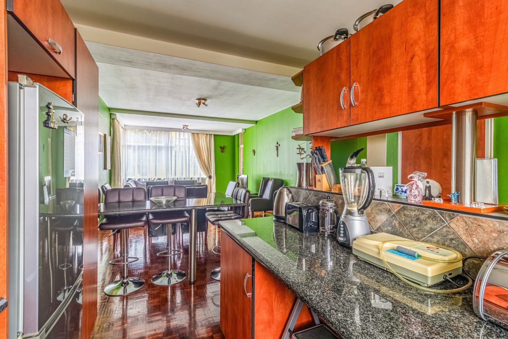 Parquet wooden floors throughout, old-world-sized living & dining room leading to enclosed patio with aluminium sliders.