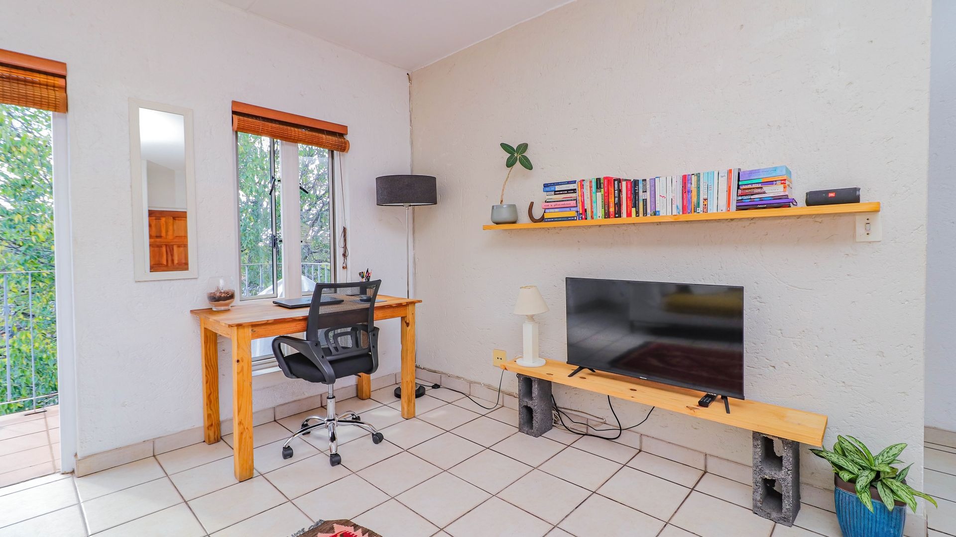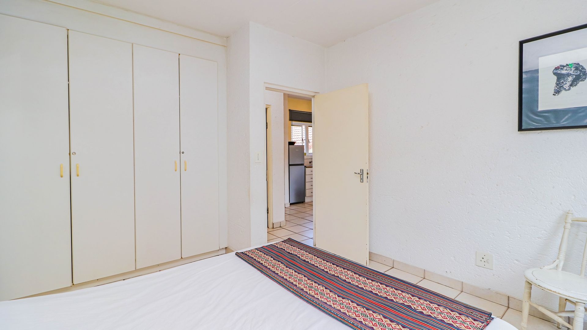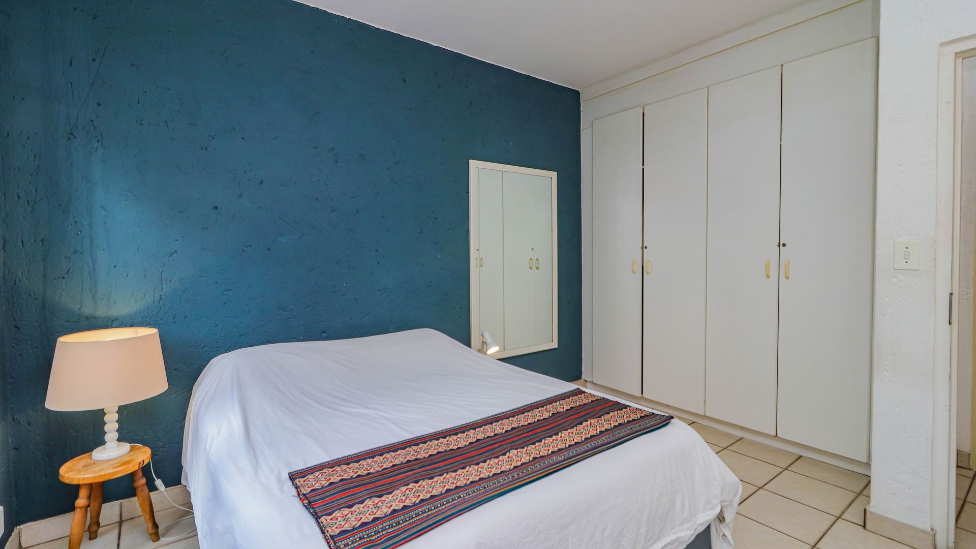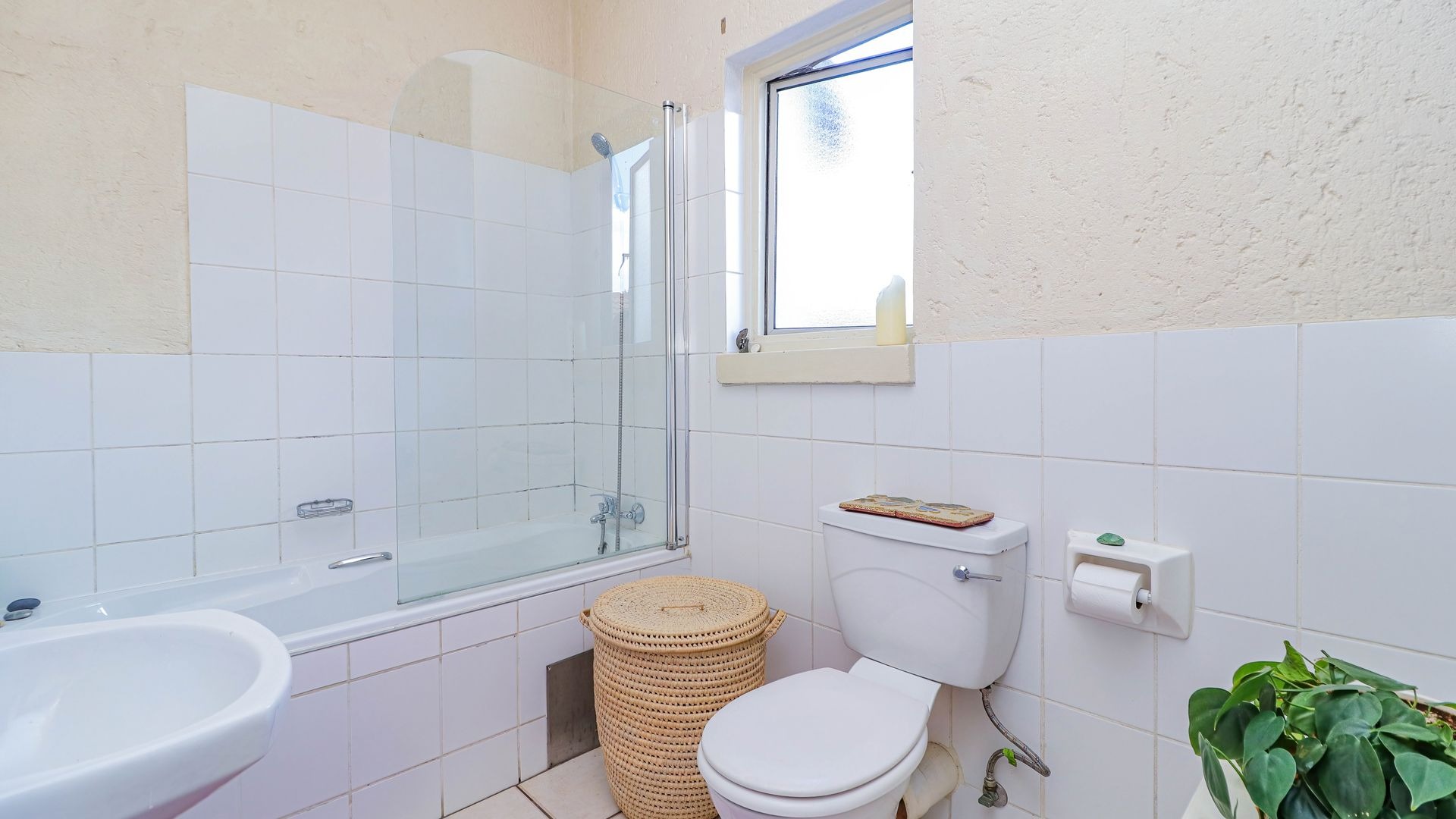 The bedroom is super spacious with ample cupboard space. There is a full bathroom: bath, shower, toilet with a space for a washing machine.