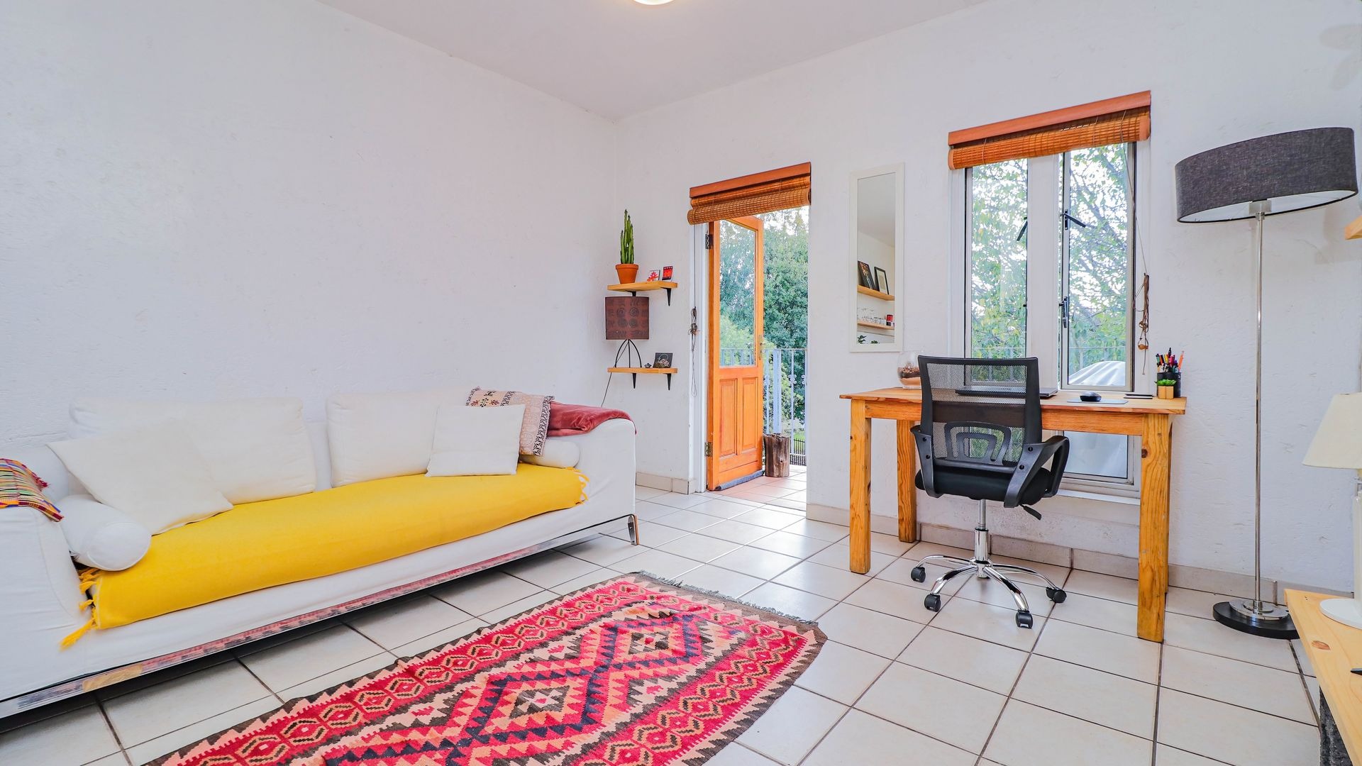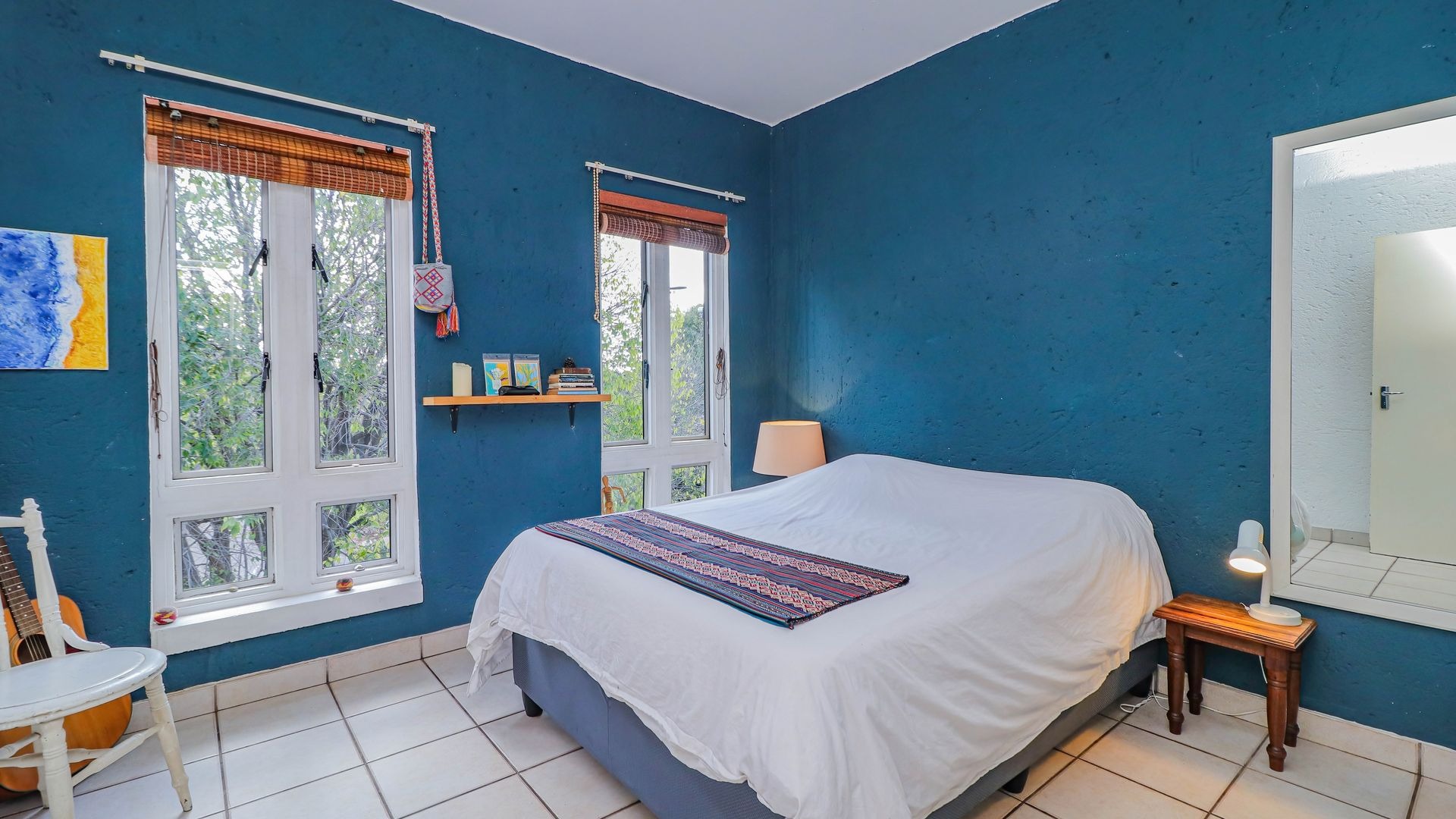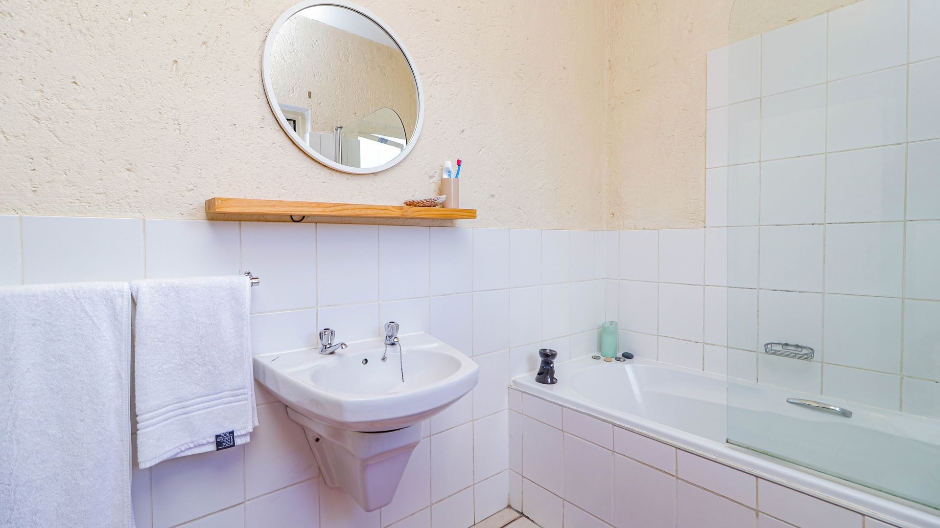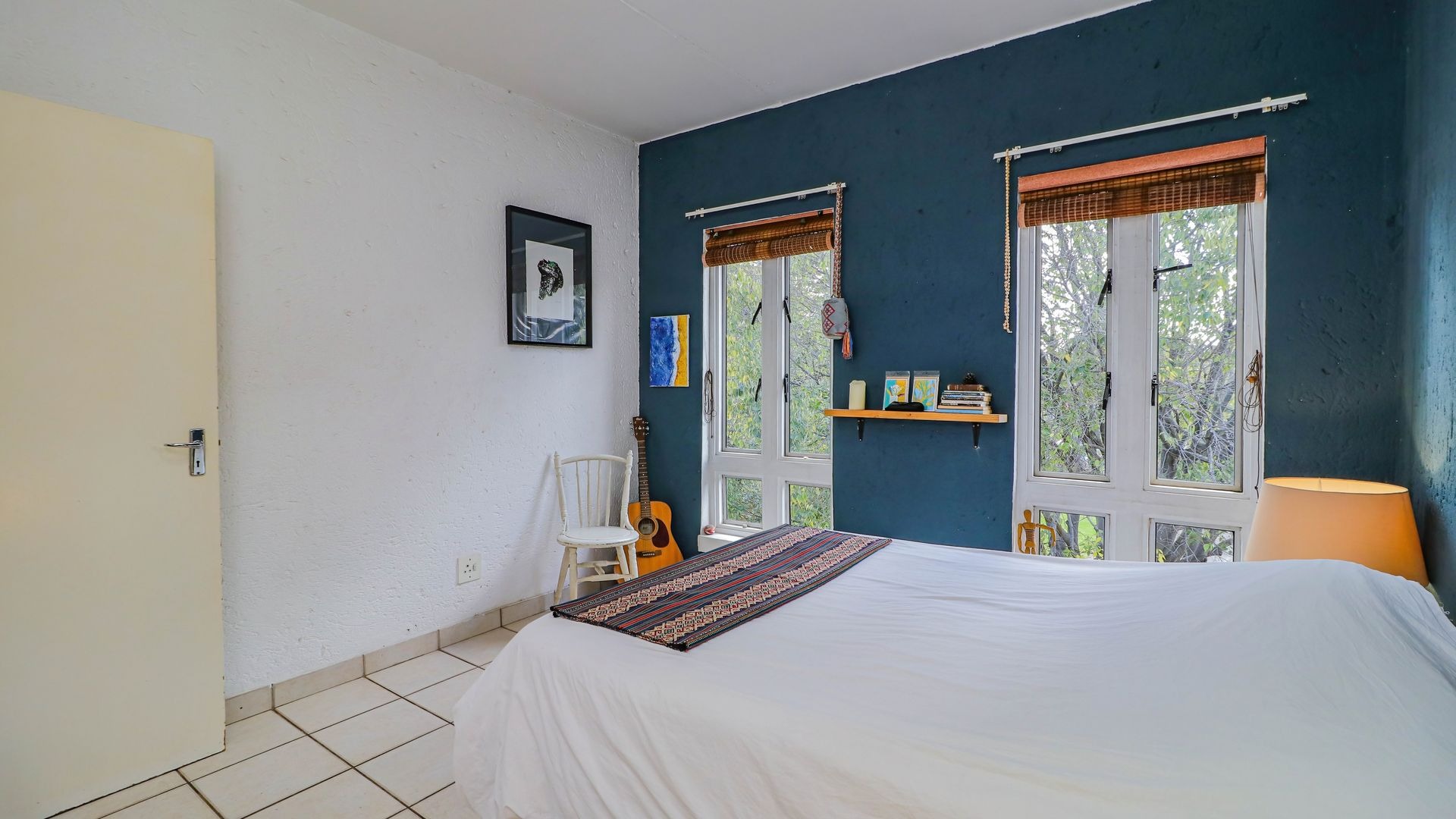 The bedroom is super spacious with ample cupboard space. There is a full bathroom: bath, shower, toilet with a space for a washing machine.