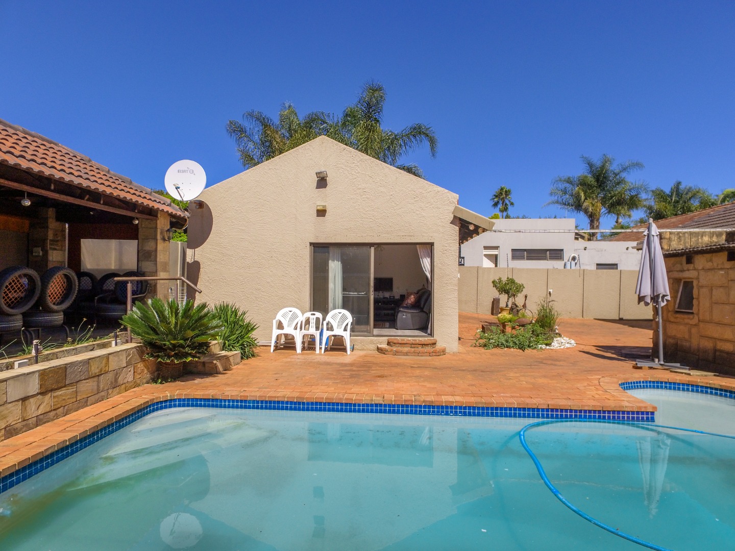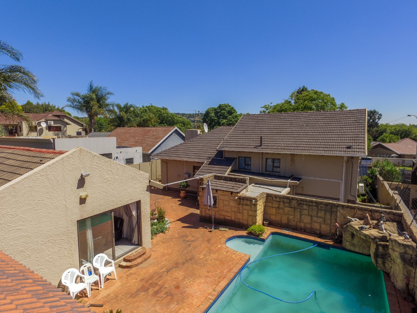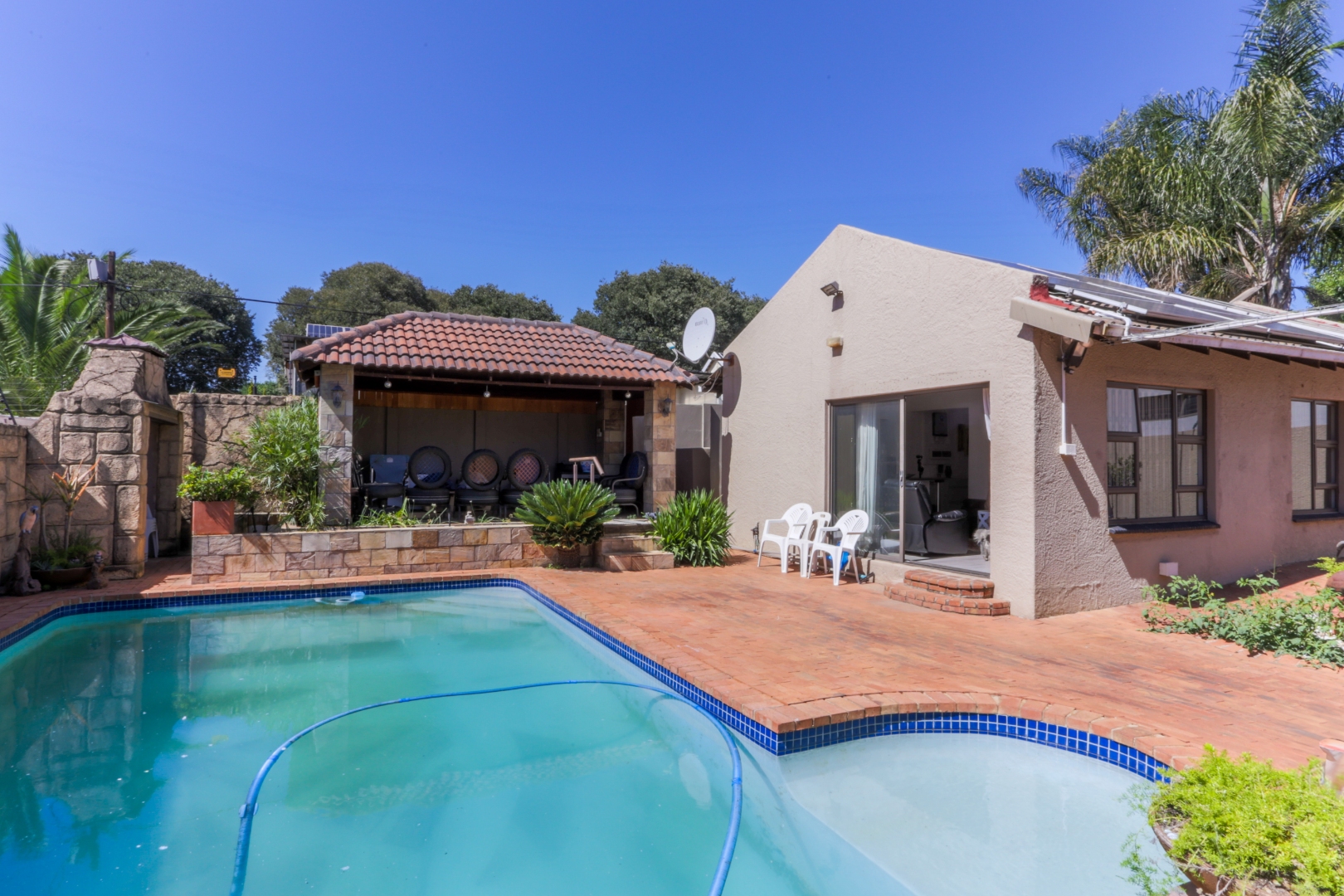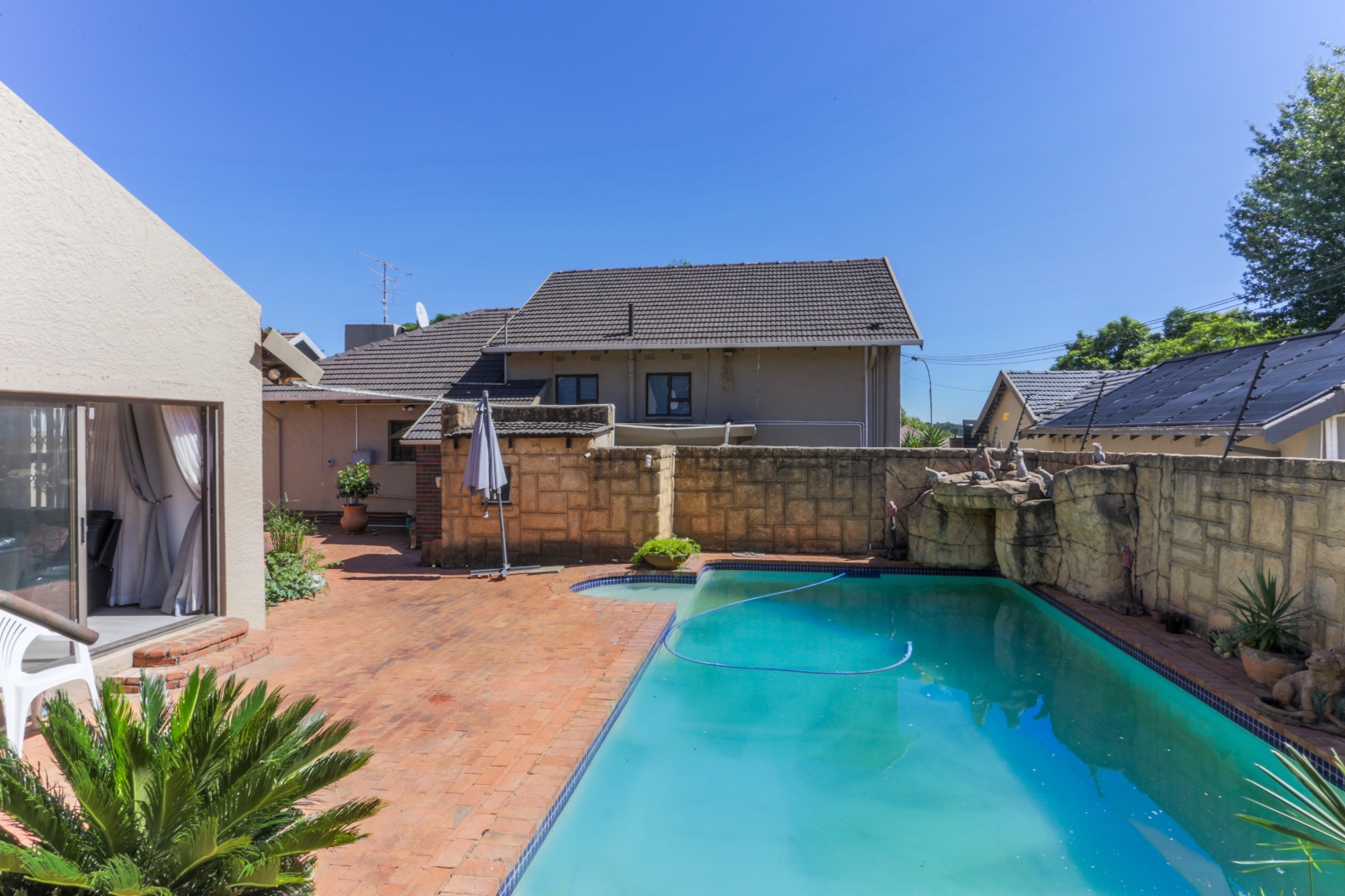 This neat and well-kept home offers a sun room overlooking the front lush garden, lounge with fireplace. The modern eat-in-kitchen is well appointed with ample counter space and has plenty of room for counter-top appliances. The bedroom wing on the upstairs level consists of 3 bedrooms with built in cupboards, main bedroom has an enclosed balcony. 2 Lovely bathrooms shower and a separate bath. In addition to the main house there is a delightful cottage with kitchen, open plan living area, 2 sunny bedrooms and a bathroom. This space can be used as rental income or for the extended family like granny or for adult children living at home. Adjacent to the cottage there is a covered entertainment area overlooking the sparkling pool.