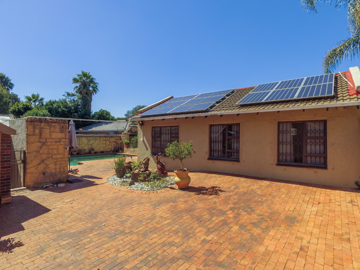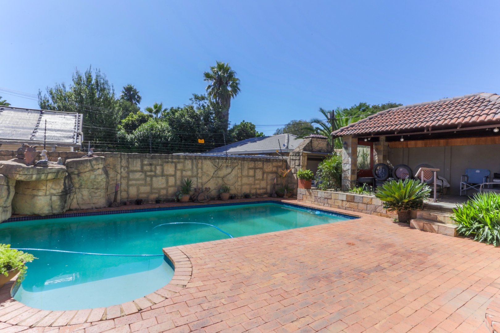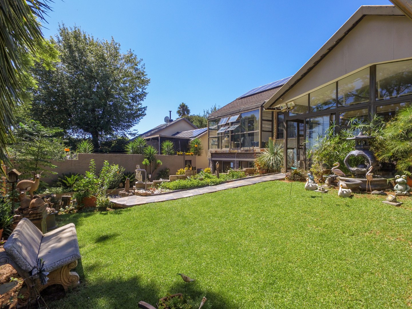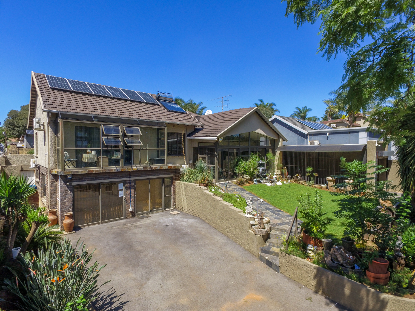 This neat and well-kept home offers a sun room overlooking the front lush garden, lounge with fireplace. The modern eat-in-kitchen is well appointed with ample counter space and has plenty of room for counter-top appliances. The bedroom wing on the upstairs level consists of 3 bedrooms with built in cupboards, main bedroom has an enclosed balcony. 2 Lovely bathrooms shower and a separate bath. In addition to the main house there is a delightful cottage with kitchen, open plan living area, 2 sunny bedrooms and a bathroom. This space can be used as rental income or for the extended family like granny or for adult children living at home. Adjacent to the cottage there is a covered entertainment area overlooking the sparkling pool.