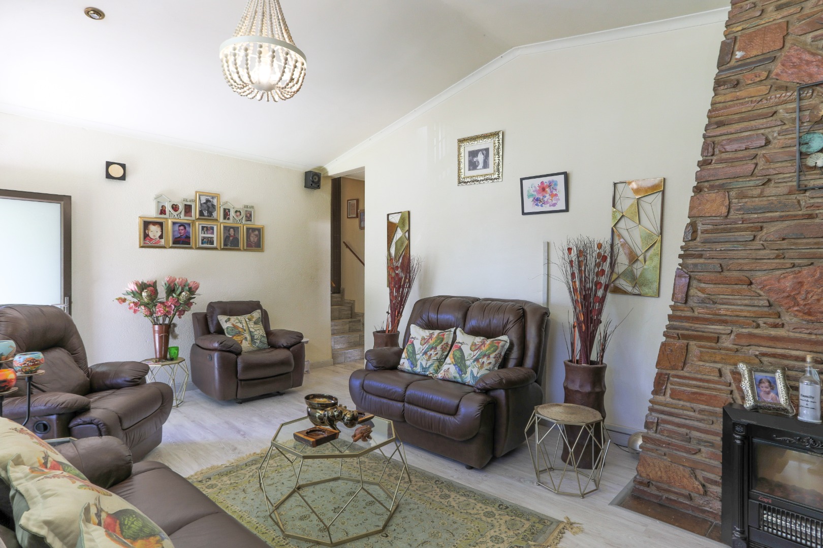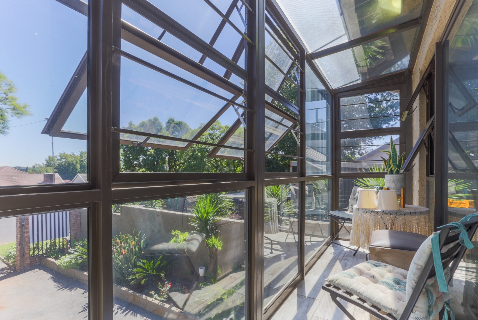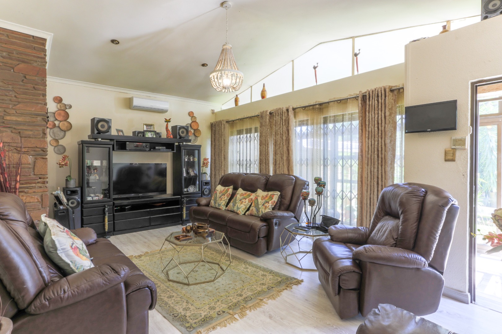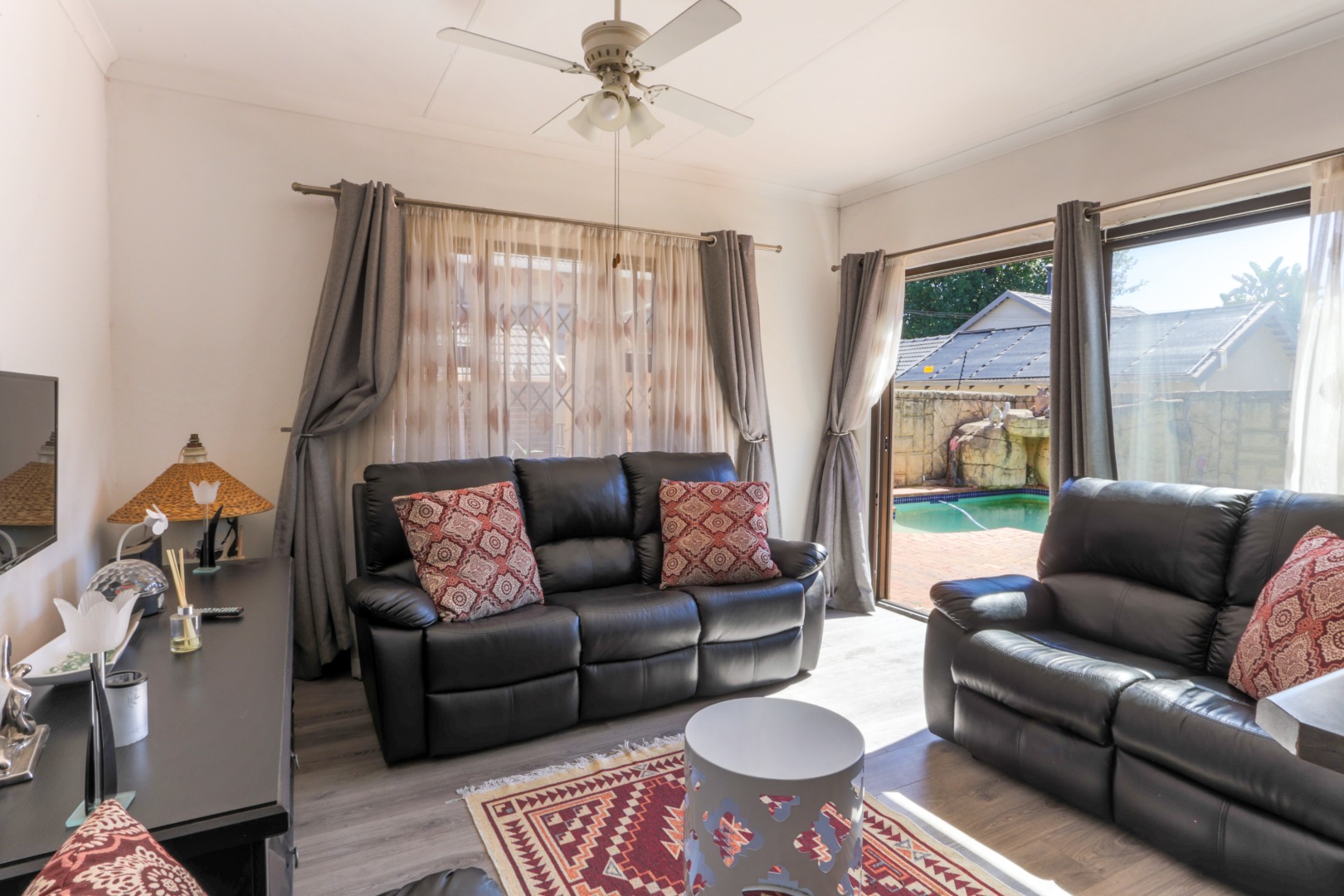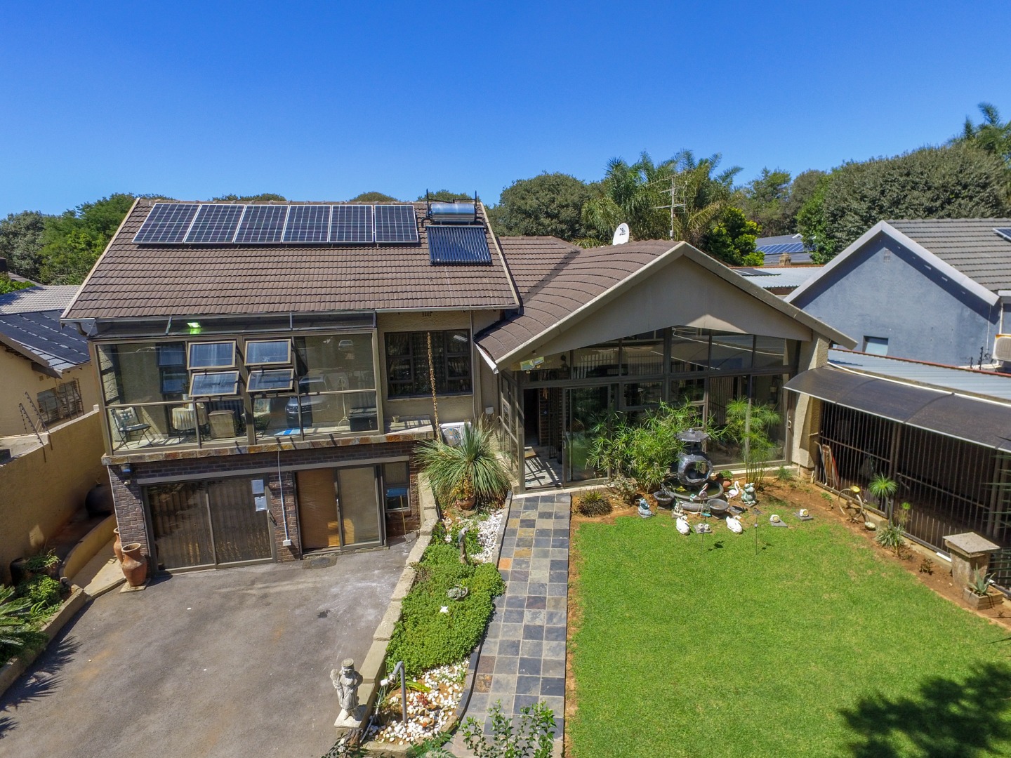 This neat and well-kept home offers a sun room overlooking the front lush garden, lounge with fireplace. The modern eat-in-kitchen is well appointed with ample counter space and has plenty of room for counter-top appliances. The bedroom wing on the upstairs level consists of 3 bedrooms with built in cupboards, main bedroom has an enclosed balcony. 2 Lovely bathrooms shower and a separate bath. In addition to the main house there is a delightful cottage with kitchen, open plan living area, 2 sunny bedrooms and a bathroom. This space can be used as rental income or for the extended family like granny or for adult children living at home. Adjacent to the cottage there is a covered entertainment area overlooking the sparkling pool.