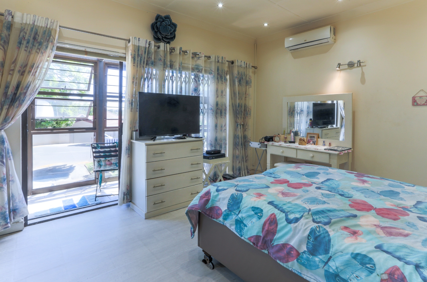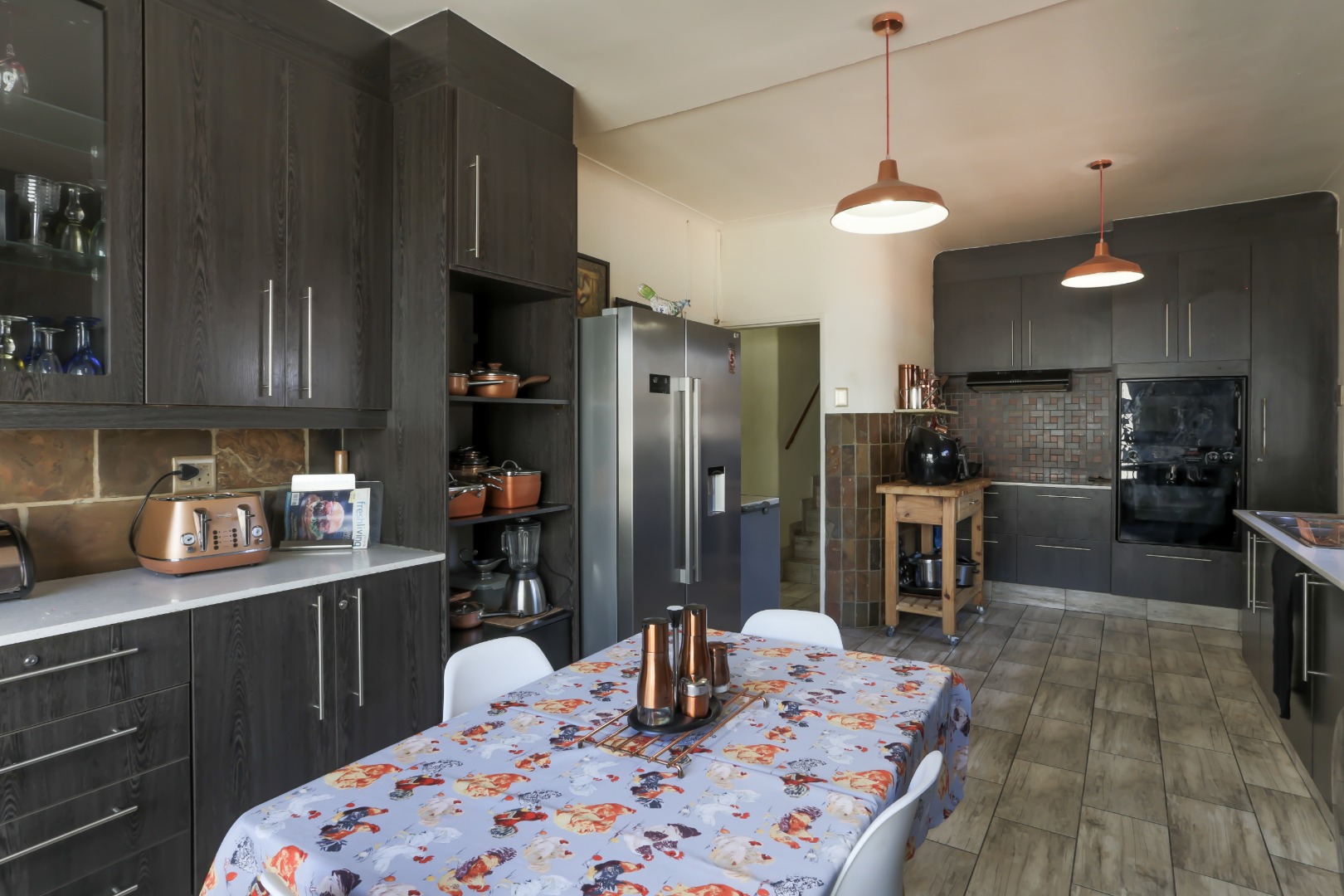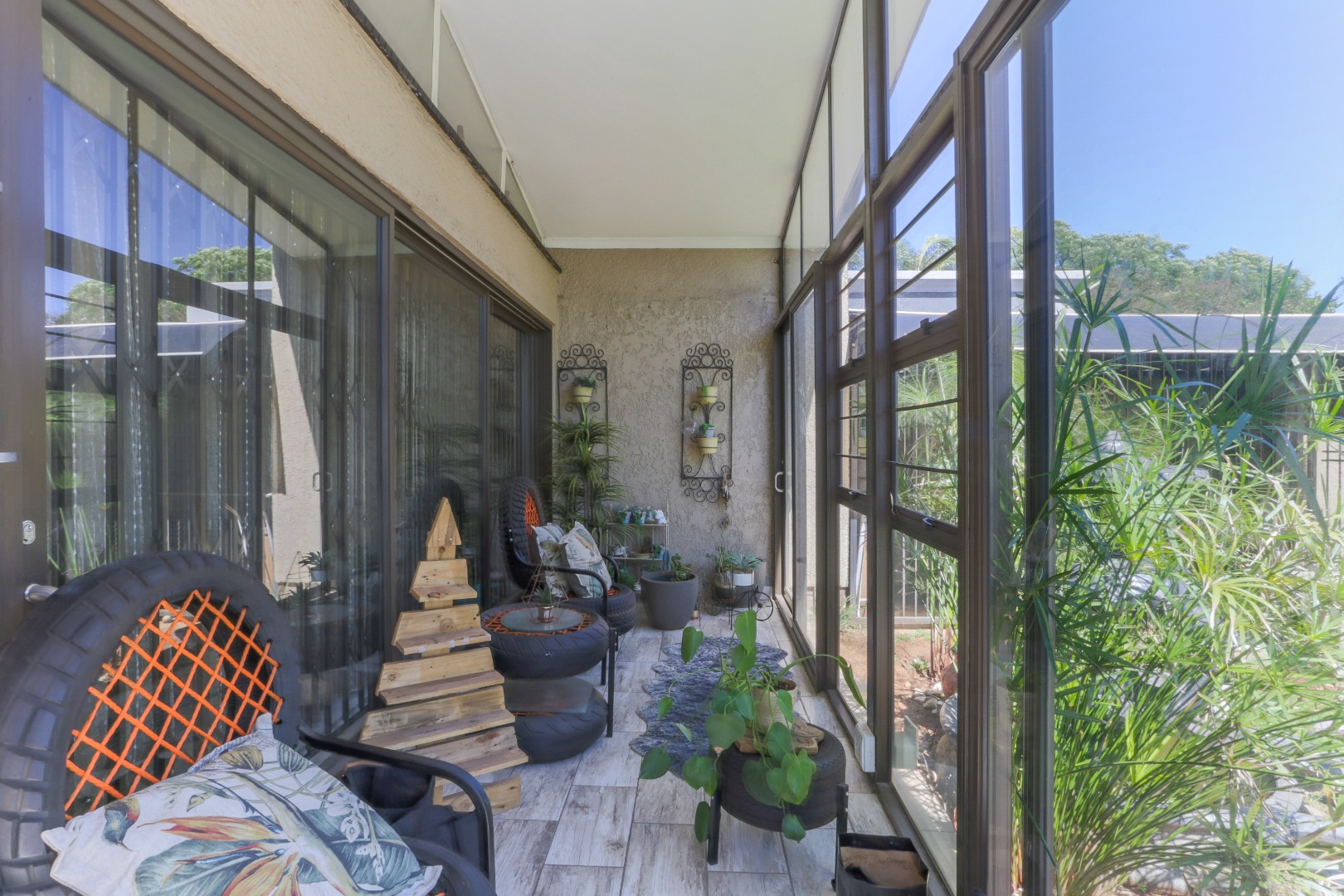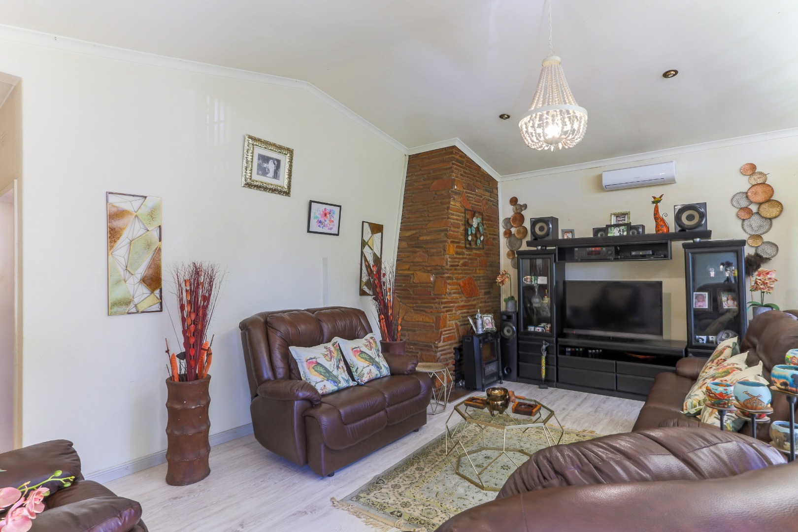 This neat and well-kept home offers a sun room overlooking the front lush garden, lounge with fireplace. The modern eat-in-kitchen is well appointed with ample counter space and has plenty of room for counter-top appliances. The bedroom wing on the upstairs level consists of 3 bedrooms with built in cupboards, main bedroom has an enclosed balcony. 2 Lovely bathrooms shower and a separate bath. In addition to the main house there is a delightful cottage with kitchen, open plan living area, 2 sunny bedrooms and a bathroom. This space can be used as rental income or for the extended family like granny or for adult children living at home. Adjacent to the cottage there is a covered entertainment area overlooking the sparkling pool.