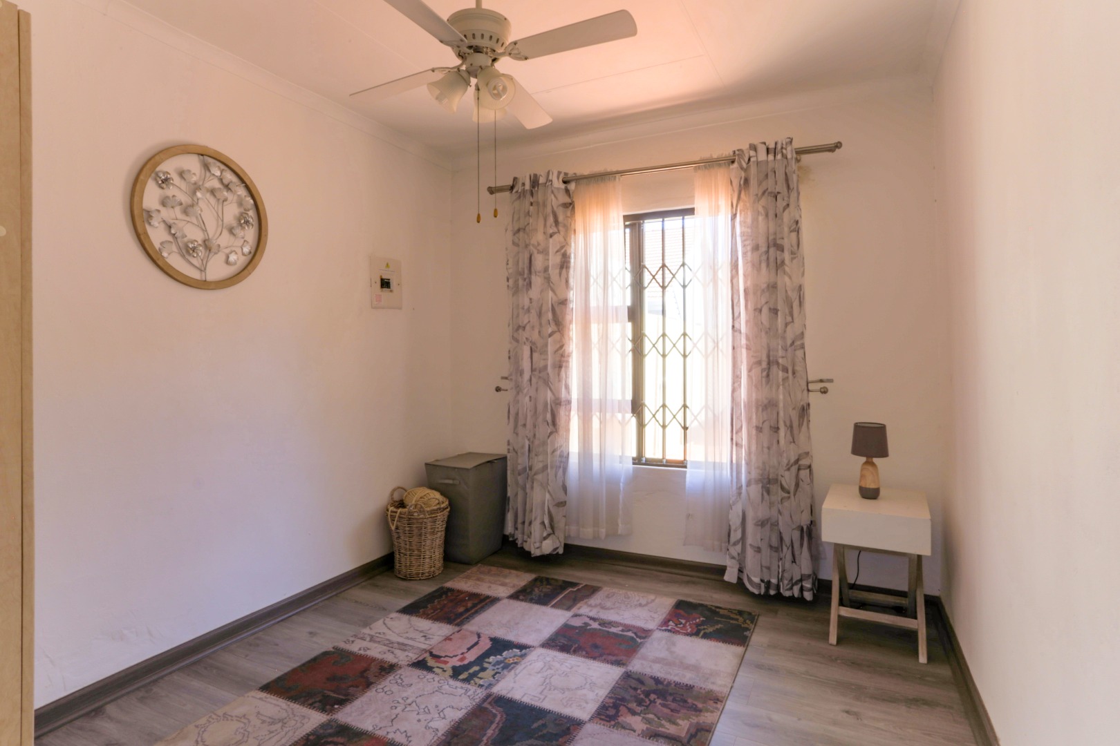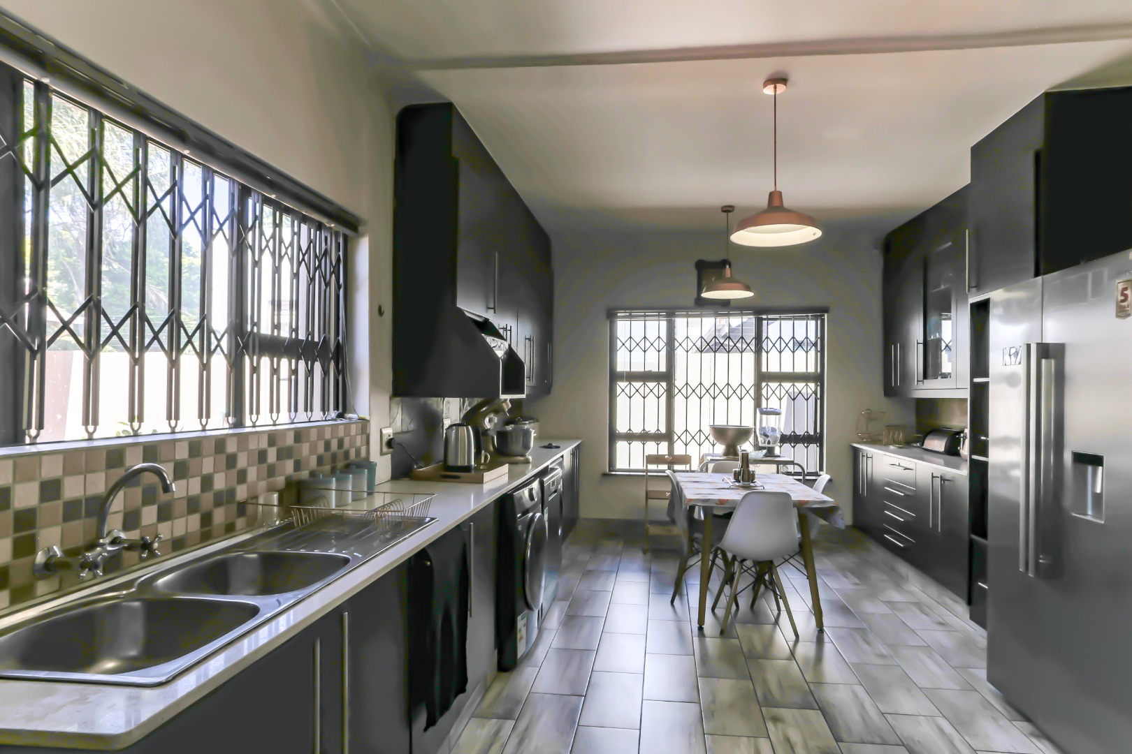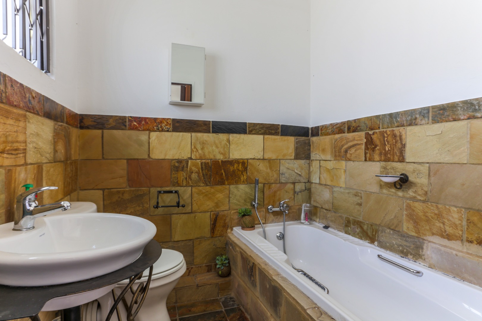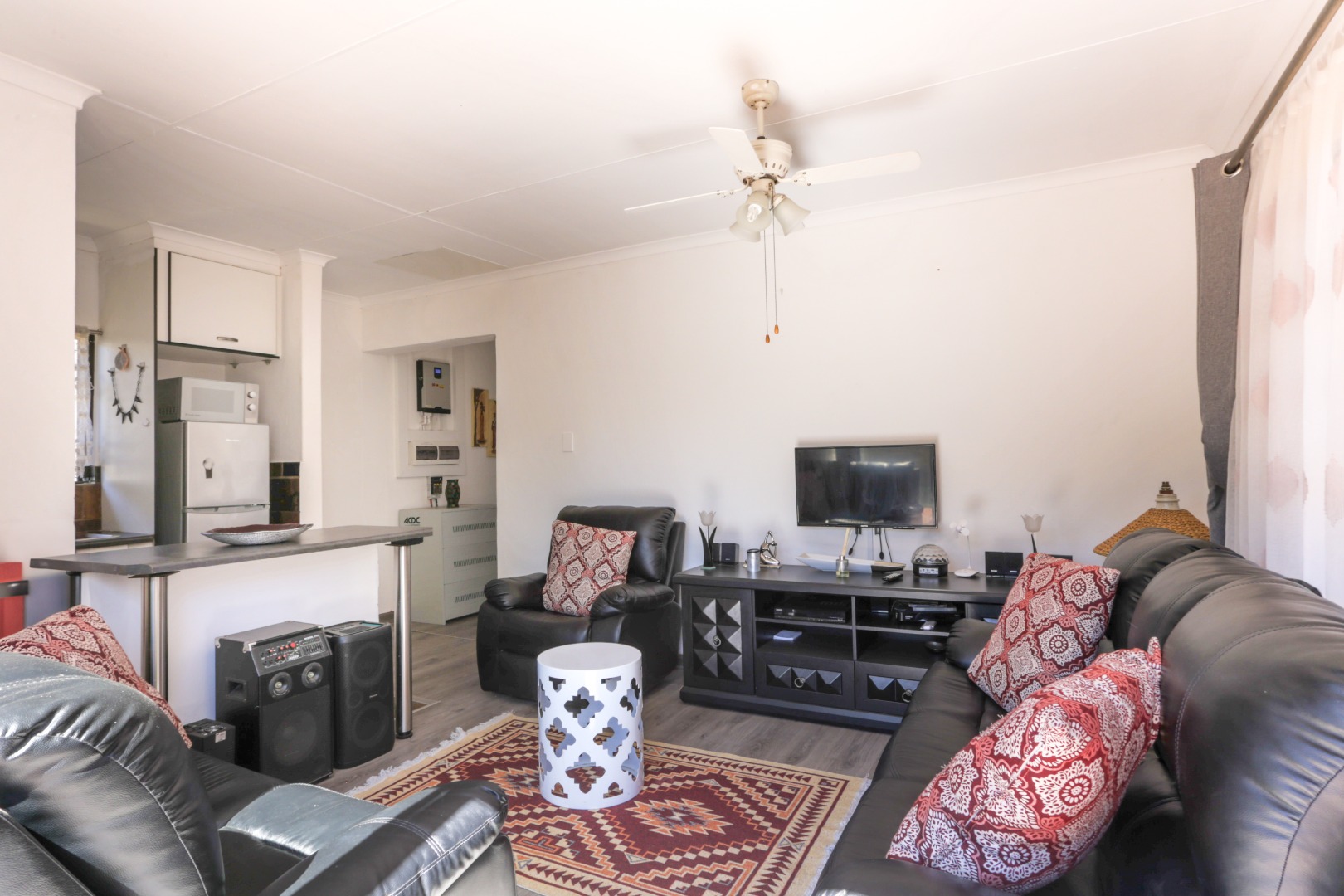 This neat and well-kept home offers a sun room overlooking the front lush garden, lounge with fireplace. The modern eat-in-kitchen is well appointed with ample counter space and has plenty of room for counter-top appliances. The bedroom wing on the upstairs level consists of 3 bedrooms with built in cupboards, main bedroom has an enclosed balcony. 2 Lovely bathrooms shower and a separate bath. In addition to the main house there is a delightful cottage with kitchen, open plan living area, 2 sunny bedrooms and a bathroom. This space can be used as rental income or for the extended family like granny or for adult children living at home. Adjacent to the cottage there is a covered entertainment area overlooking the sparkling pool.