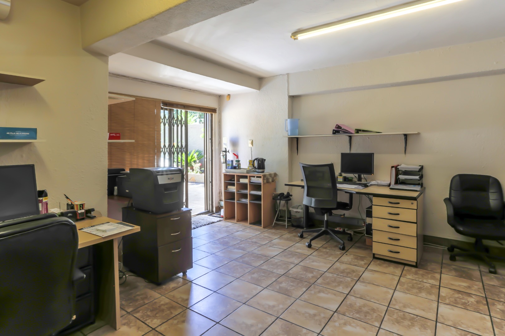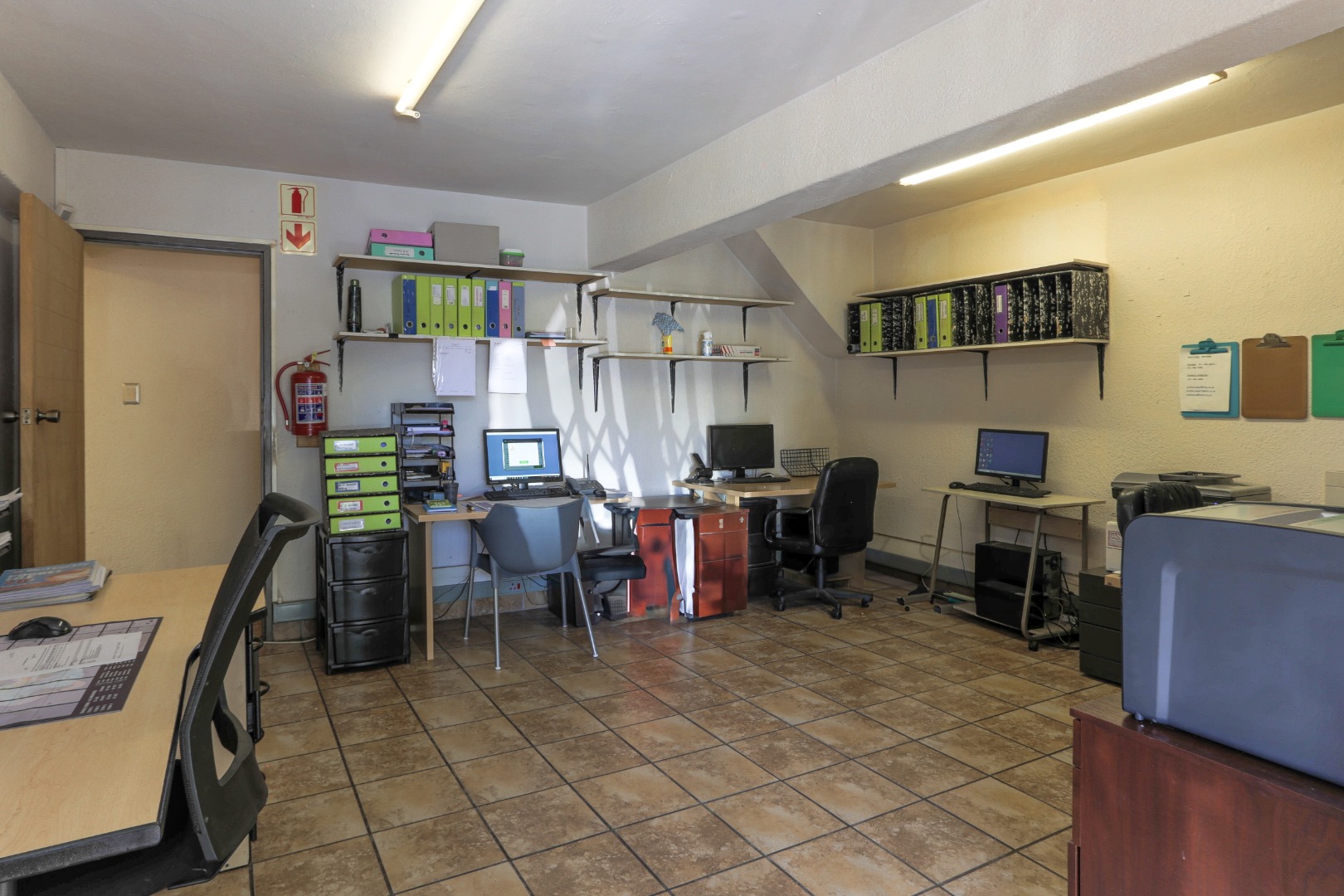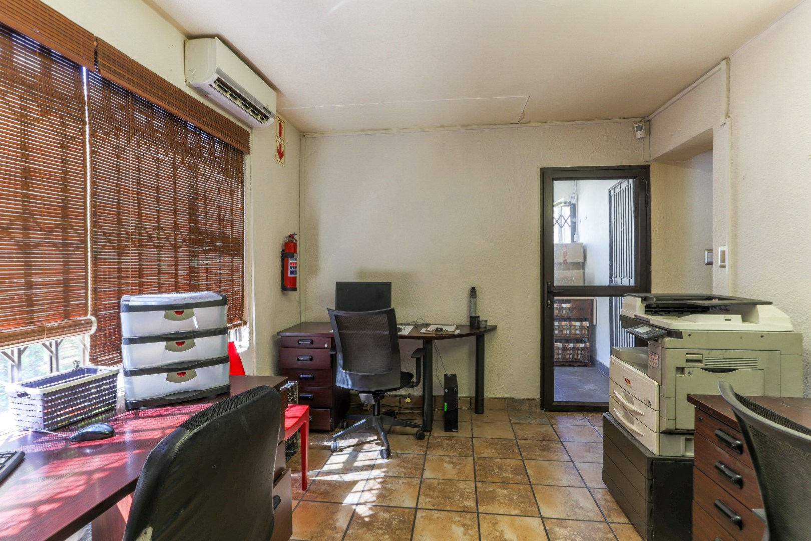 The office on the downstairs level has 2 good size rooms, a separate server room, a storage area and a kitchenette.