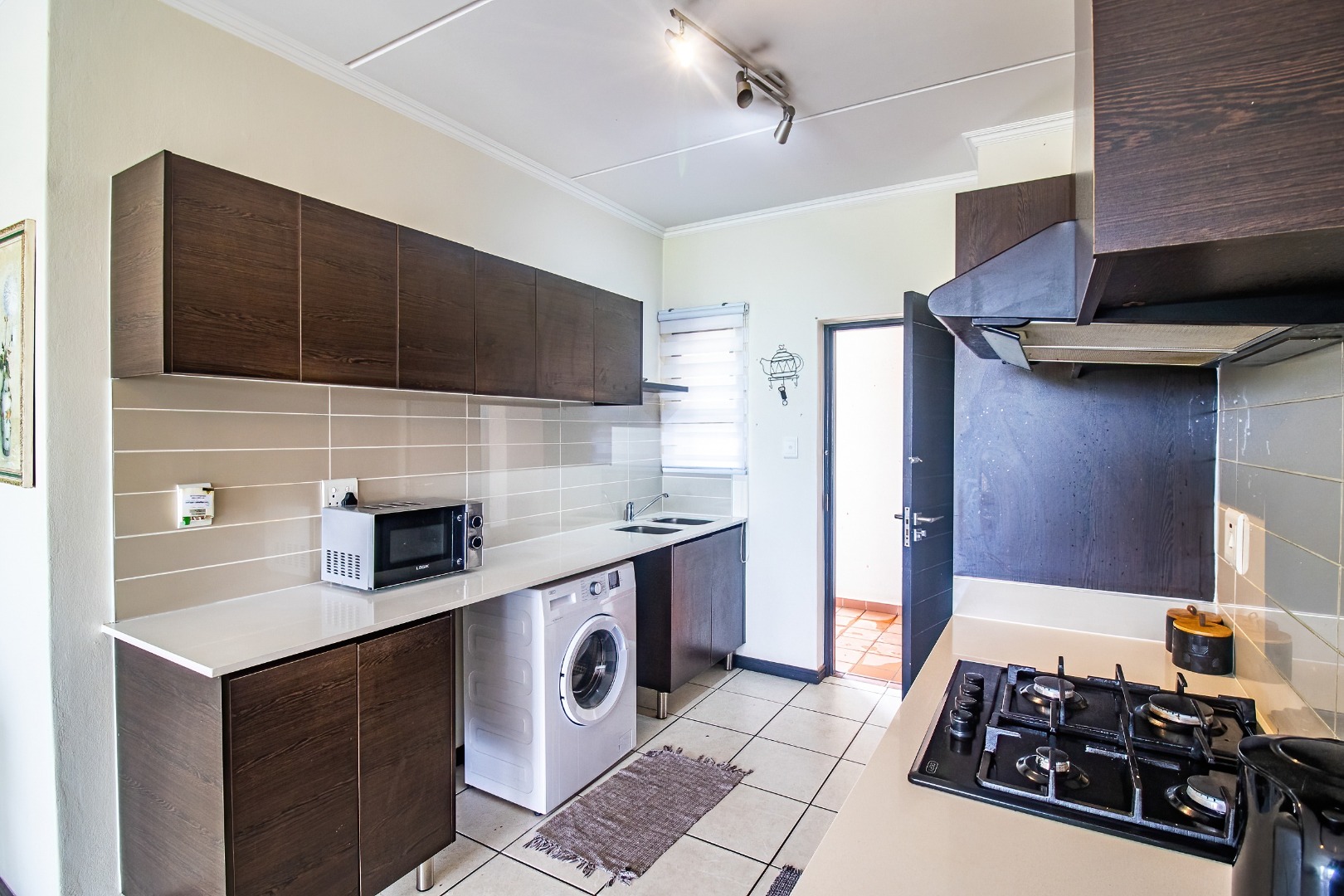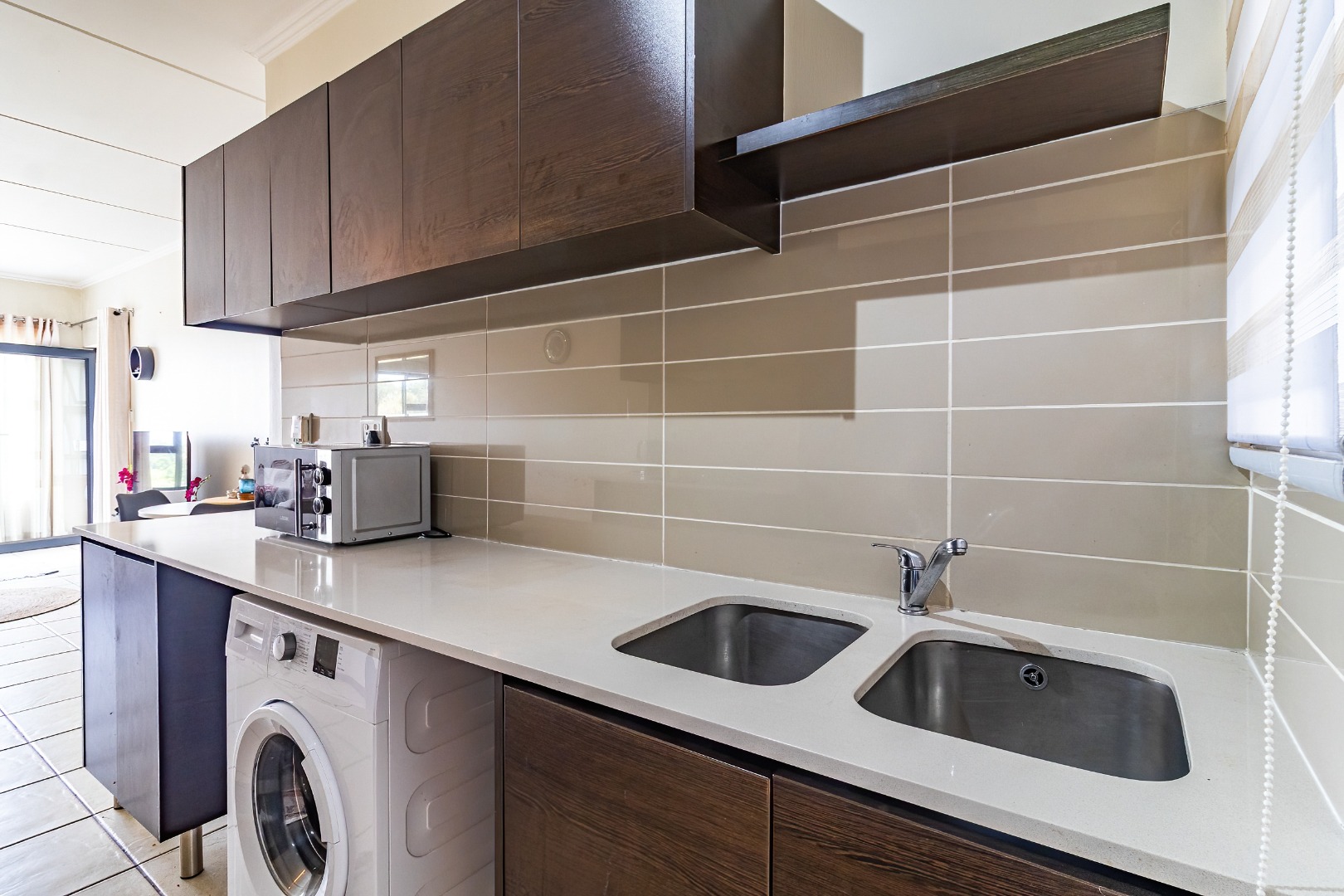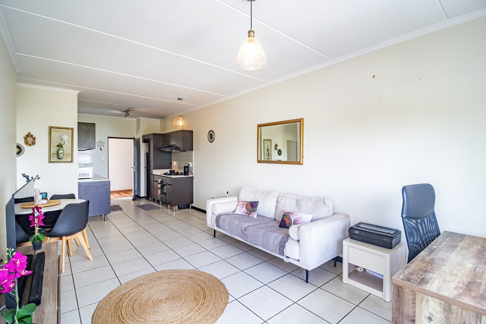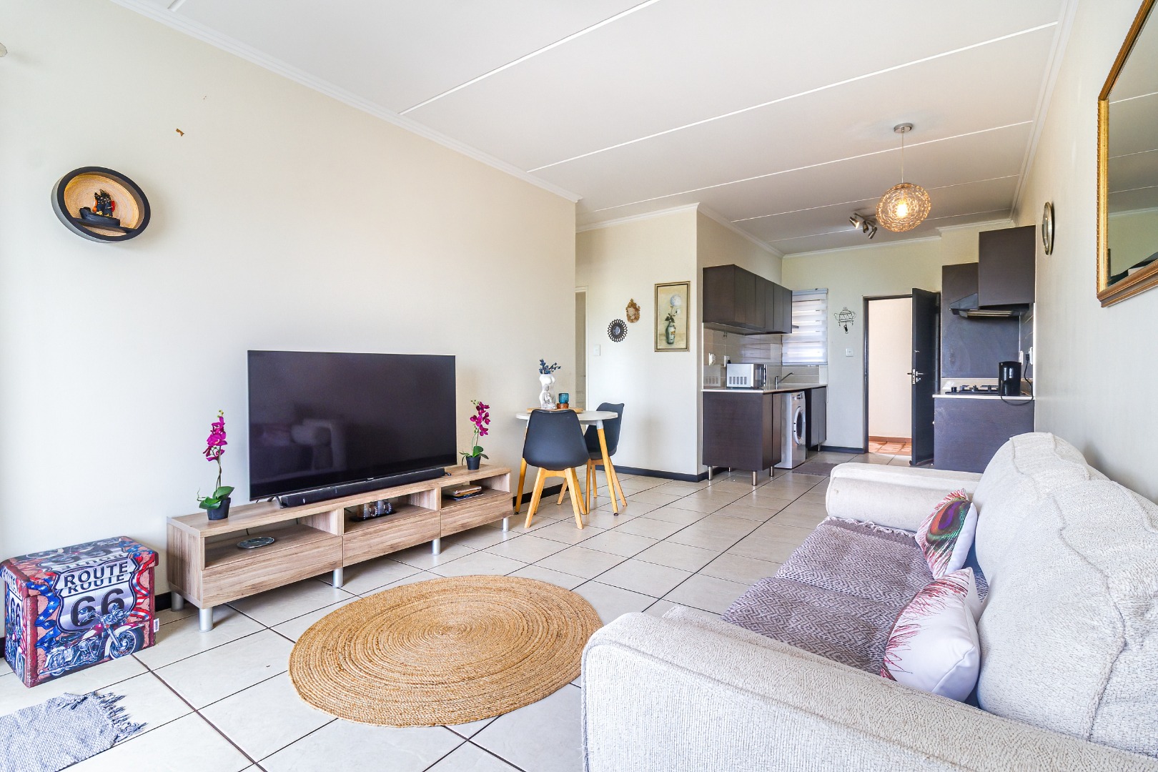 Step into the open-plan lounge and dining area, seamlessly flowing into the modern kitchen. The kitchen is well appointed with built-in cupboards, fits a full stove/oven, space for a fridge and washing/dryer stack, and features a practical layout for everyday living and entertaining.